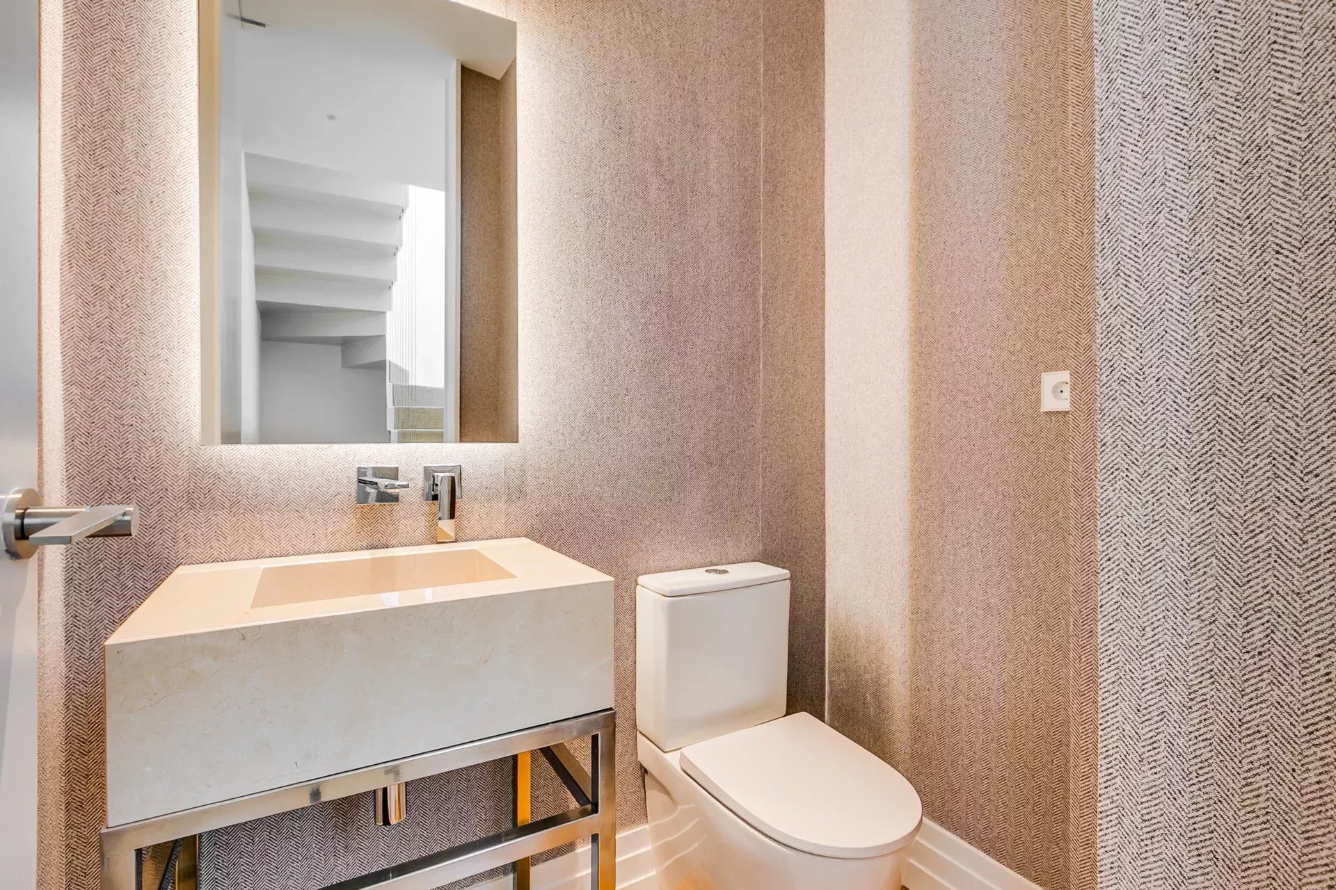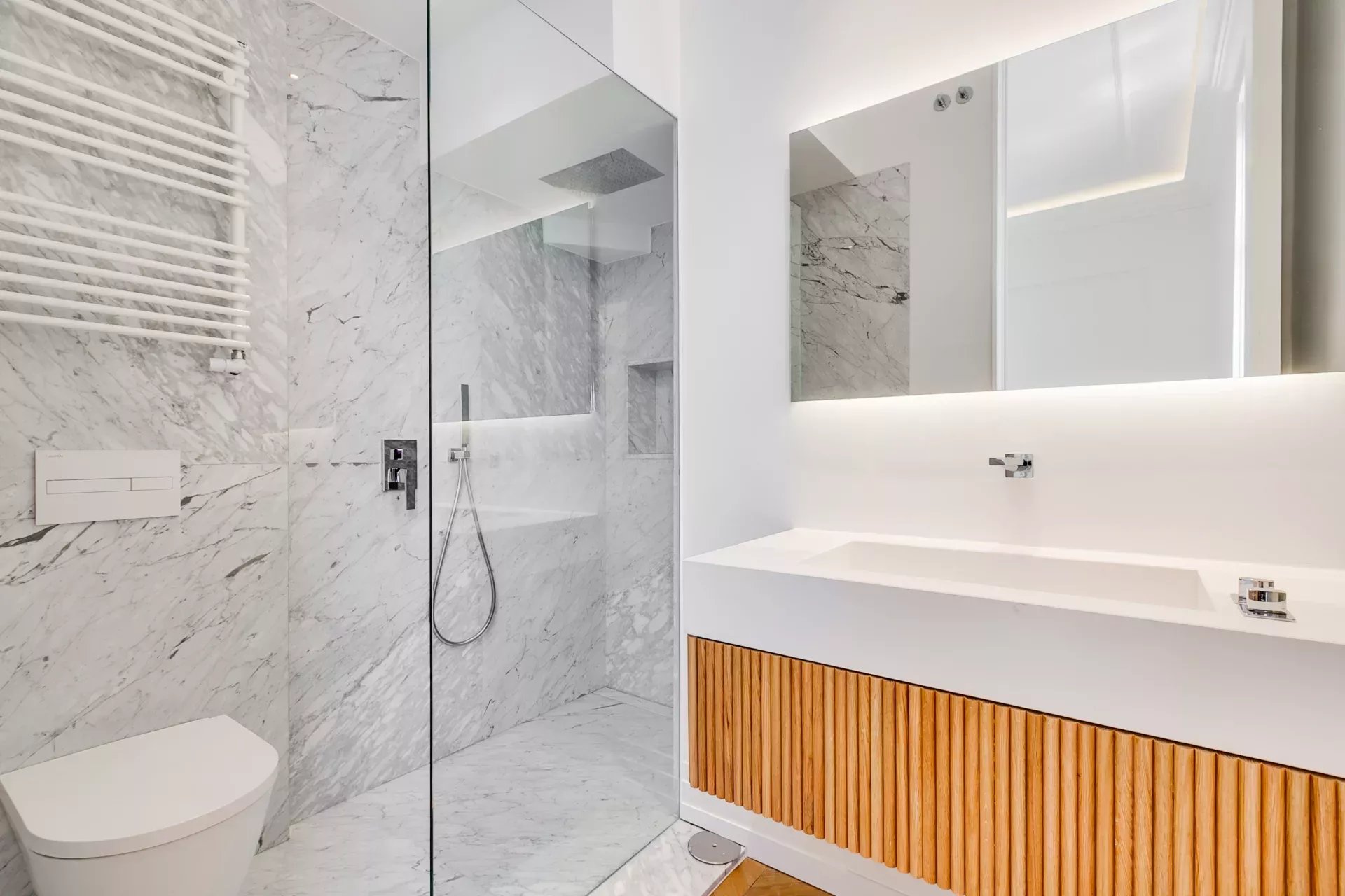The main level is an open space that radiates both authenticity and sophistication. Solid oak flooring, original exposed beams, and classical moldings evoke the historical character of the palace, infusing the space with warmth and distinction. This floor includes a double living room, a spacious dining area, and an integrated designer kitchen. Amenities are seamlessly incorporated, such as a guest toilet, a fully equipped laundry area, and an elegant wine cellar—details that reflect the refined nature of this residence.