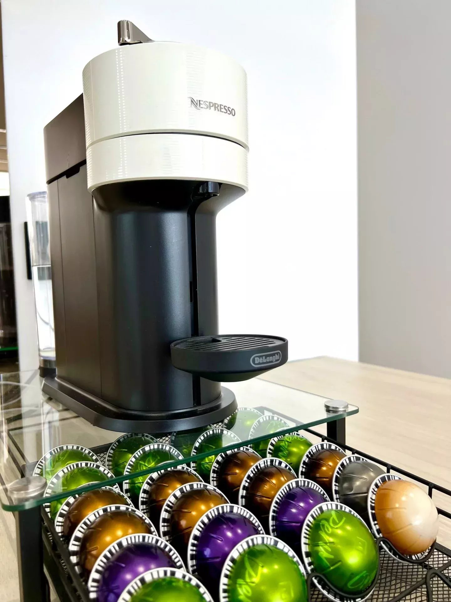 The fully equipped kitchen features state-of-the-art appliances, offering a practical and sophisticated environment.
