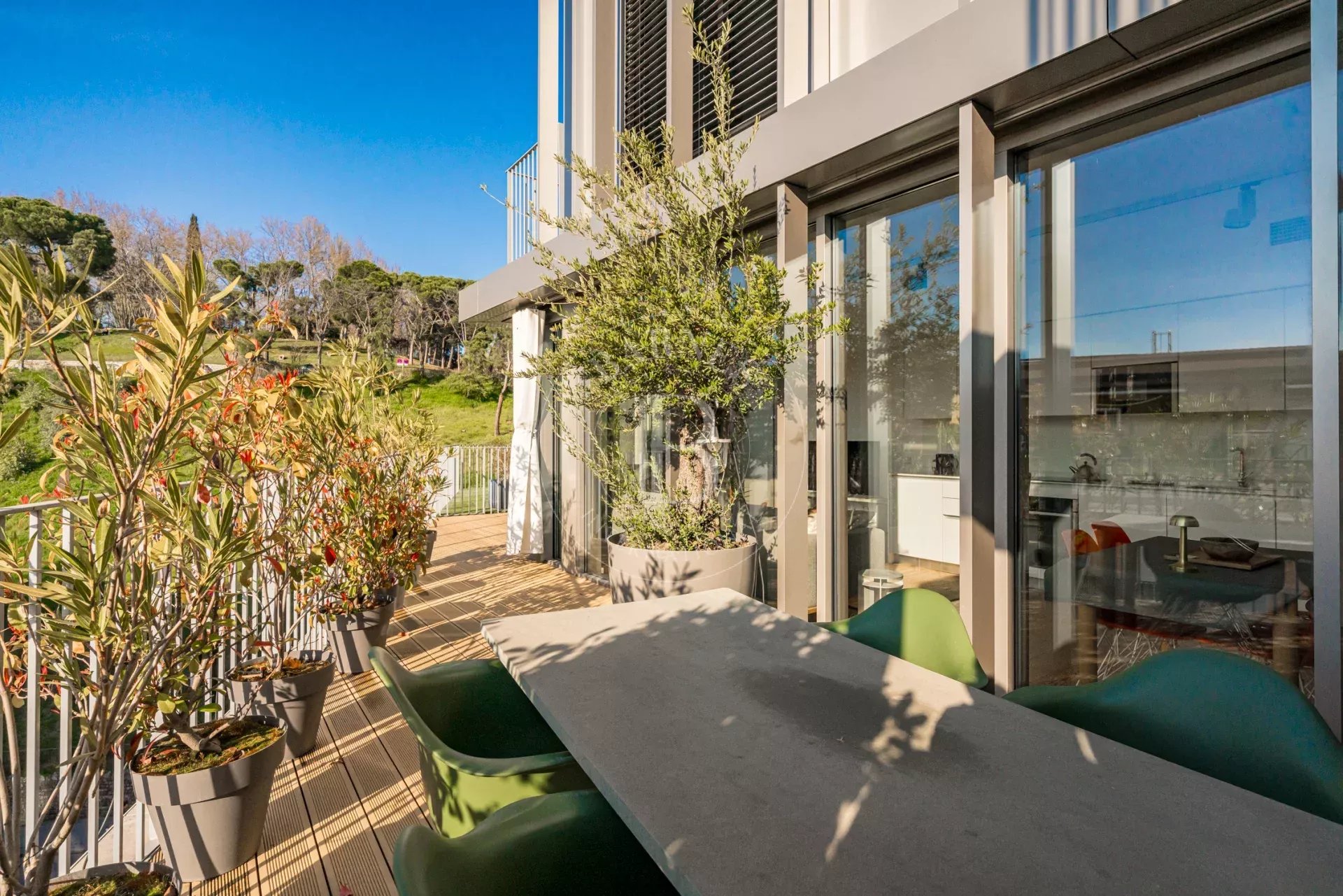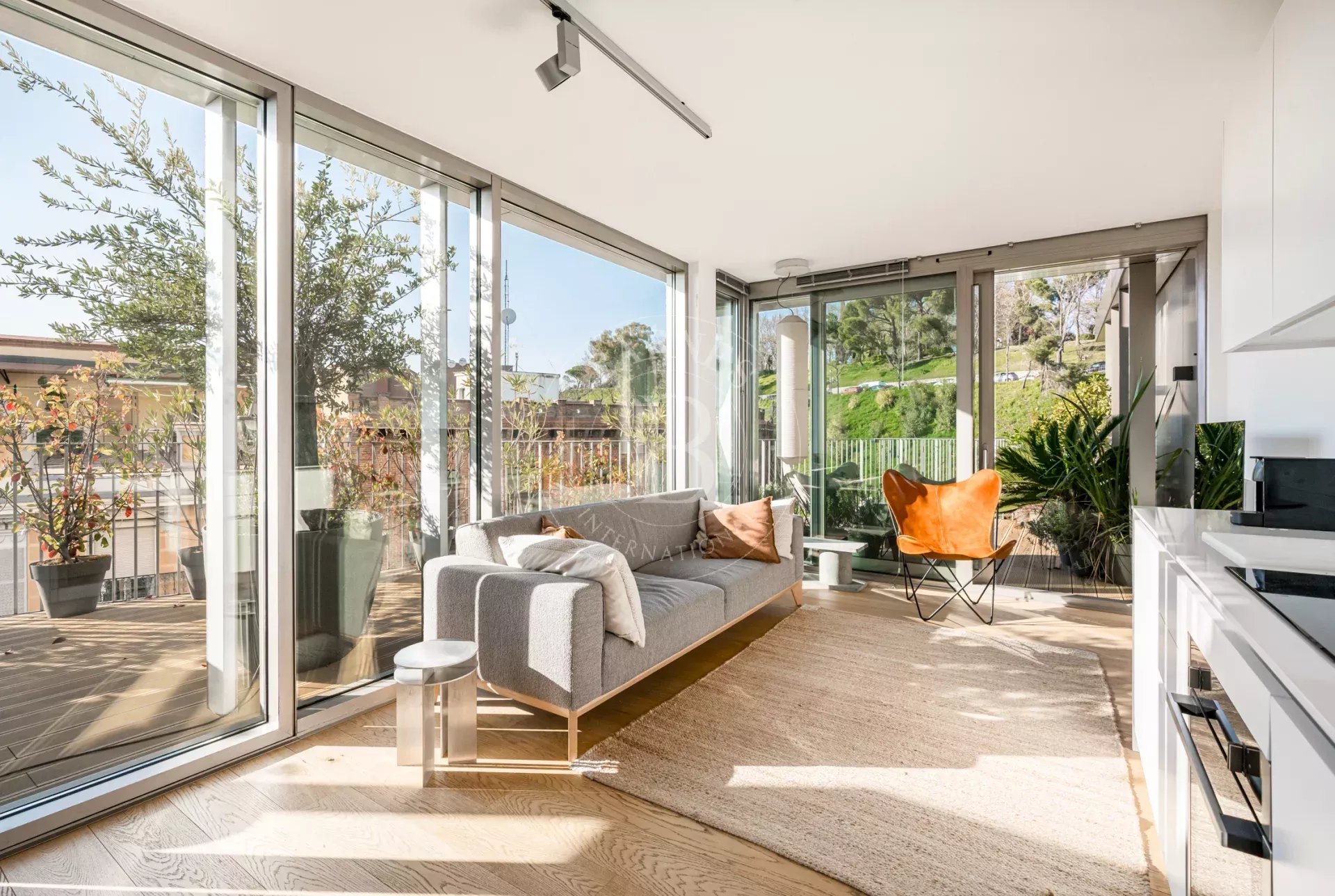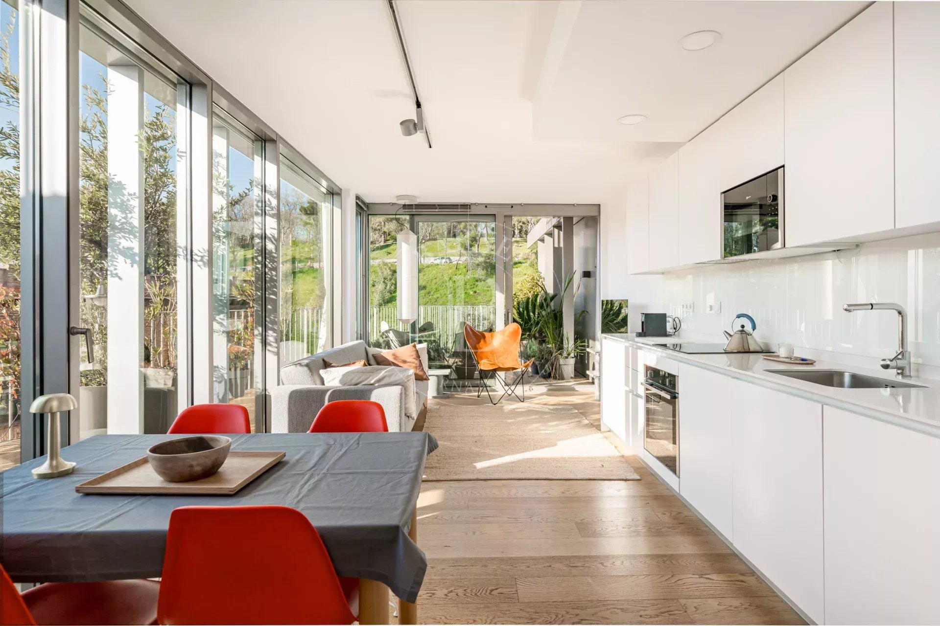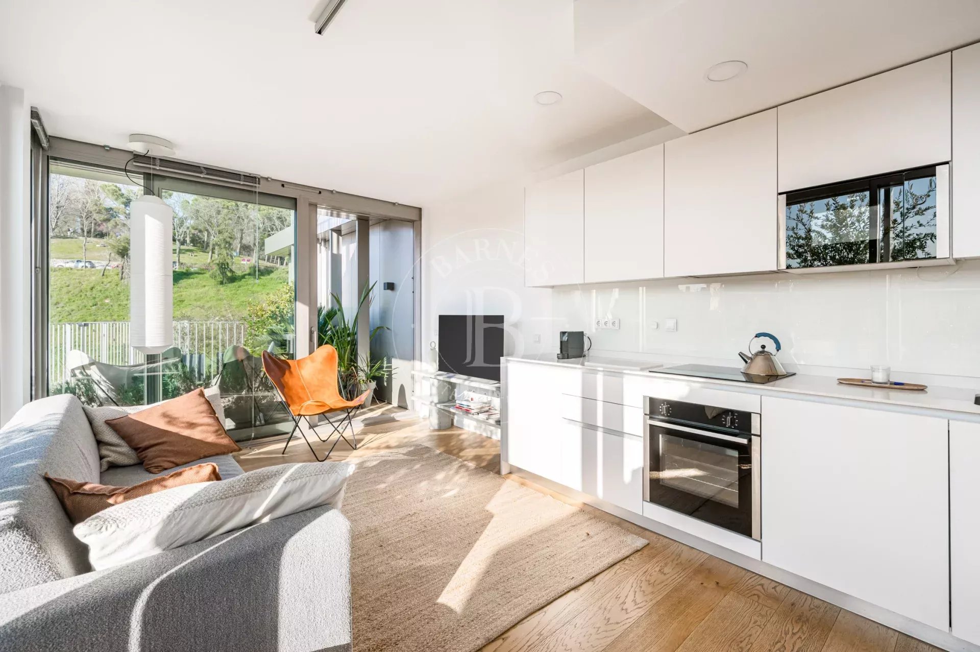 La propiedad cuenta con un luminoso salón en esquina con grandes ventanales de suelo a techo a lo largo de toda la fachada, lo que permite disfrutar de una sensación de amplitud excepcional y de una conexión directa con el entorno natural. La cocina se integra de forma elegante en el espacio de estar y está equipada con electrodomésticos de alta gama. Dispone de dos dormitorios exteriores, siendo el principal en suite con vestidor y armarios empotrados, así como dos baños completos con plato de ducha y excelentes calidades.