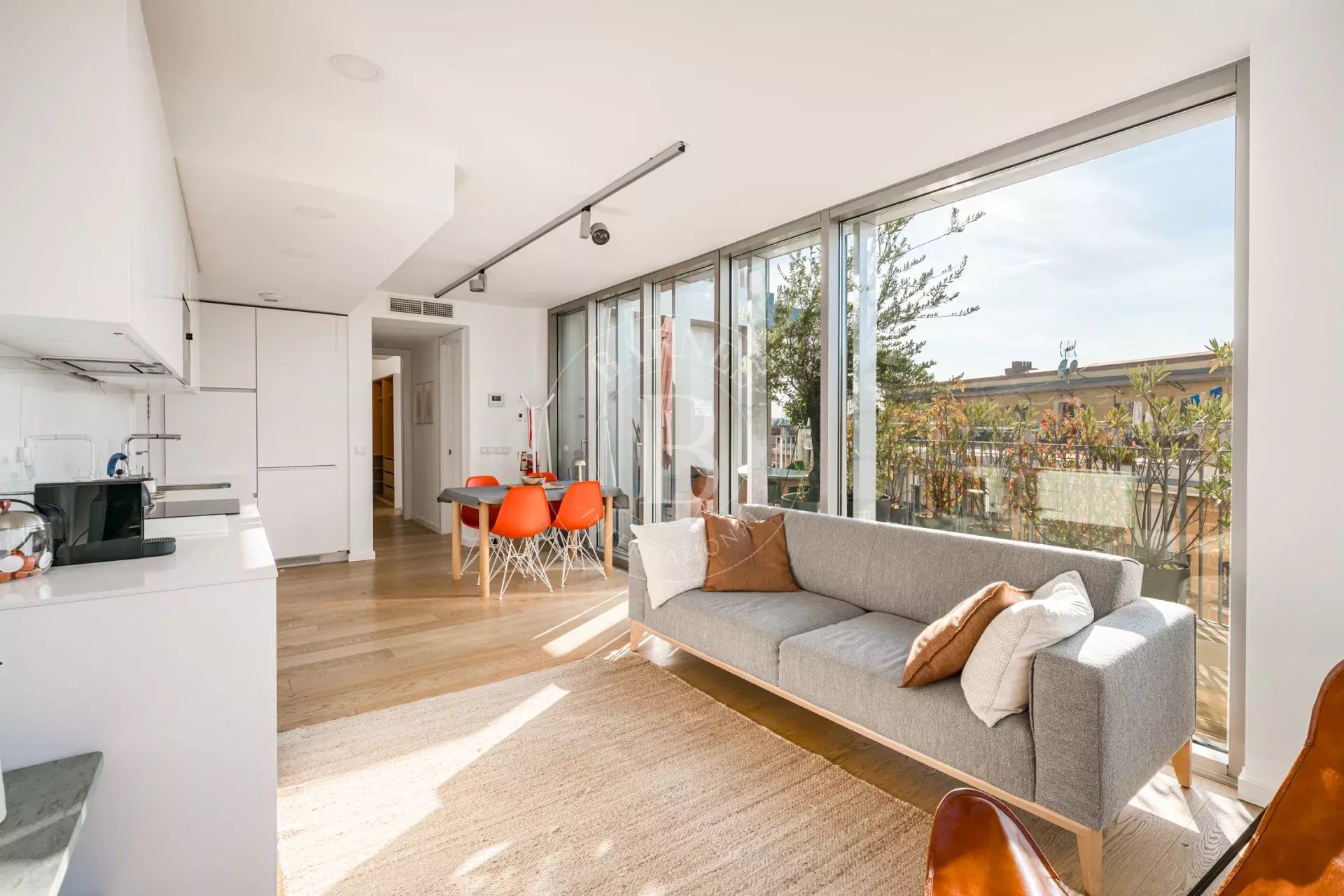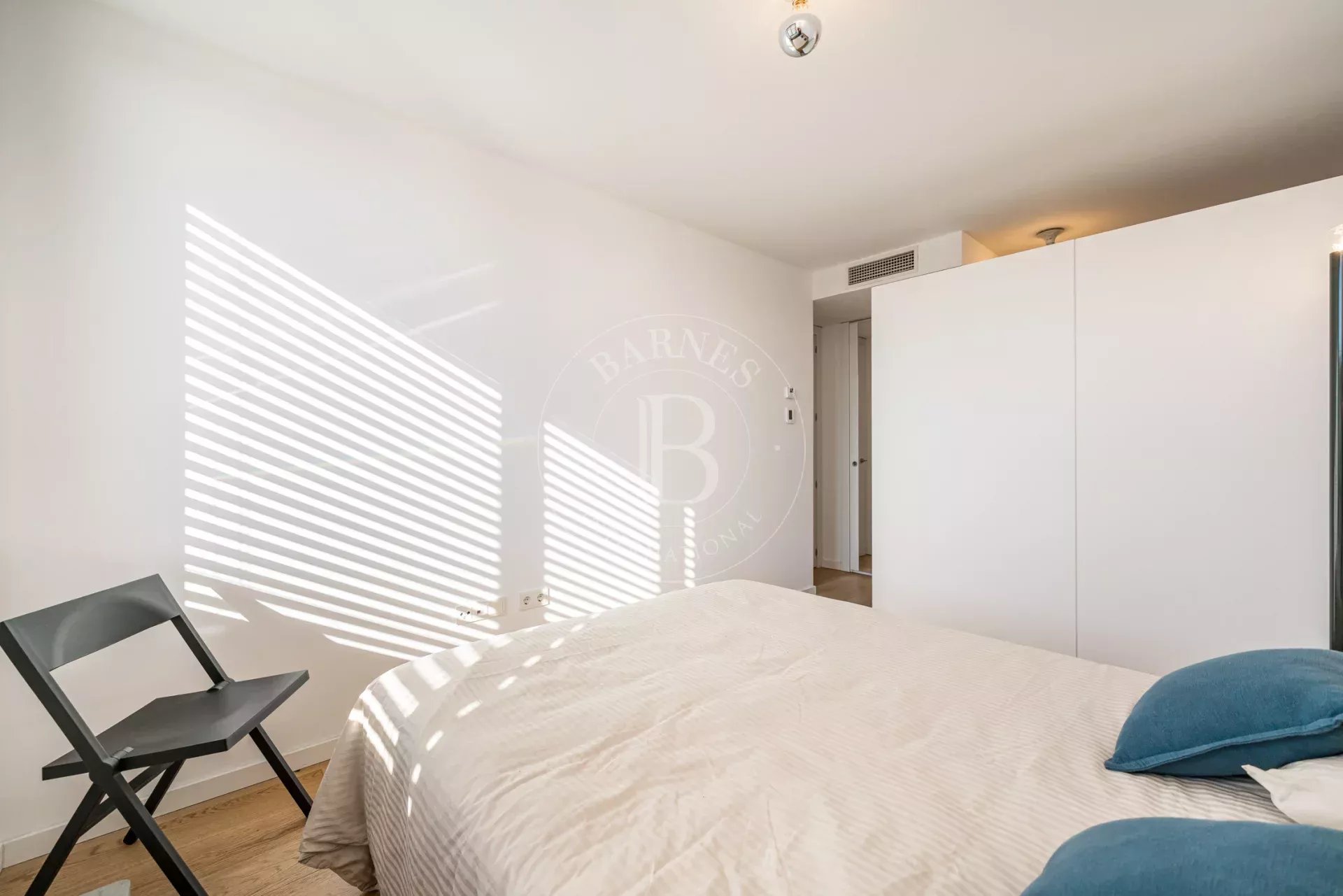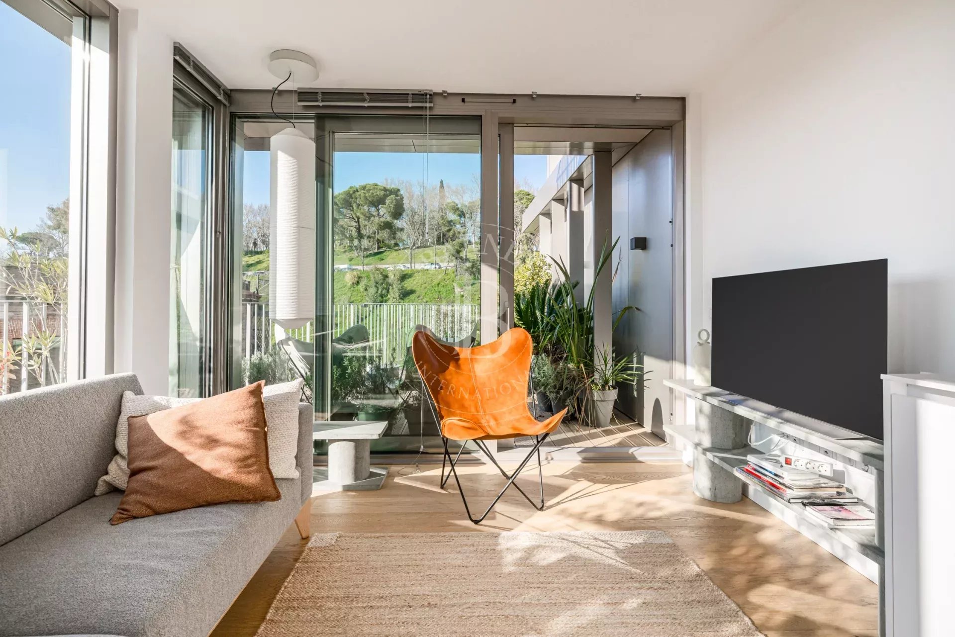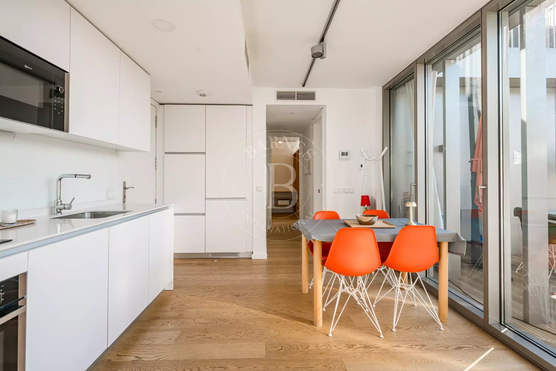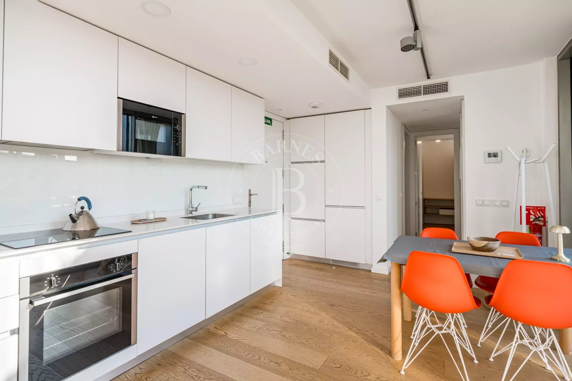 La propiedad cuenta con un luminoso salón en esquina con grandes ventanales de suelo a techo a lo largo de toda la fachada, lo que permite disfrutar de una sensación de amplitud excepcional y de una conexión directa con el entorno natural. La cocina se integra de forma elegante en el espacio de estar y está equipada con electrodomésticos de alta gama. Dispone de dos dormitorios exteriores, siendo el principal en suite con vestidor y armarios empotrados, así como dos baños completos con plato de ducha y excelentes calidades.