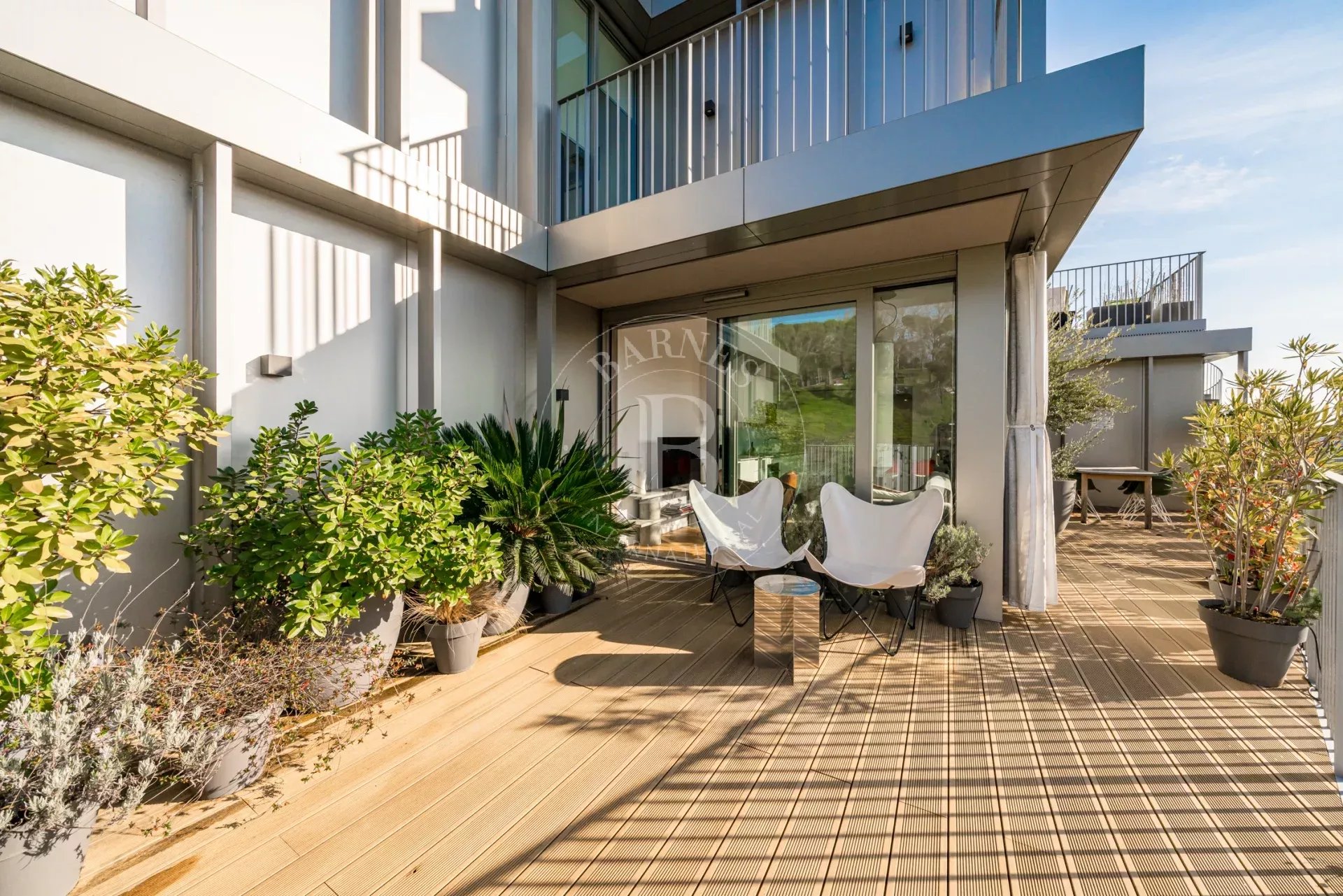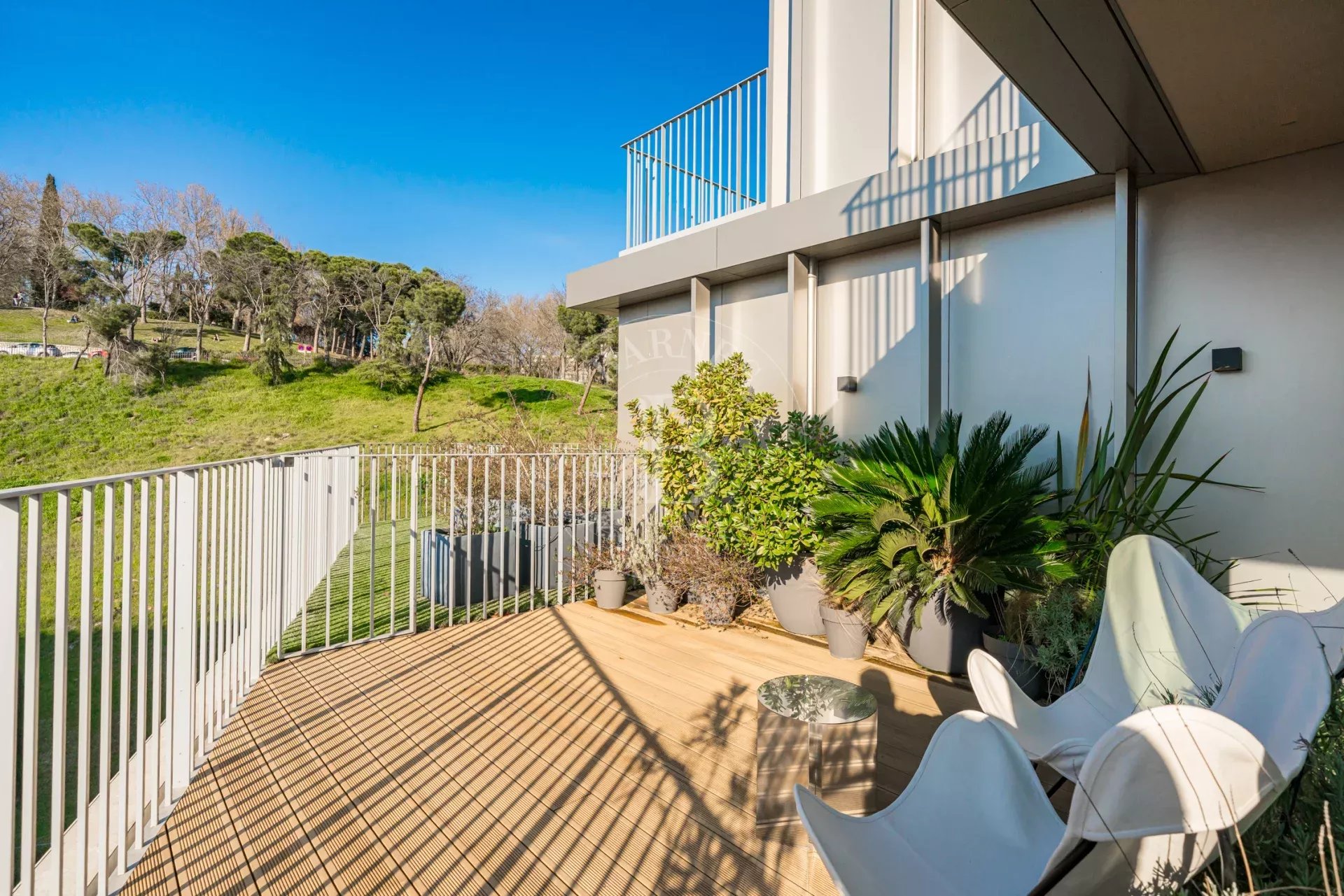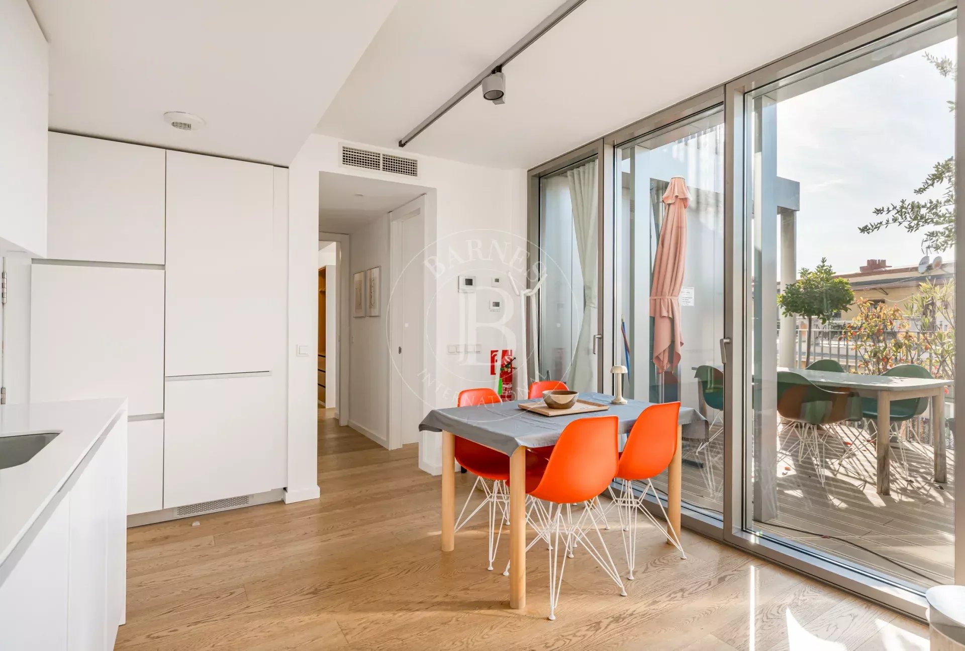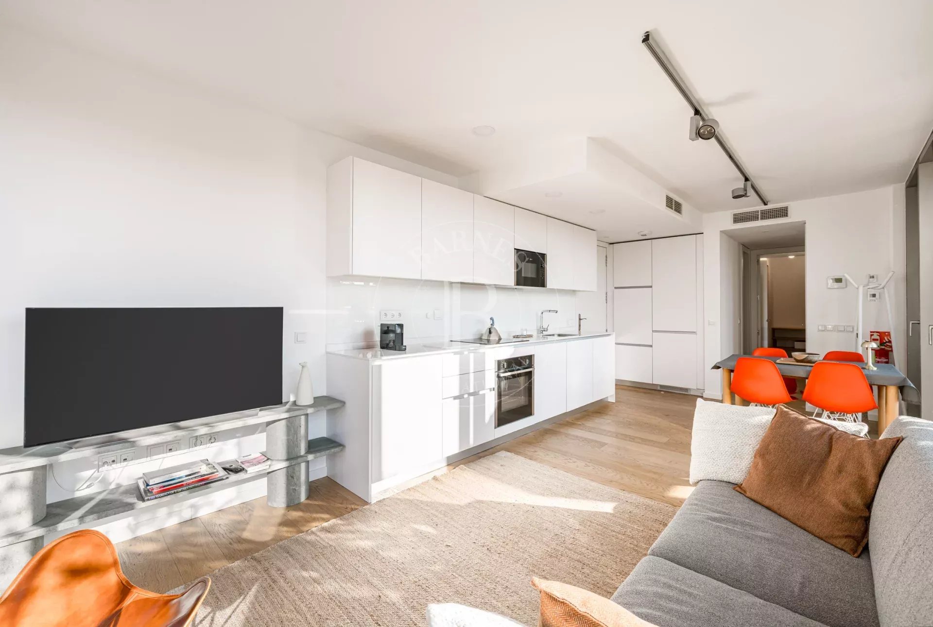 La propiedad cuenta con un luminoso salón en esquina con grandes ventanales de suelo a techo a lo largo de toda la fachada, lo que permite disfrutar de una sensación de amplitud excepcional y de una conexión directa con el entorno natural. La cocina se integra de forma elegante en el espacio de estar y está equipada con electrodomésticos de alta gama. Dispone de dos dormitorios exteriores, siendo el principal en suite con vestidor y armarios empotrados, así como dos baños completos con plato de ducha y excelentes calidades.