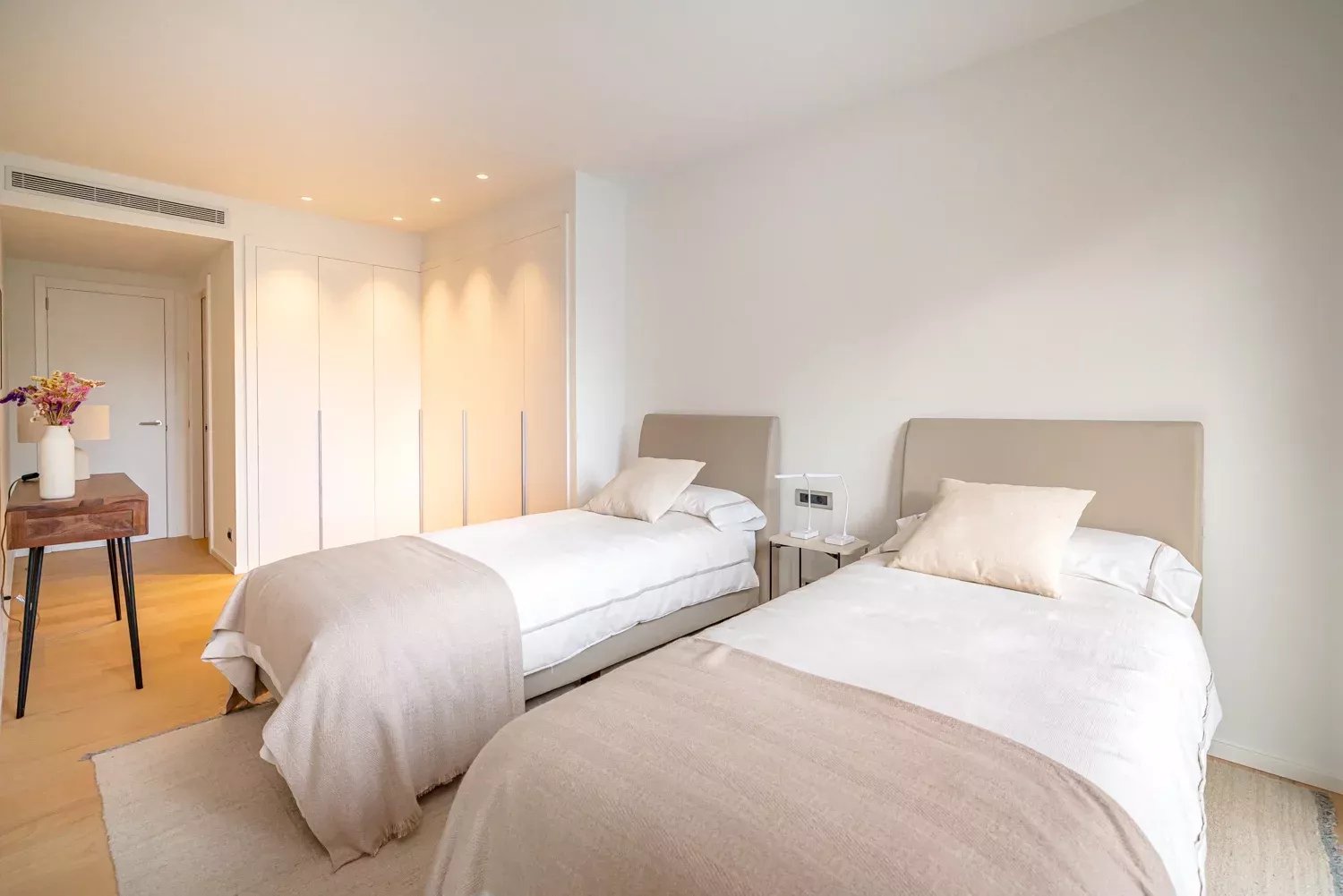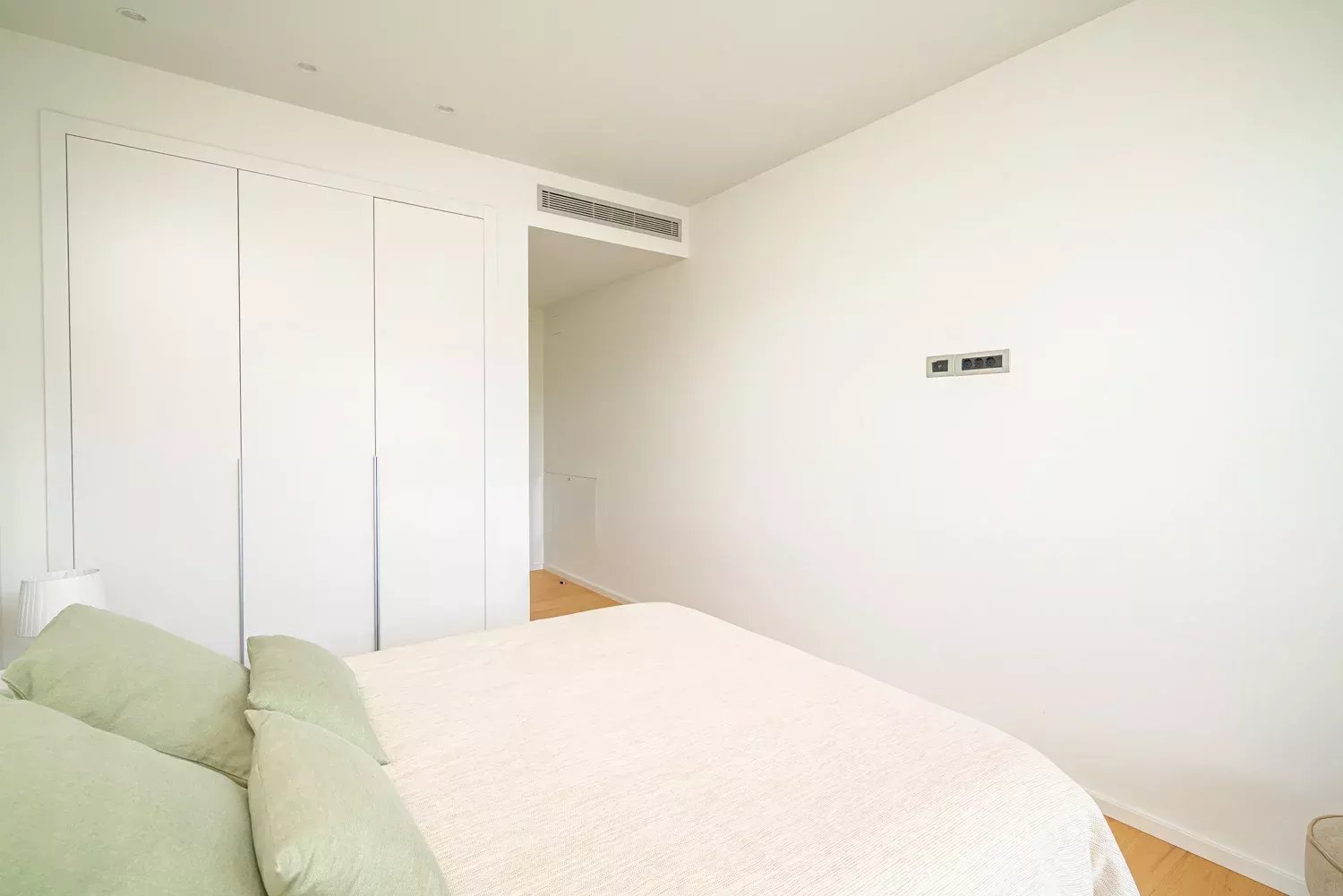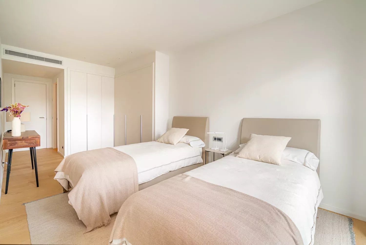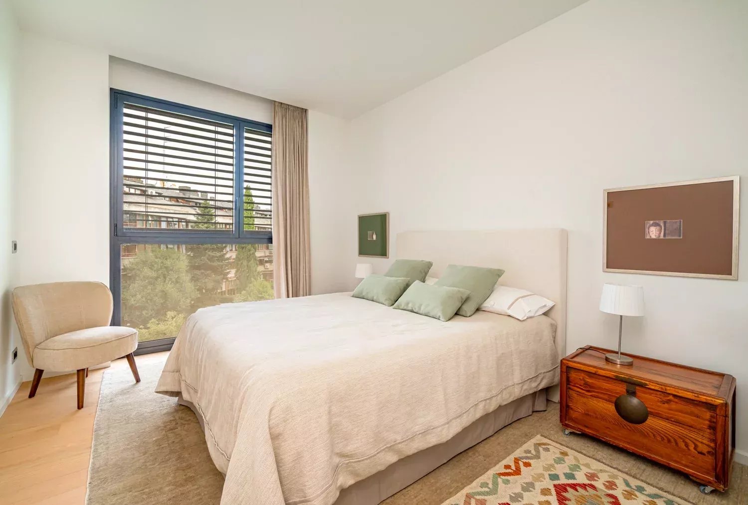 El piso cuenta con tres habitaciones dobles, todas exteriores y con ventanas, siendo la principal la más espaciosa, con un gran ventanal y baño ensuite. Las otras dos habitaciones comparten un baño completo y, además, la vivienda dispone de un aseo de cortesía. Cada estancia ha sido decorada con tonos neutros y elegantes que aportan calidez y sofisticación.