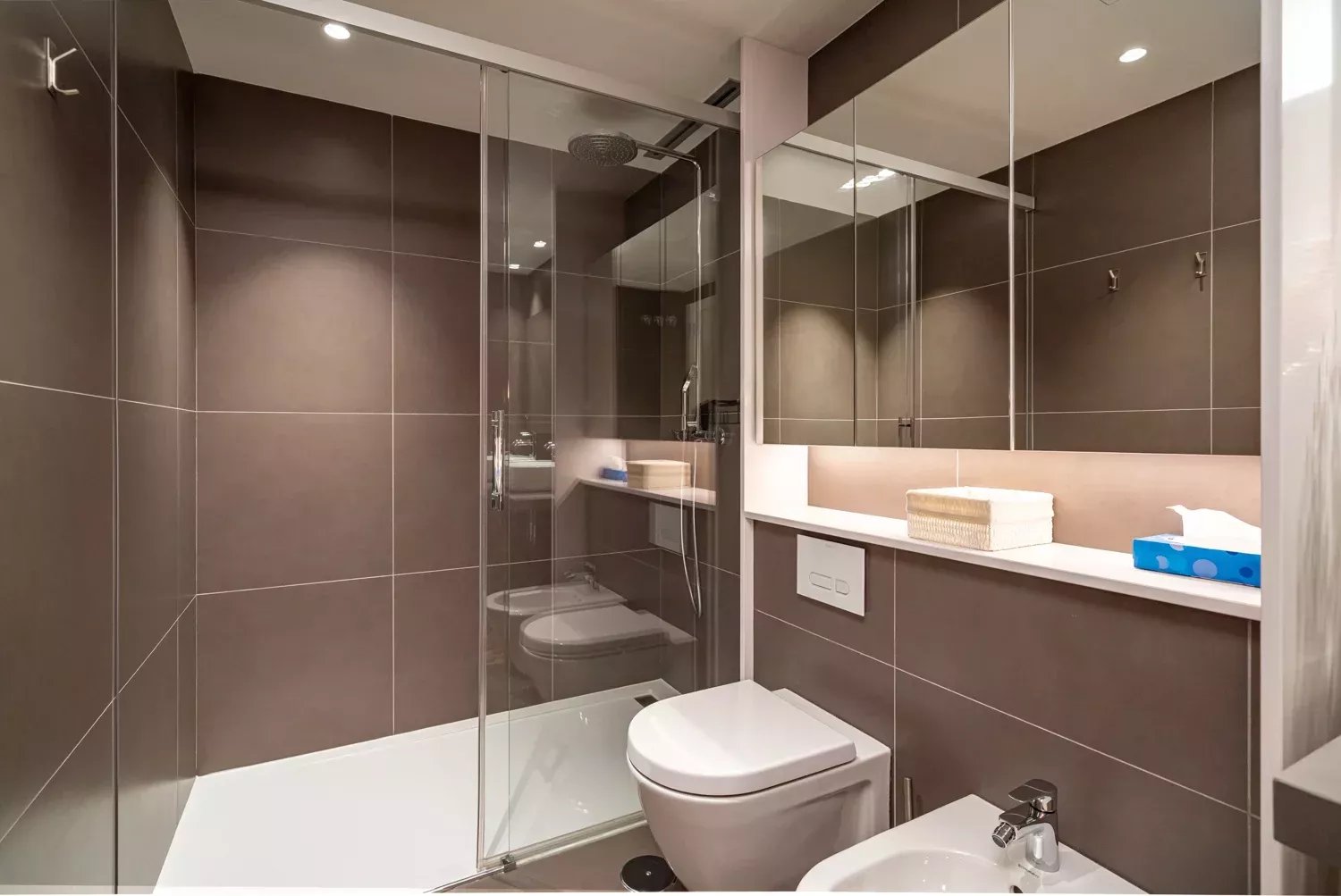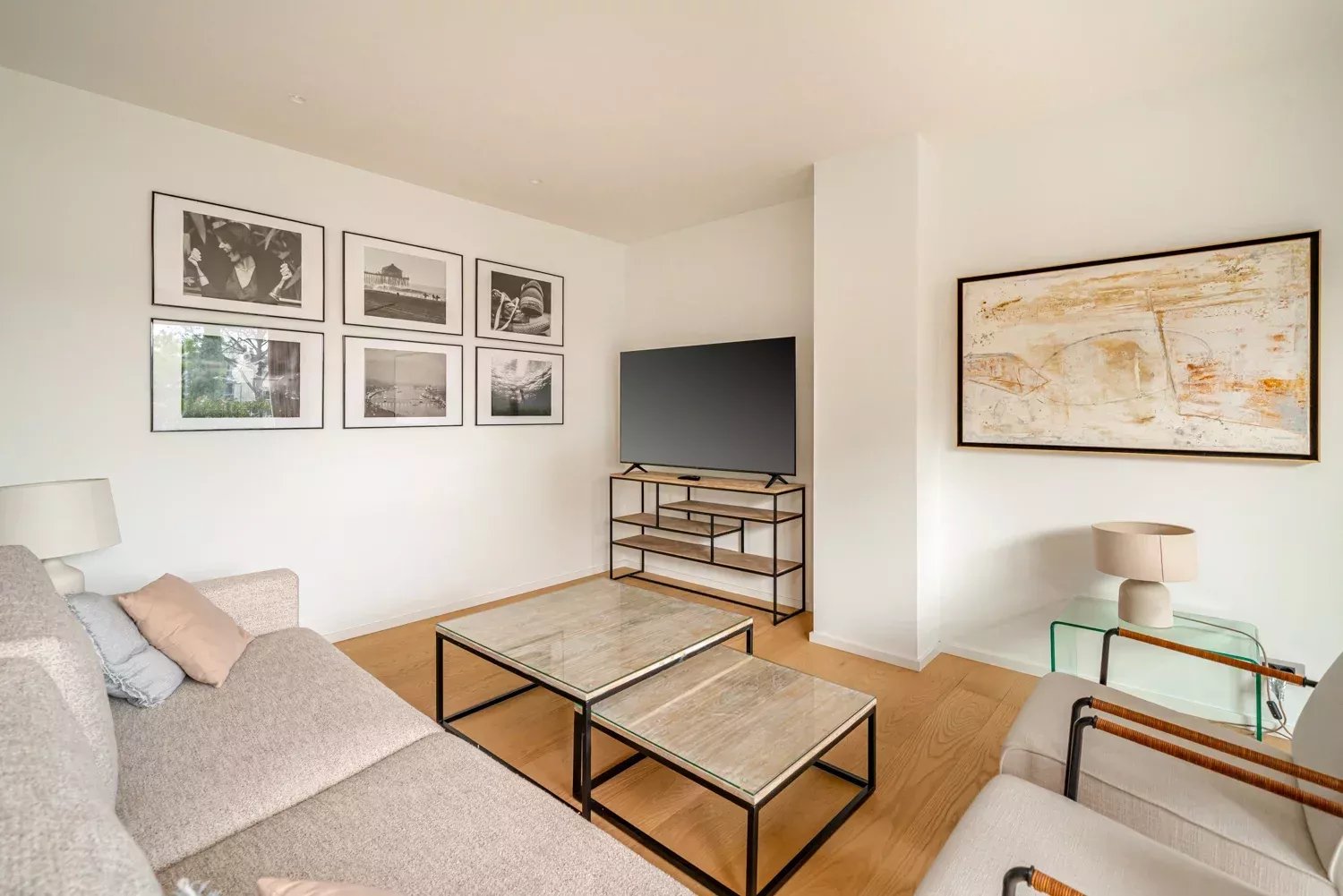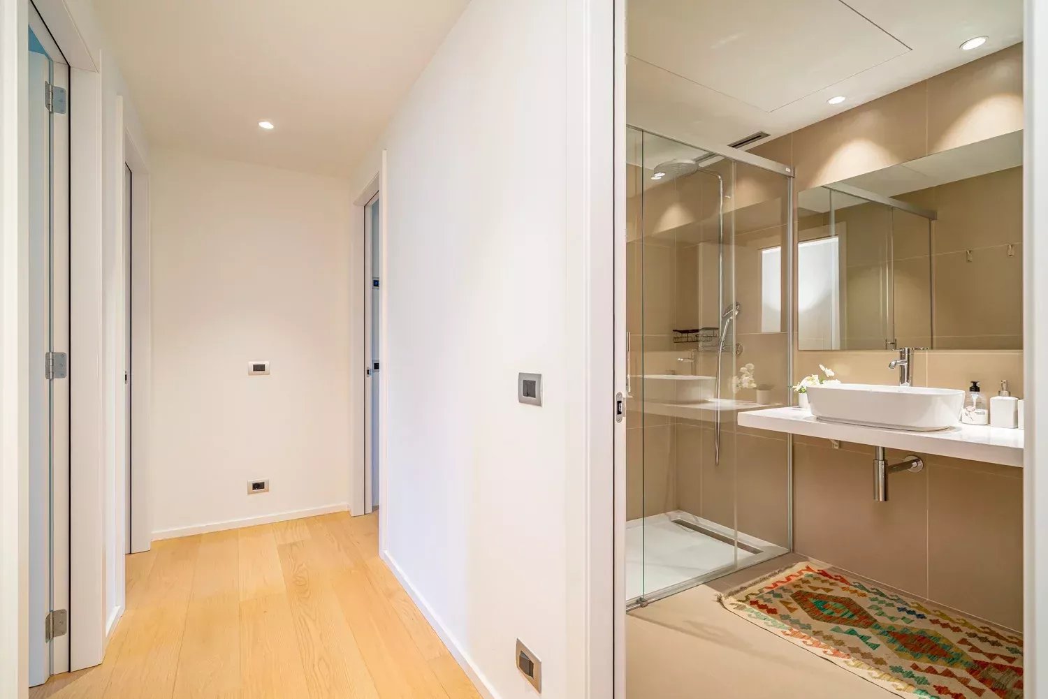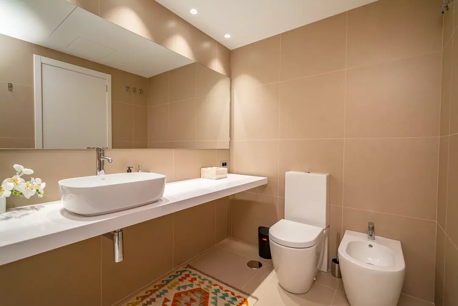 El piso cuenta con tres habitaciones dobles, todas exteriores y con ventanas, siendo la principal la más espaciosa, con un gran ventanal y baño ensuite. Las otras dos habitaciones comparten un baño completo y, además, la vivienda dispone de un aseo de cortesía. Cada estancia ha sido decorada con tonos neutros y elegantes que aportan calidez y sofisticación.