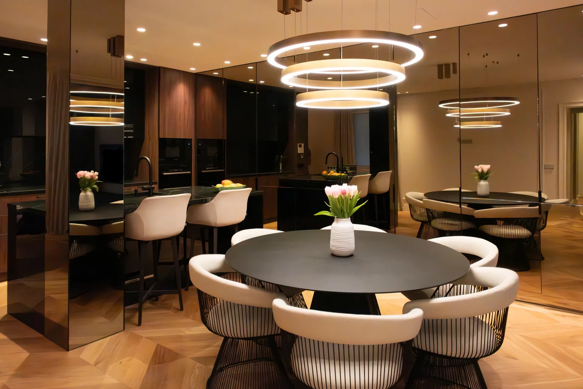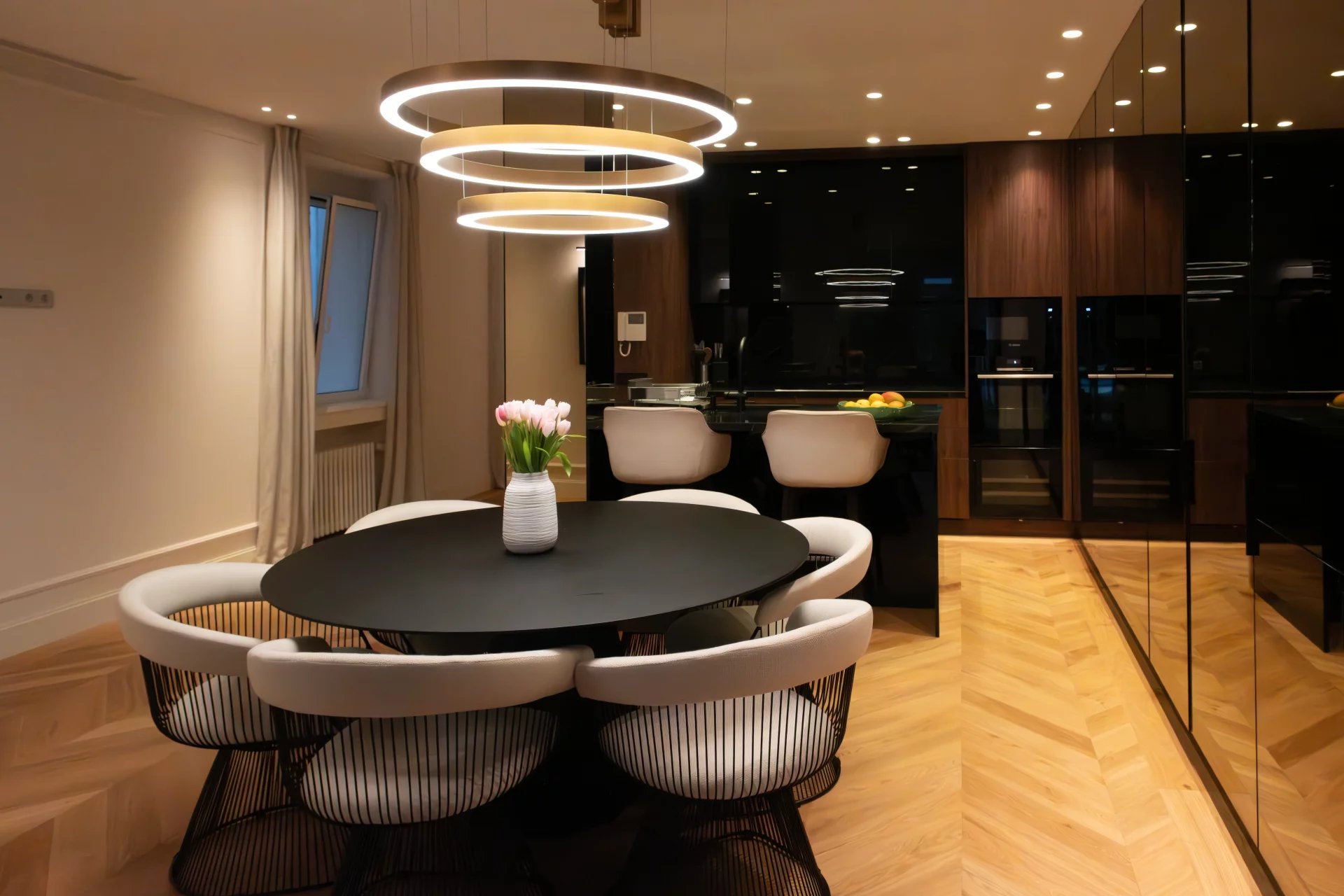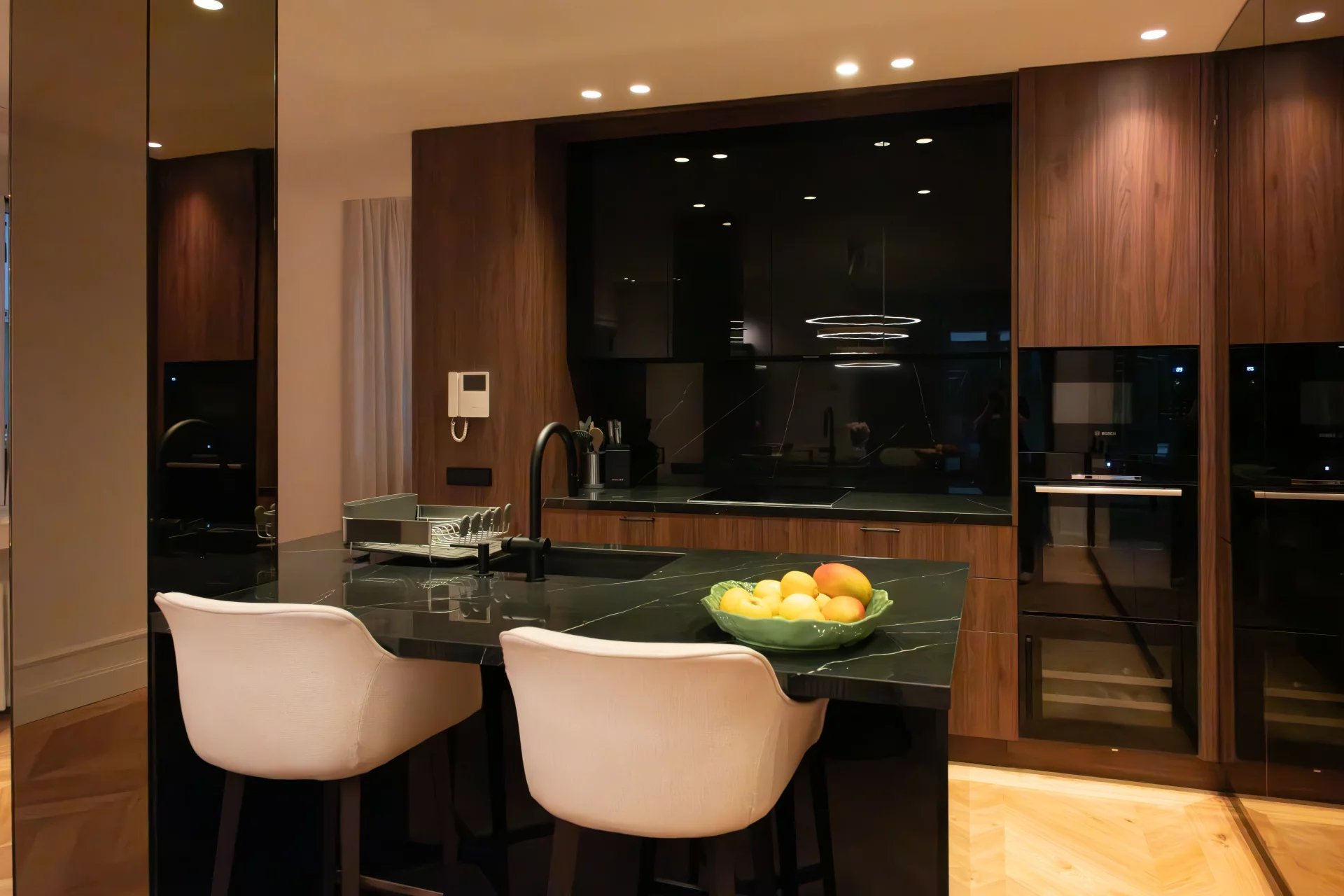La cocina, de diseño a medida, se presenta completamente equipada con electrodomésticos de alta gama y acabados nobles, pensada tanto para el uso diario como para recibir.