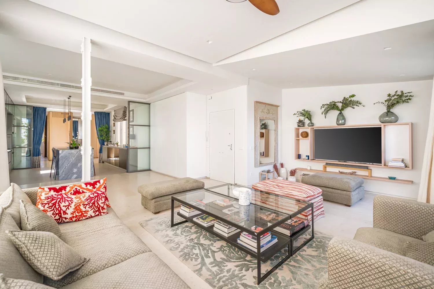 El salón-comedor se abre a la terraza privada de generosas dimensiones, equipada con mobiliario de diseño, obras de arte, cerradura de alta seguridad, TV, sofá y mesa de comedor, permite disfrutar del espacio exterior con total privacidad y confort.