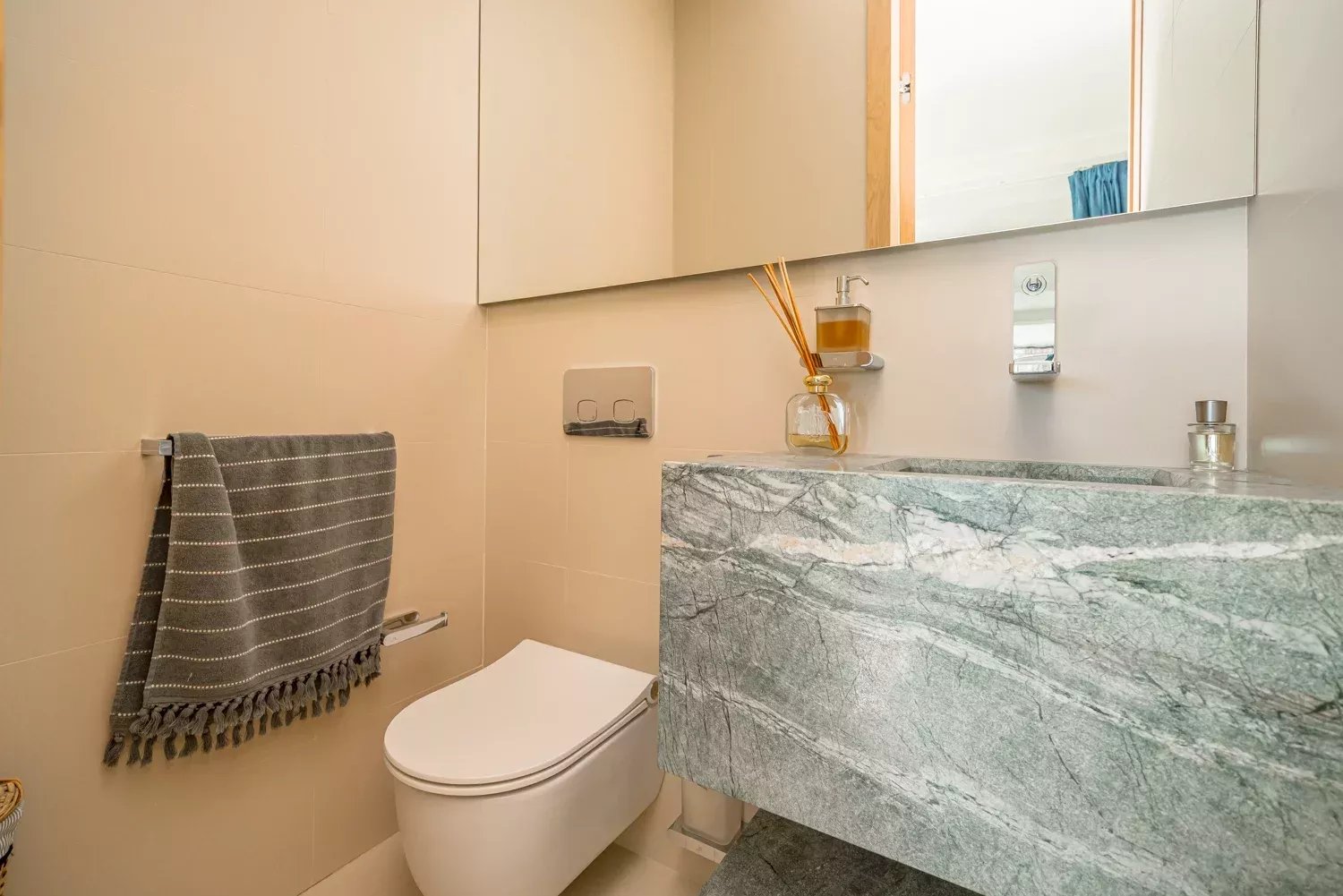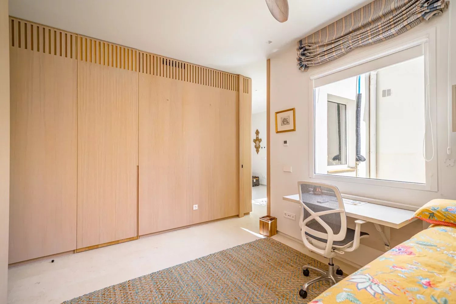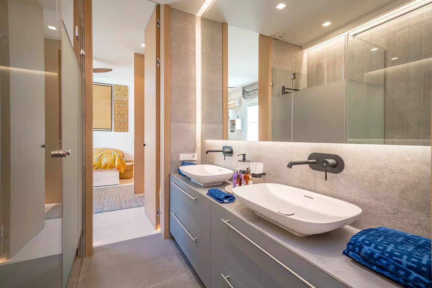 Ofrece una distribución elegante y funcional, con tres estancias de uso versátil: dos amplios dormitorios con baños en suite —uno de ellos con vestidor—, y una tercera sala actualmente acondicionada como zona de lectura o despacho, ideal para teletrabajo o descanso.