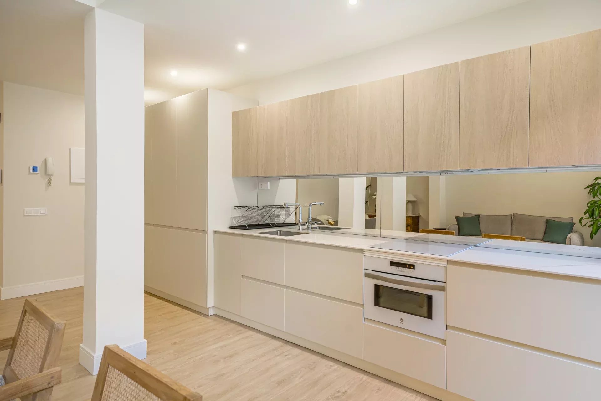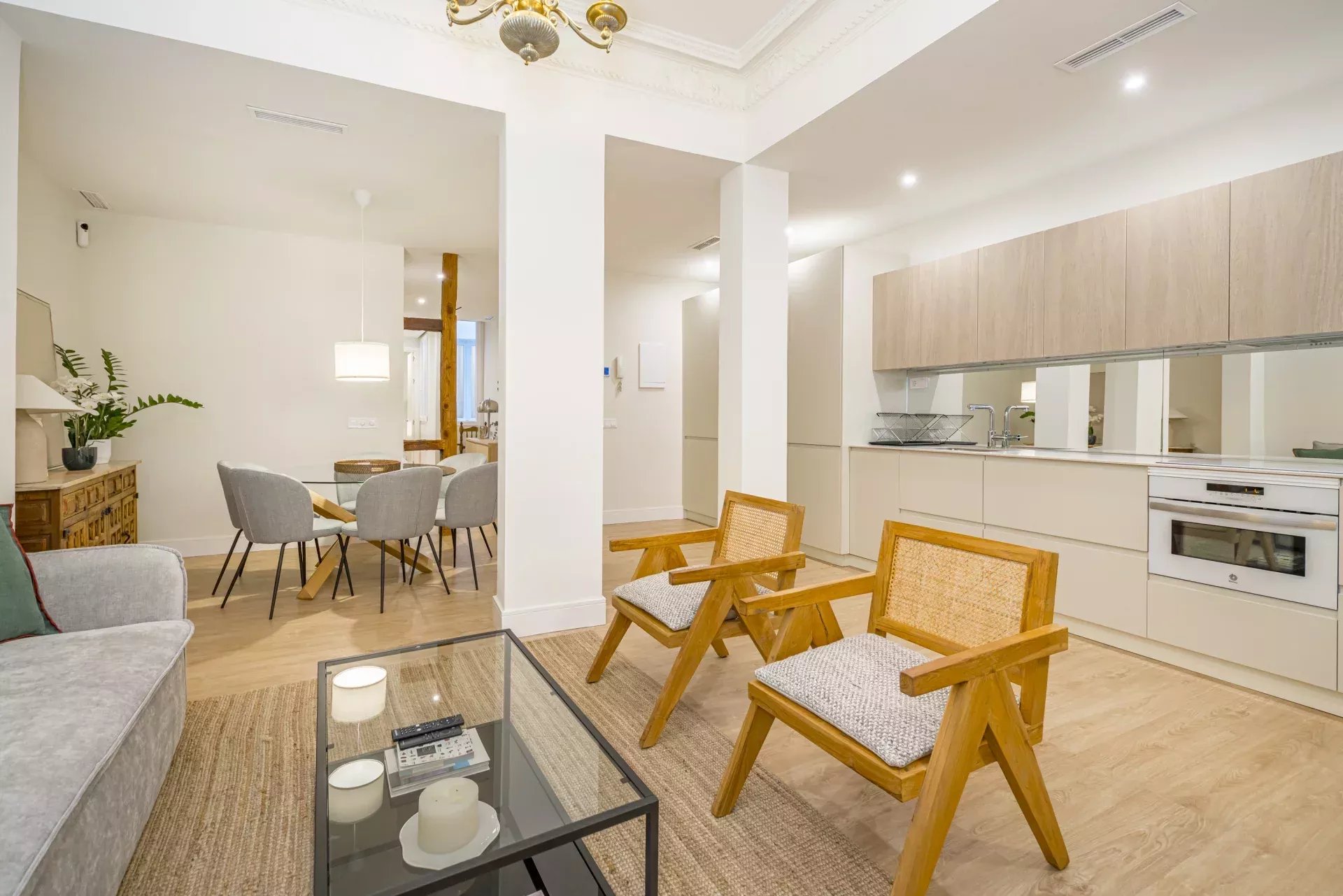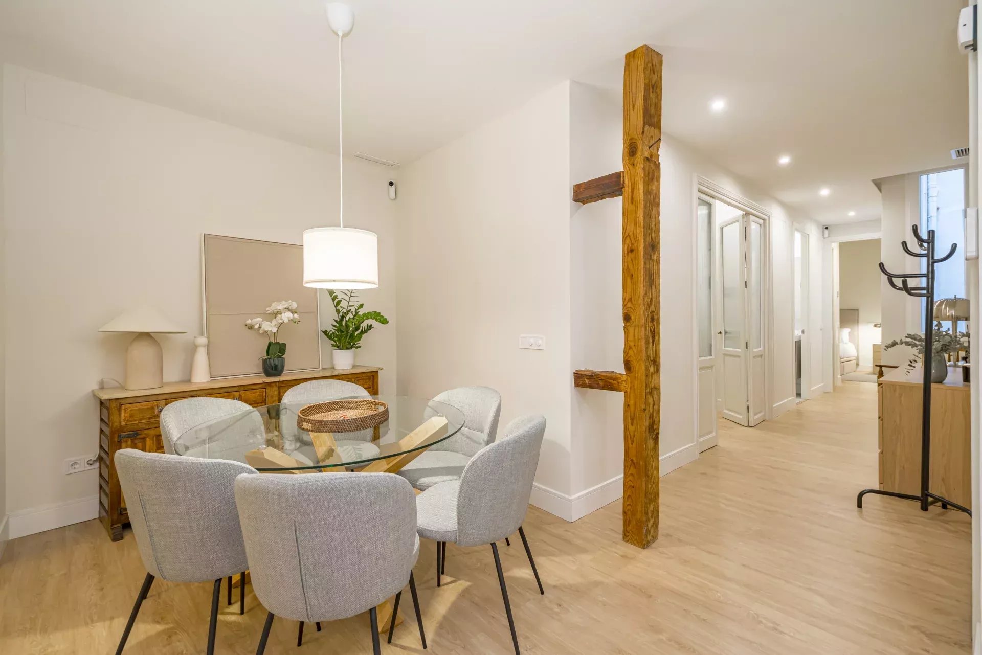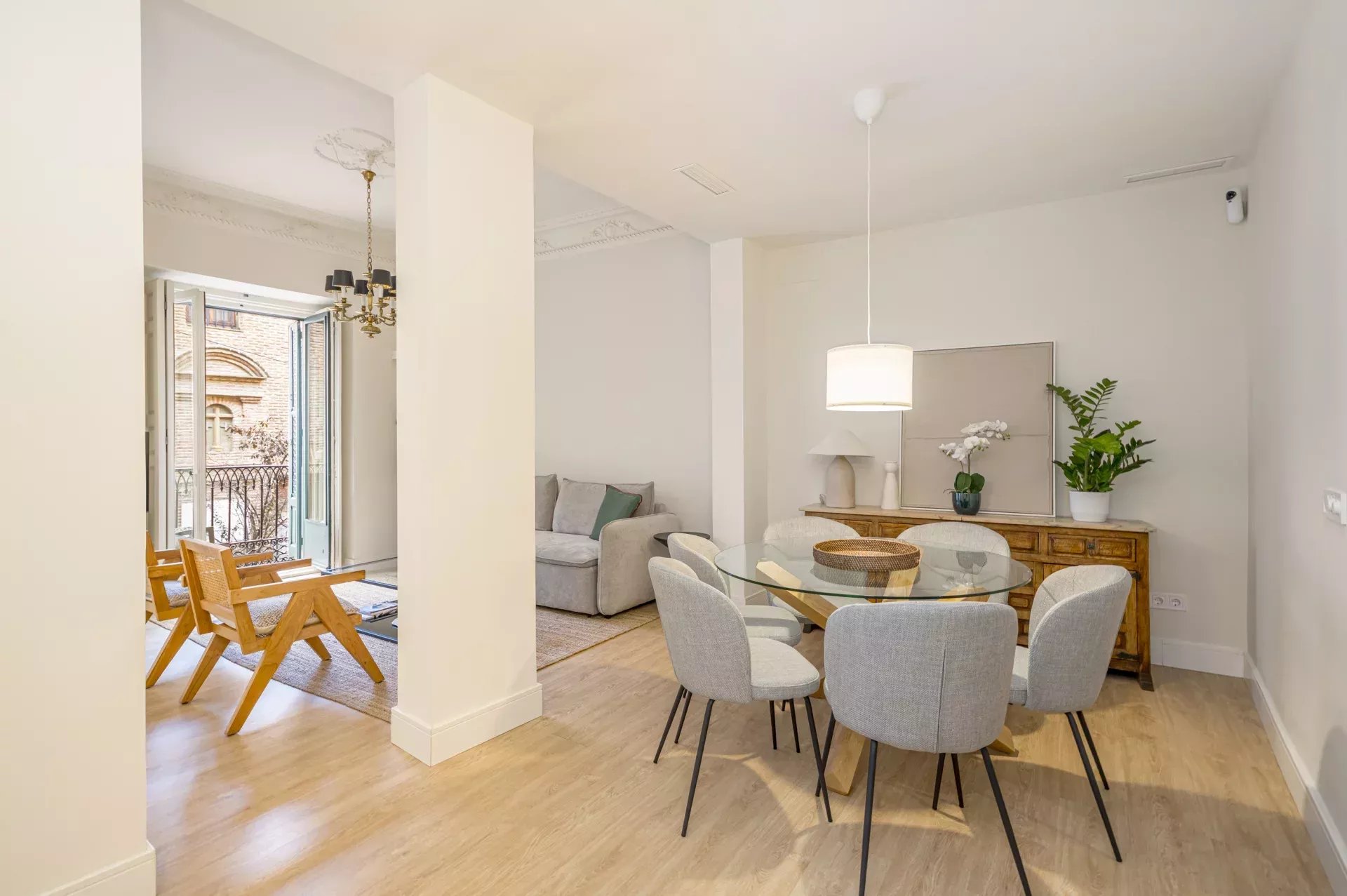 Al ingresar, nos encontramos con un amplio salón-comedor independiente, cuyo comedor da a dos balcones que ofrecen una encantadora vista al convento de San Ildefonso, proporcionando un ambiente tranquilo en una calle sin bares y de absoluto silencio. Esta disposición permite disfrutar de una calidad de vida excepcional en el corazón de Madrid.