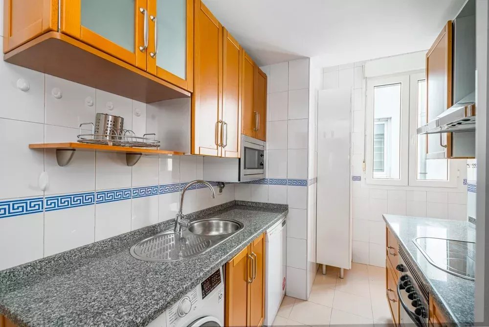 Cocina equipada completa con frigorífico, lavadora secadora, lavavajillas, vitrocerámica, horno y microondas. La cocina cuenta con una amplia despensa con dos armarios.