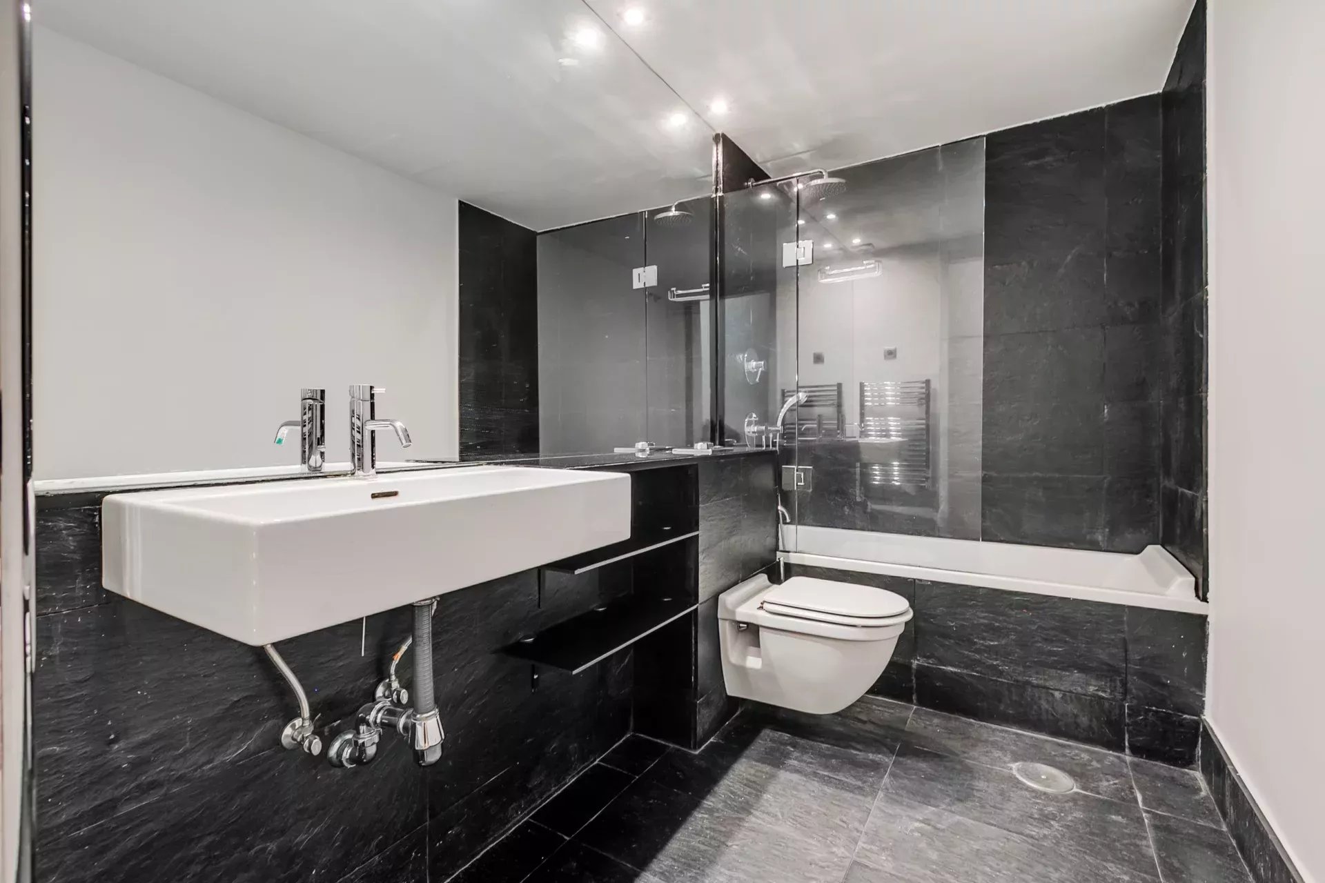 El piso consta de dos atractivas habitaciones que ofrecen abundante luz natural, gracias a sus patios interiores abiertos. Los dos cuartos de baño completos, uno de ellos en suite, están terminados en pizarra negra.