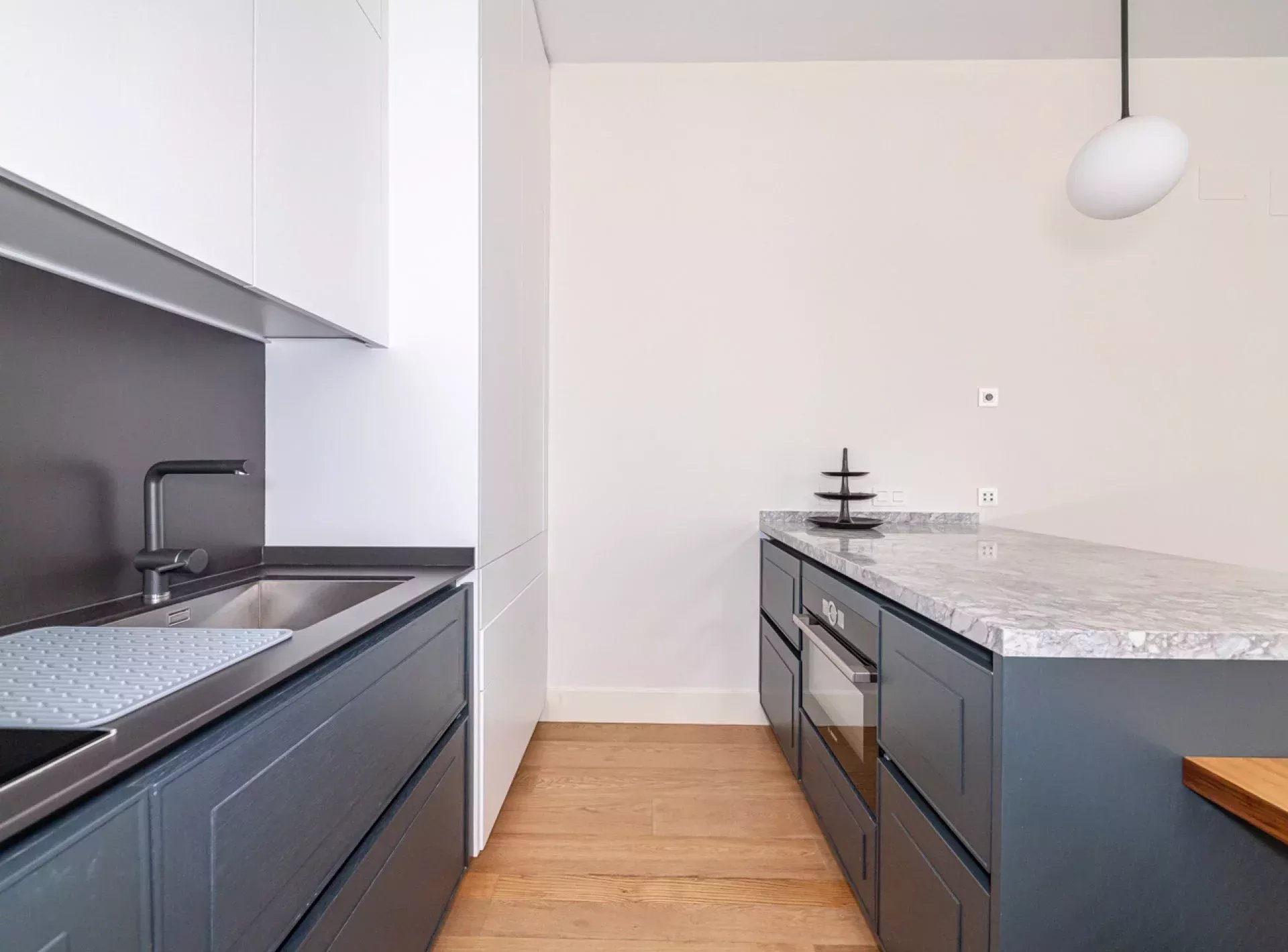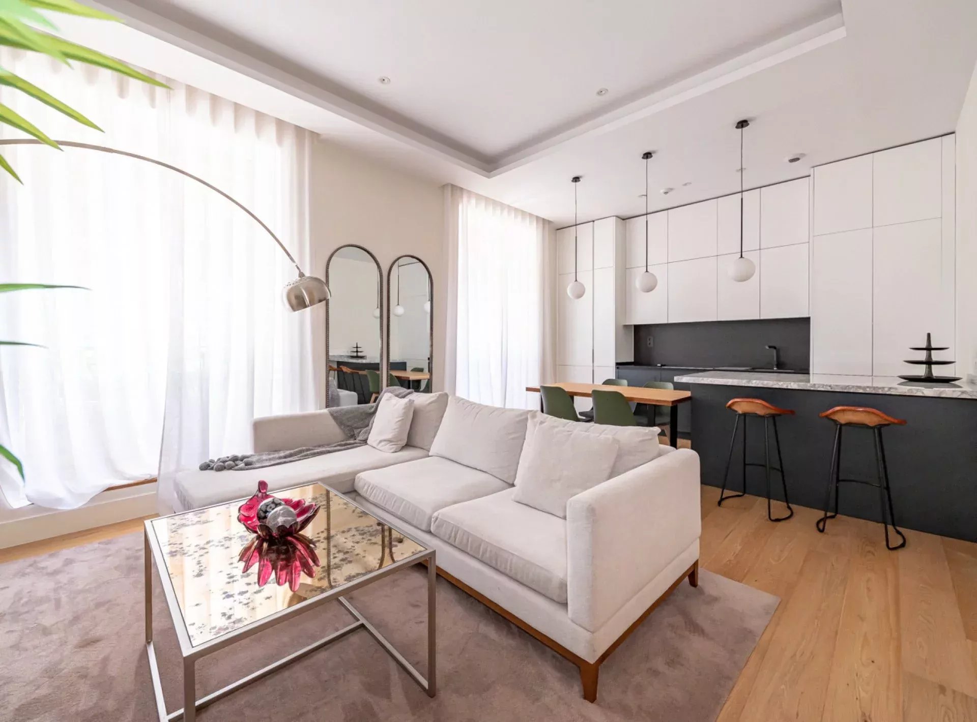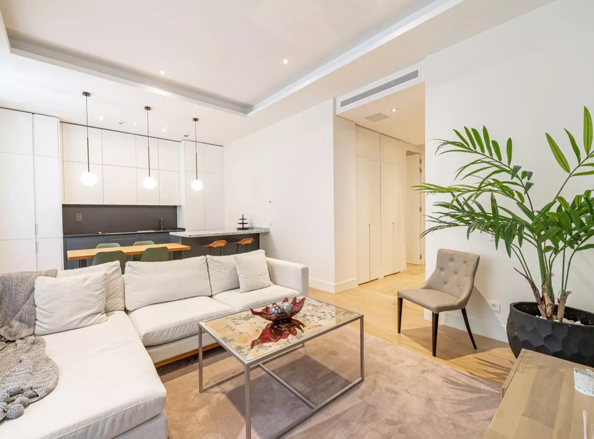 Dispone de un elegante salón-comedor con cocina abierta tipo americana, totalmente equipada con electrodomésticos de alta gama, y balcones exteriores que proporcionan una excelente entrada de luz natural.