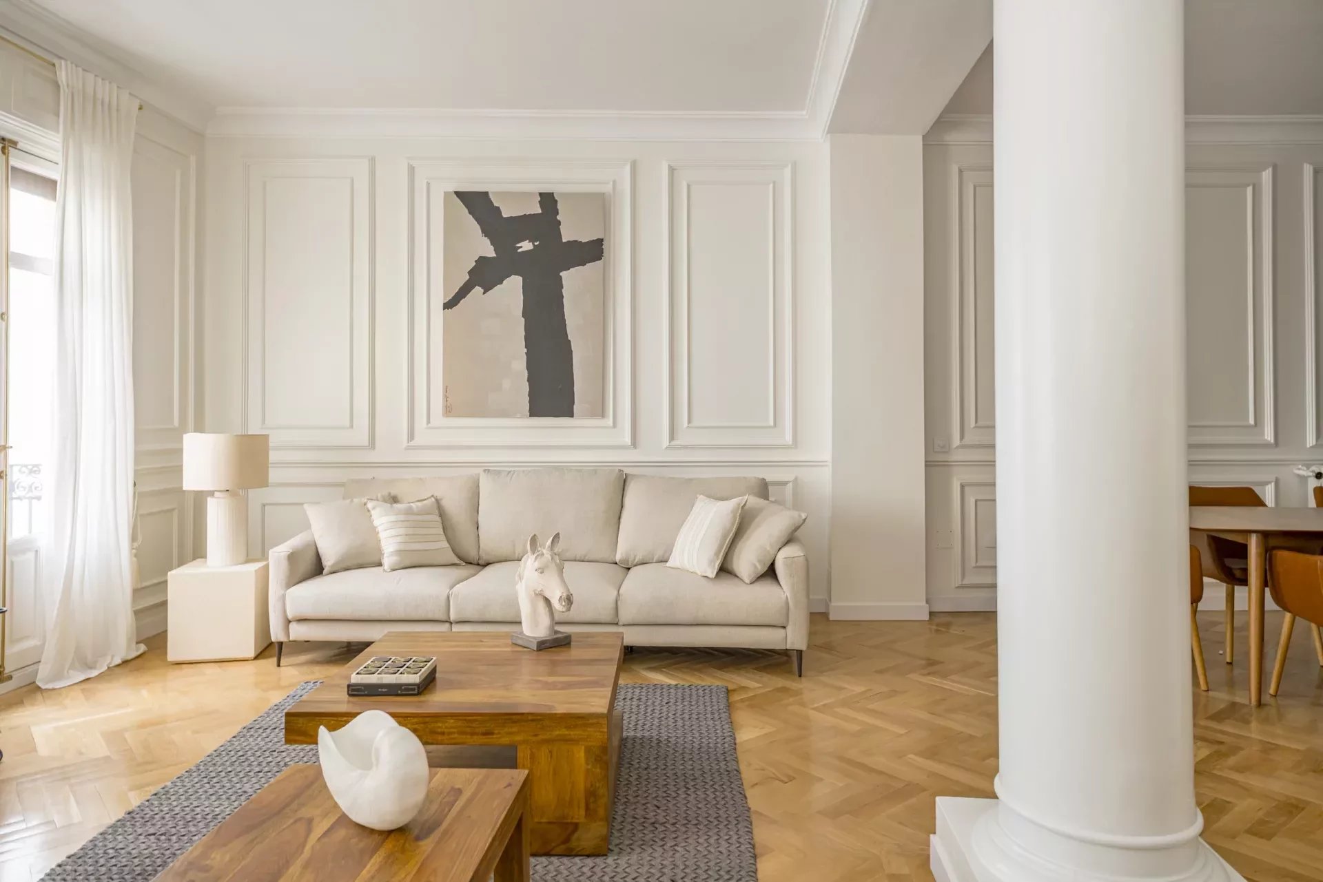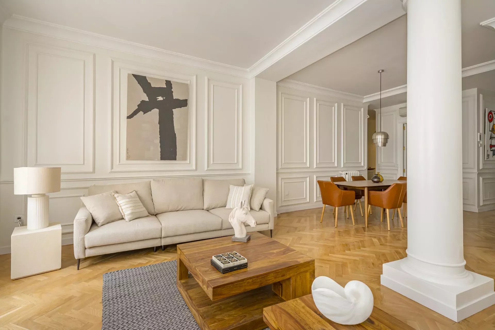El amplio salón, inundado de luz natural gracias a sus grandes ventanales a la calle, se convierte en el eje central de la vivienda, ideal tanto para el descanso como para la vida social. A continuación, un comedor independiente con capacidad para seis comensales ofrece un espacio perfecto para cenas privadas o encuentros sociales.