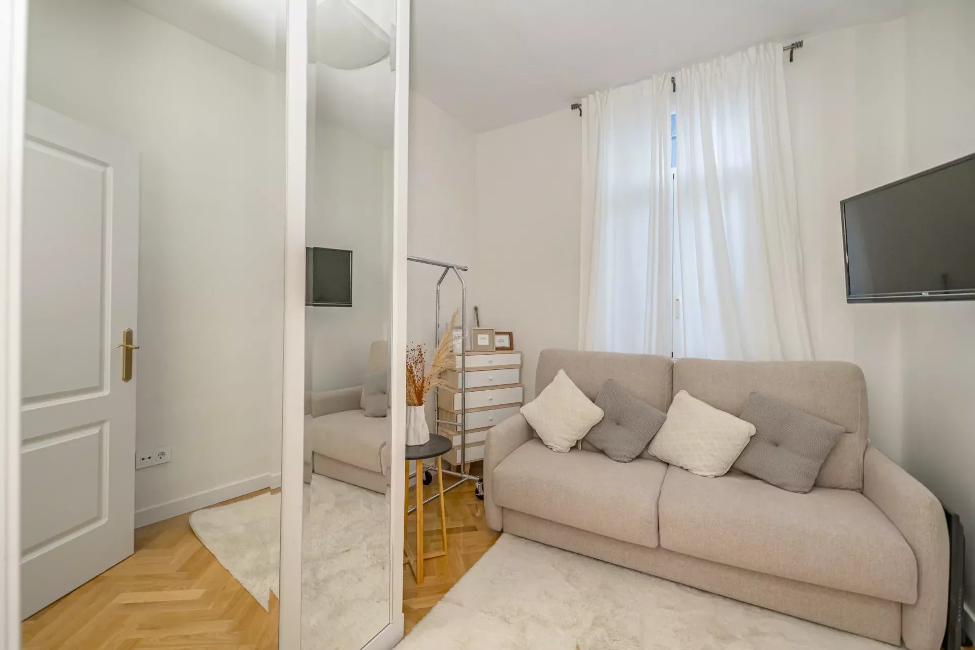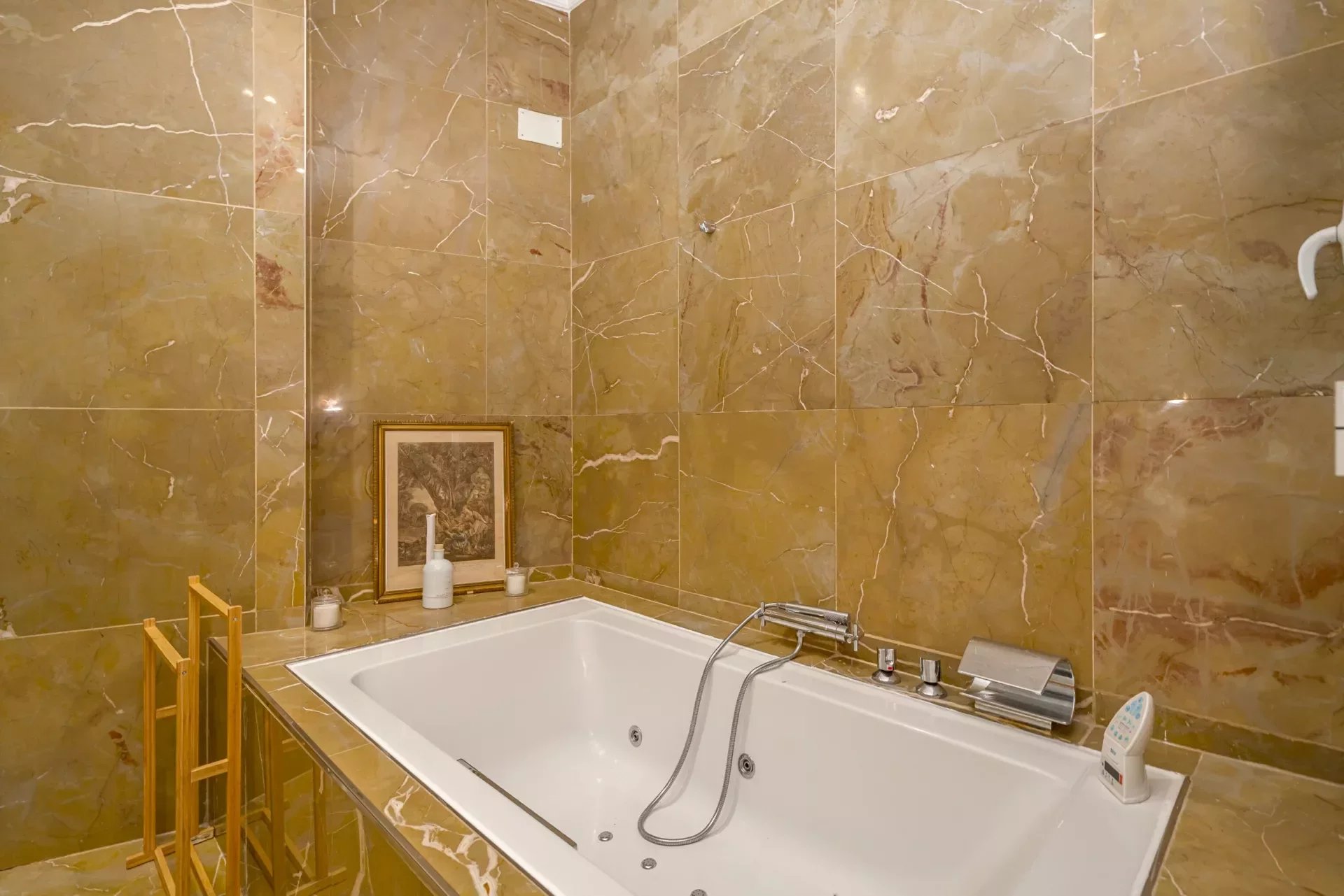 La vivienda dispone de dos dormitorios. El dormitorio principal, concebido como una auténtica suite, cuenta con un amplio vestidor y un baño en suite equipado con bañera de hidromasaje y ducha independiente, creando un ambiente de auténtico bienestar. El segundo dormitorio, con sofá cama, resulta ideal como habitación de invitados o despacho y se complementa con un segundo baño completo con plato de ducha. Ambos baños destacan por sus acabados en mármol de alta gama.