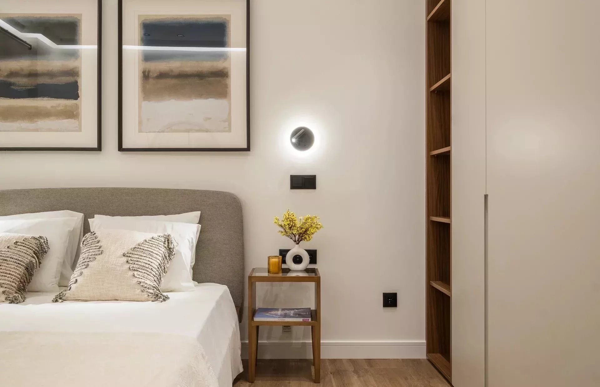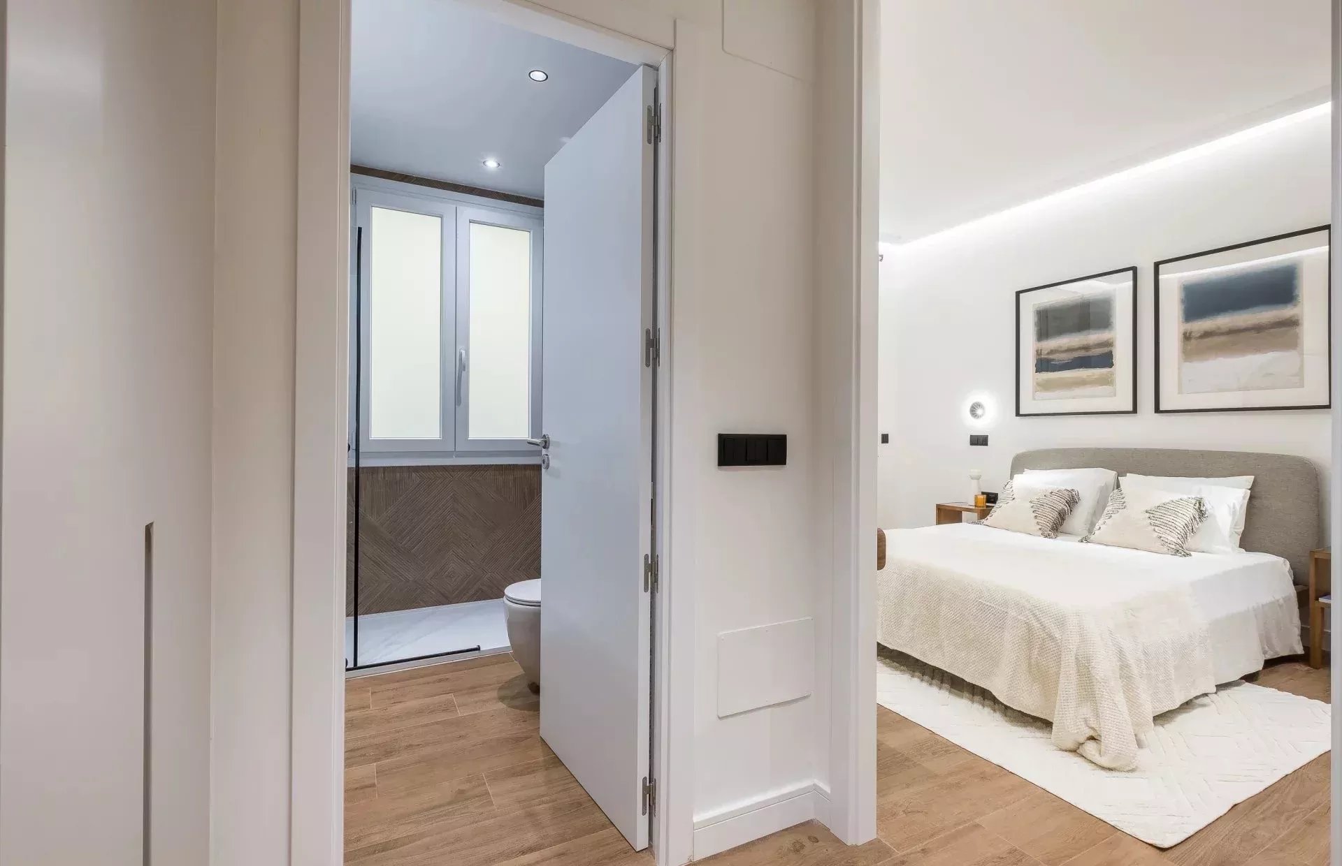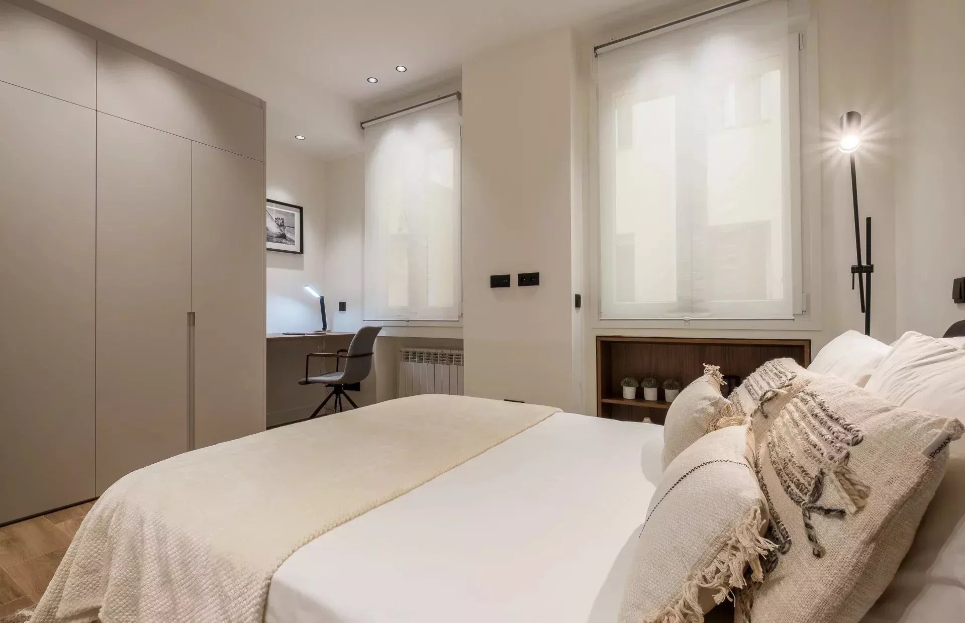 El dormitorio principal es una suite privada, con baño integrado y armarios empotrados generosos, perfectos para un estilo de vida cómodo y organizado. El segundo dormitorio, de excelente tamaño, también cuenta con armarios empotrados y un escritorio, convirtiéndolo en un espacio ideal tanto para descansar como para trabajar desde casa. El baño secundario, de uso compartido, se caracteriza por su diseño moderno y sus acabados de lujo.