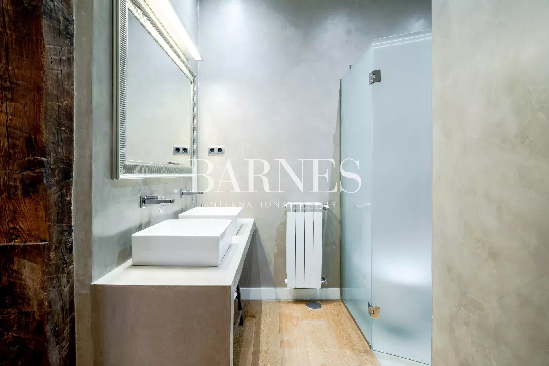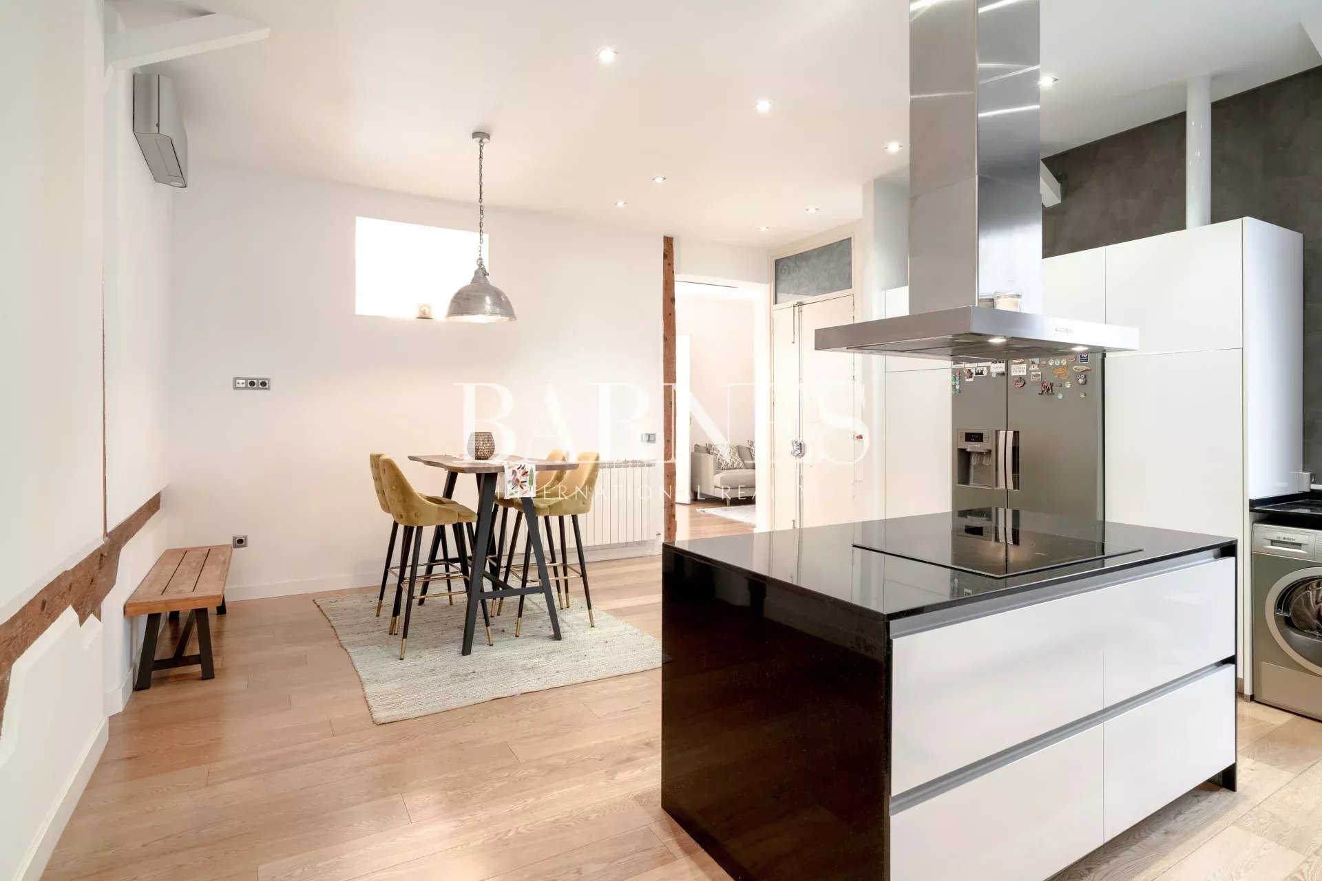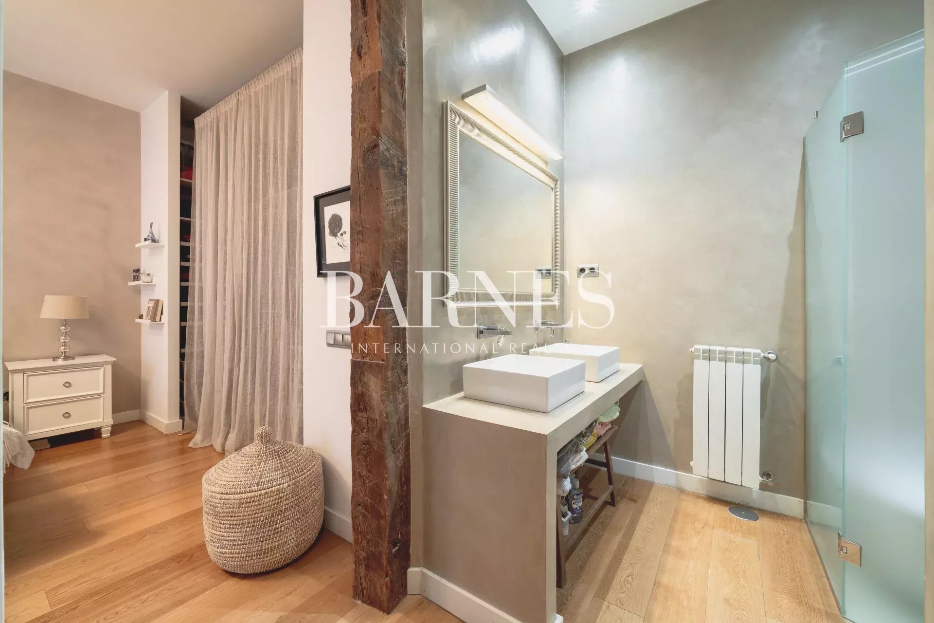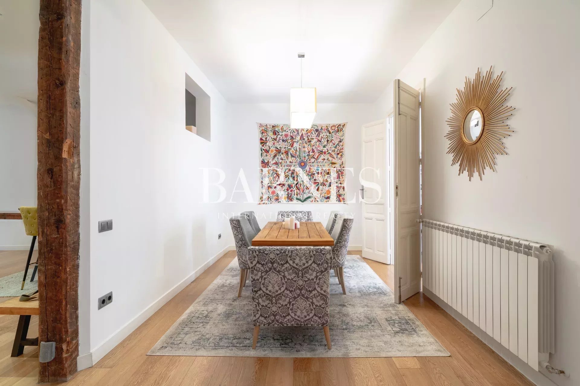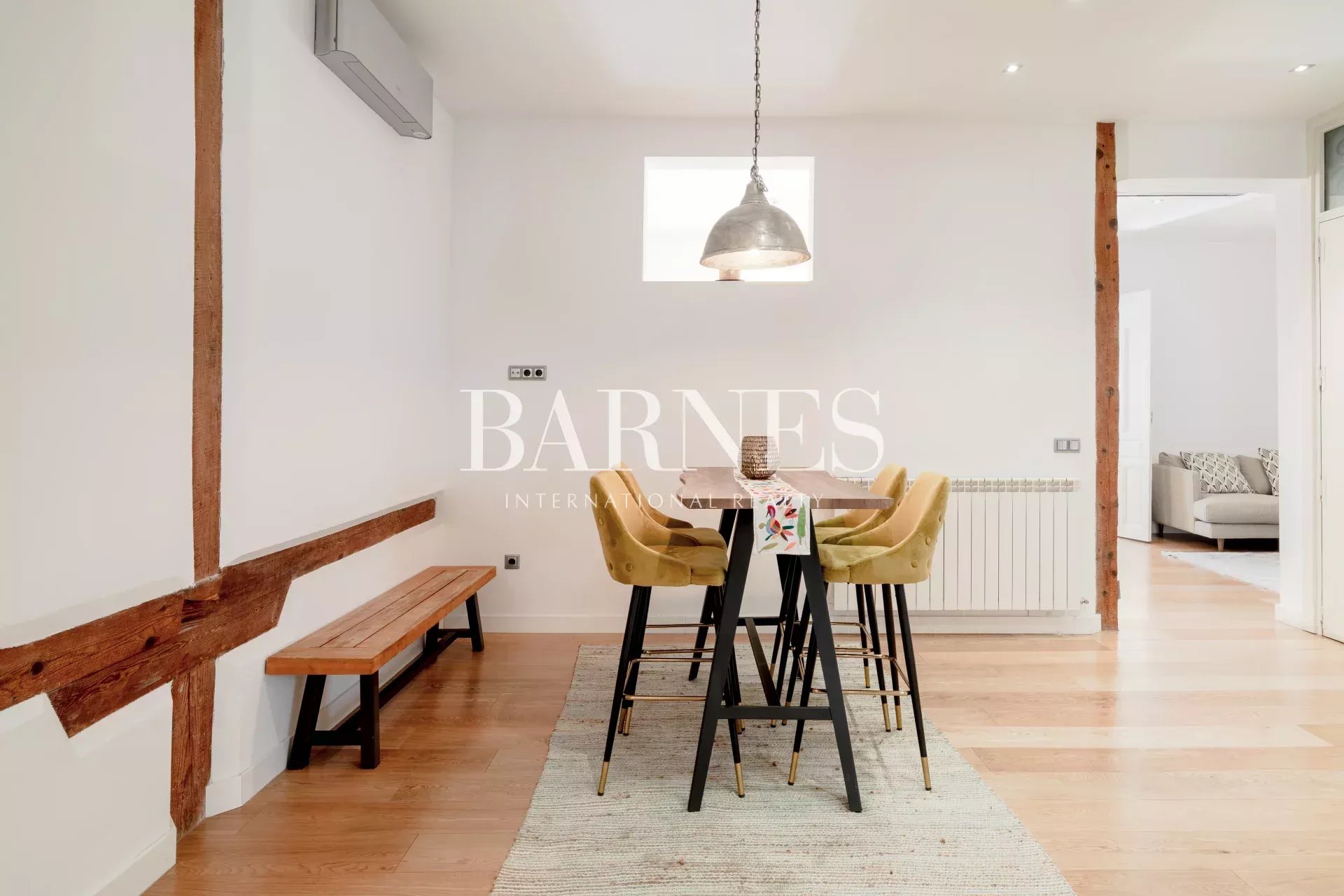 Este fabuloso piso, está ubicado en una primera planta con ascensor, en una finca de 1910. La arquitectura neo-clásica, permitió hacer una reforma preciosa, con columnas y vigas de madera vistas, suelos de madera de roble y algunas paredes acabadas en cemento pulido.