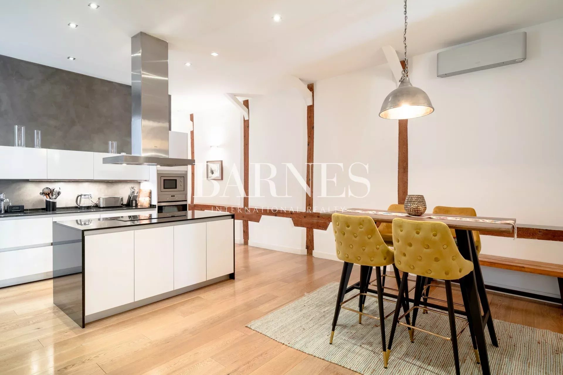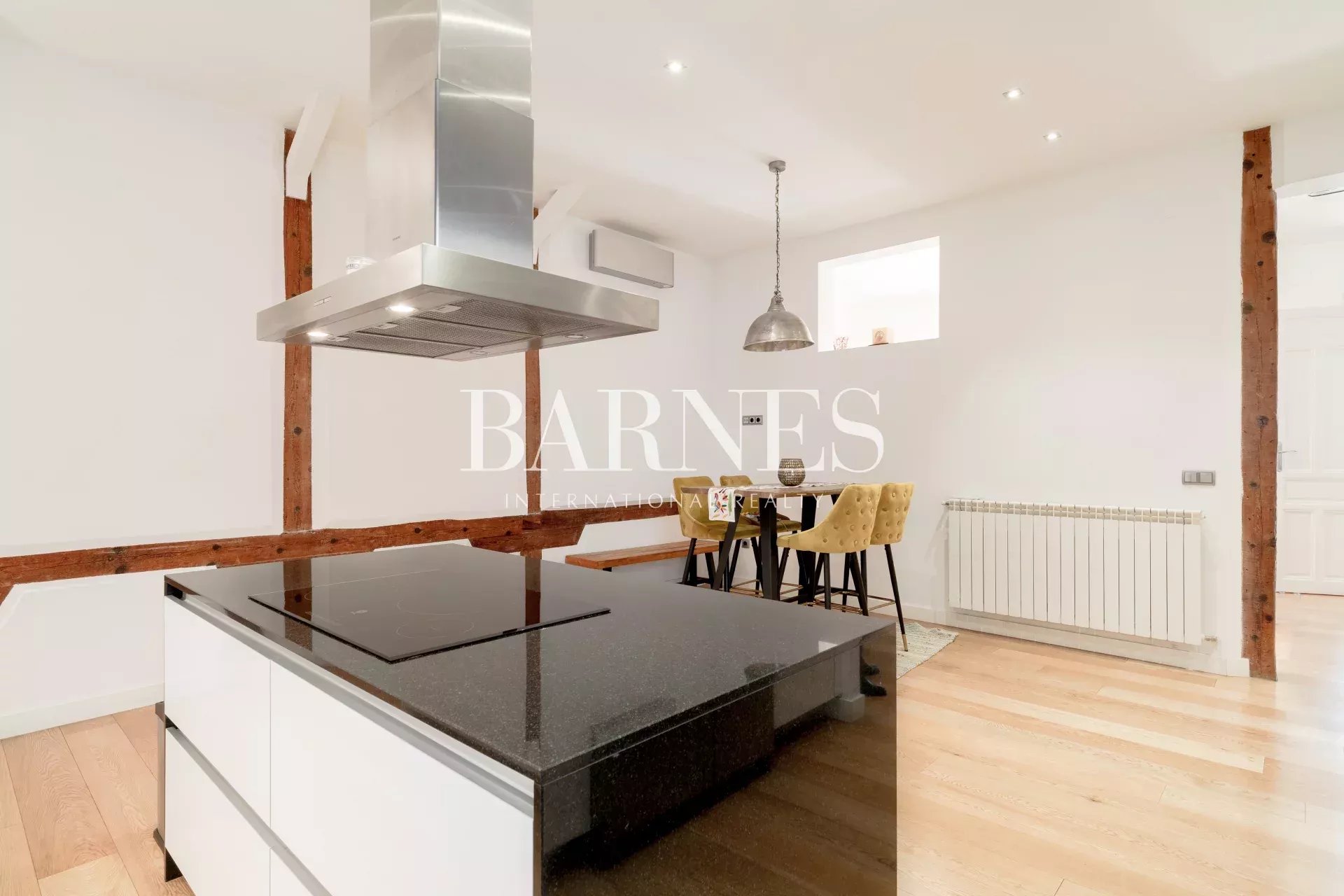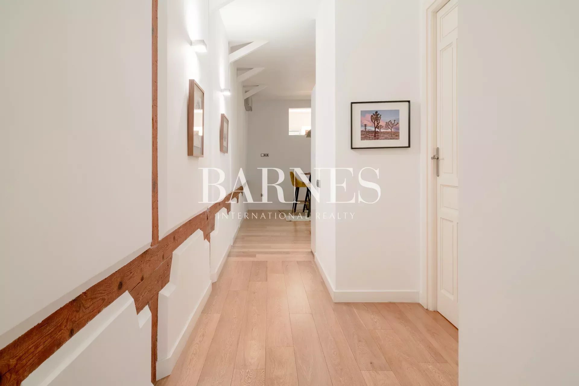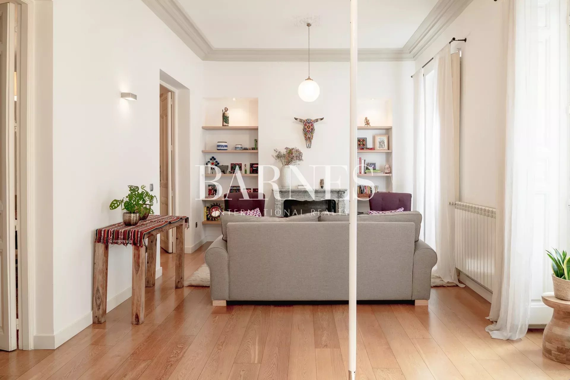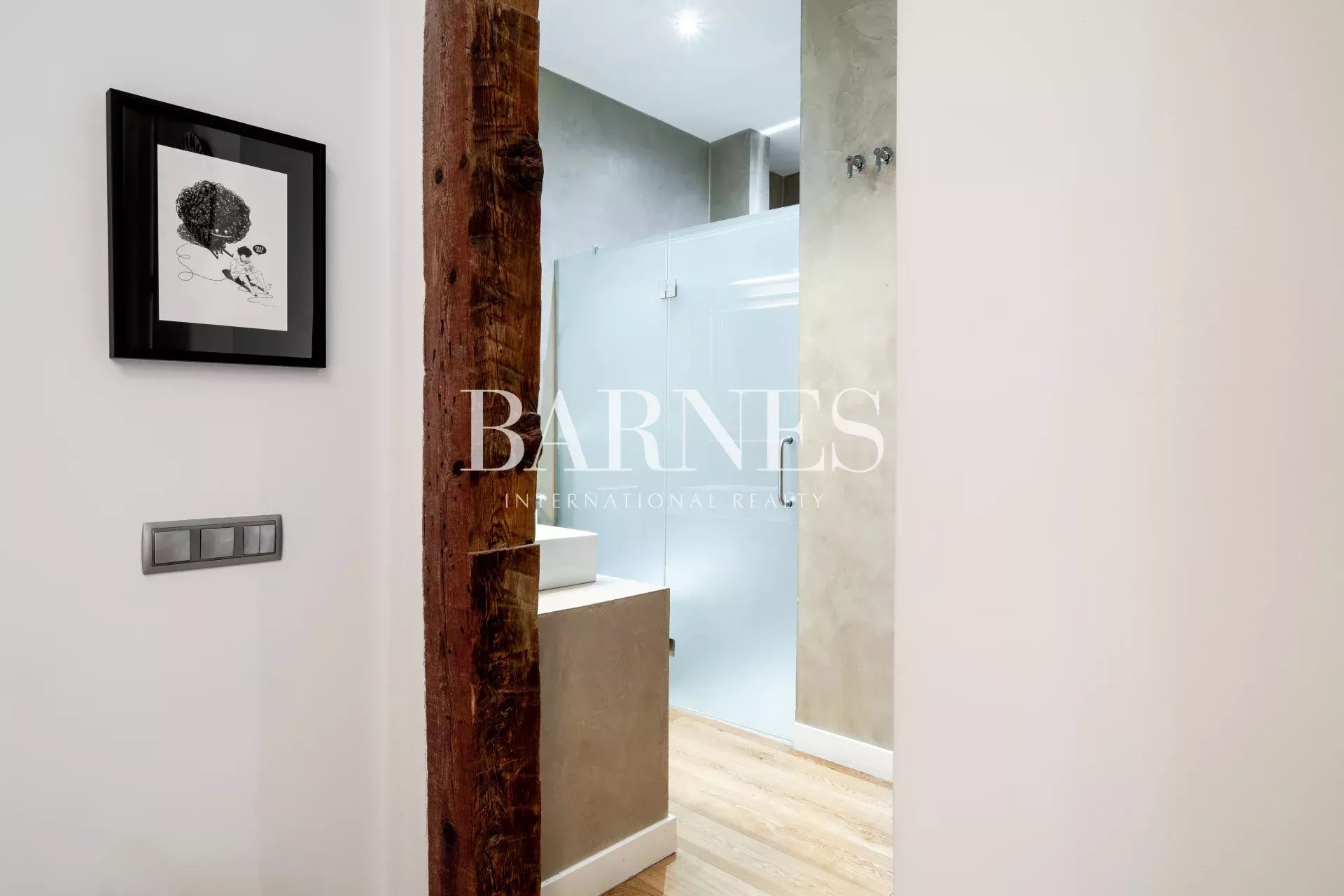 Este fabuloso piso, está ubicado en una primera planta con ascensor, en una finca de 1910. La arquitectura neo-clásica, permitió hacer una reforma preciosa, con columnas y vigas de madera vistas, suelos de madera de roble y algunas paredes acabadas en cemento pulido.