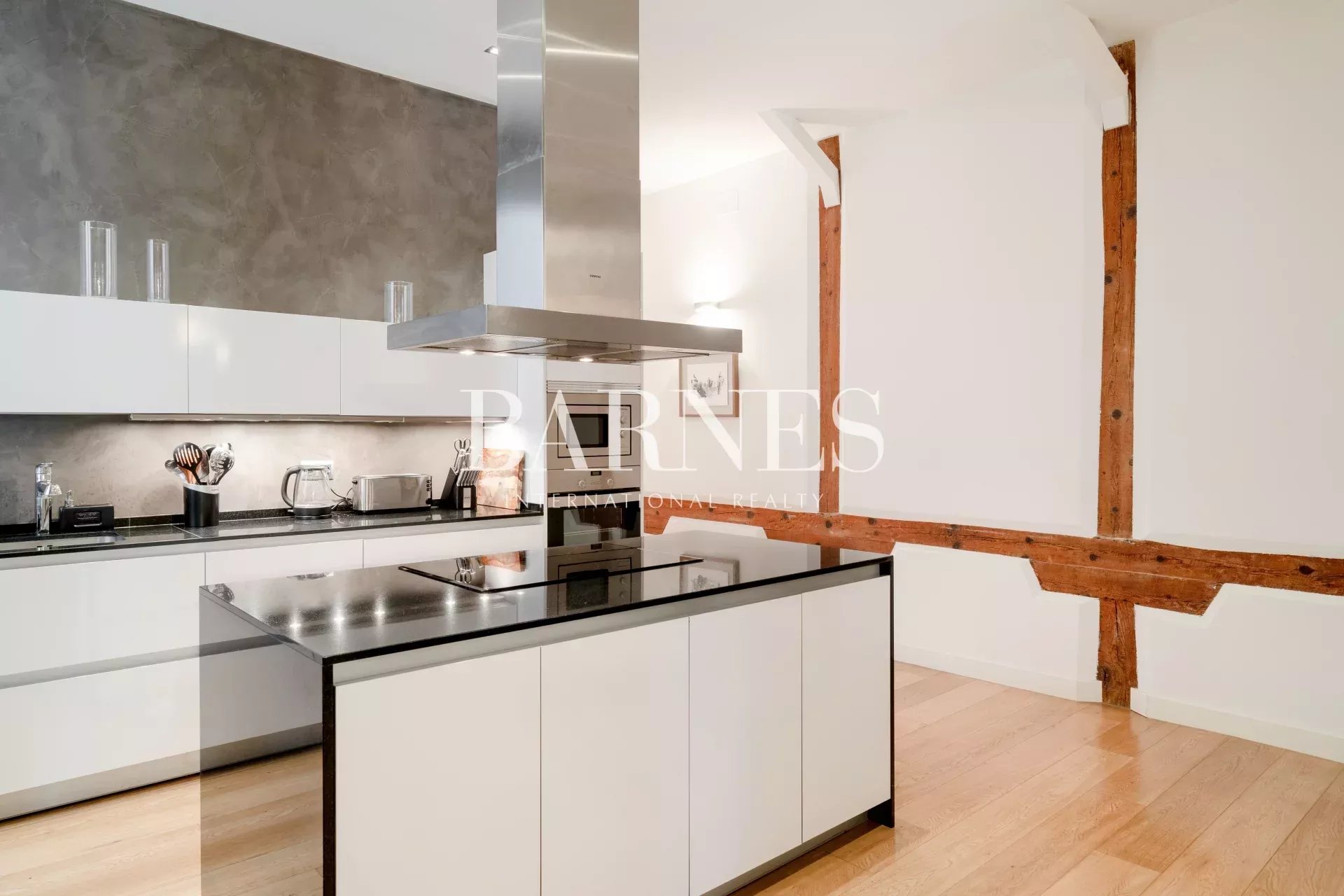 La gran cocina cuenta con isla con encimera de granito negro y diáfano espacio para comedor de diario, amueblada y equipada con electrodomésticos de alta gama, frigorífico tipo americano y moderna campana extractora, lavadora y secadora independientes, lavavajillas, placa de inducción, hornos convencional y microondas, termo de gas individual para agua caliente y calefacción. Ventana y aire acondicionado. En este ambiente se mezclan materiales como el cemento pulido, paredes blancas y lisas y columnas originales de madera vistas.