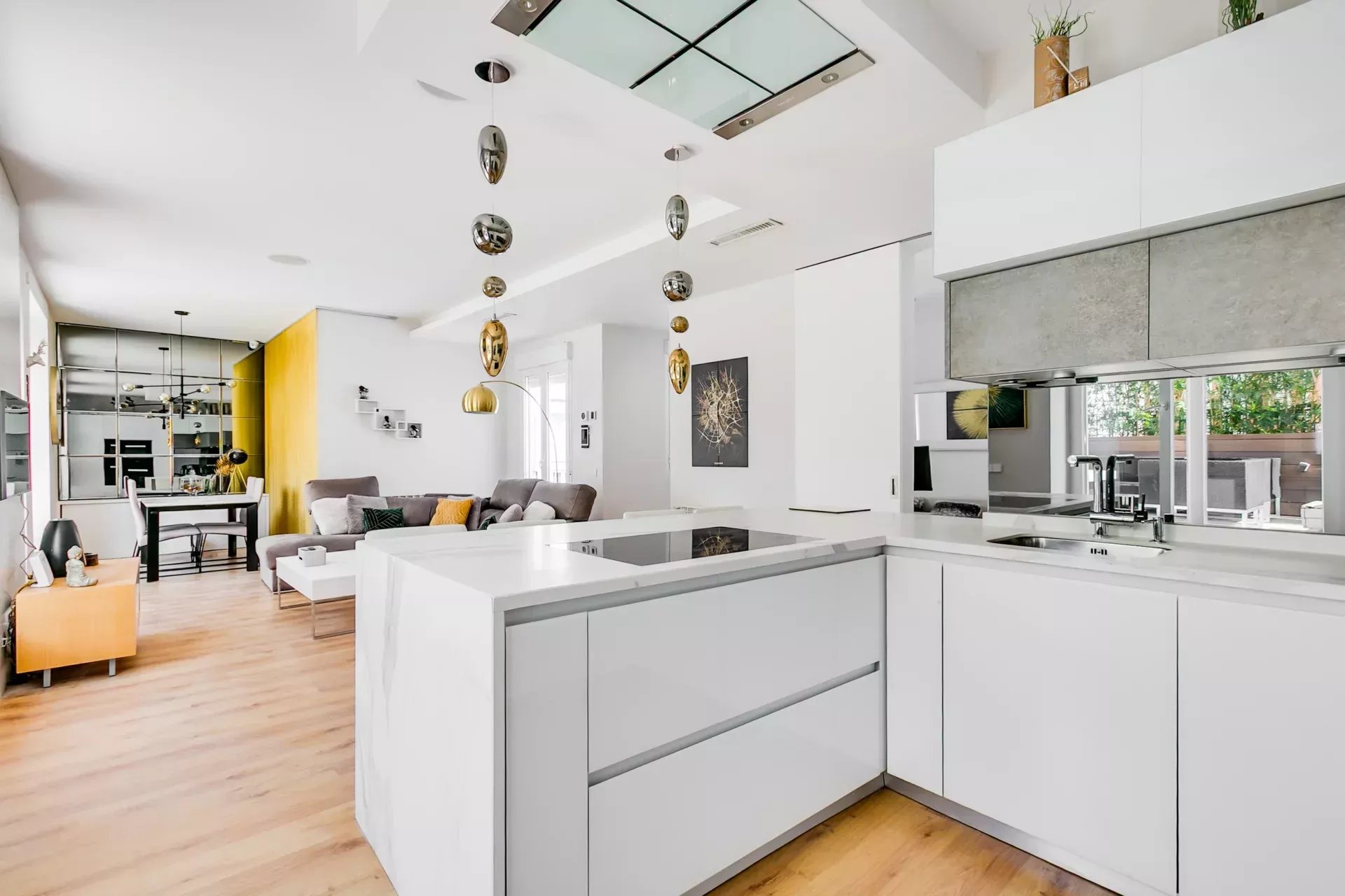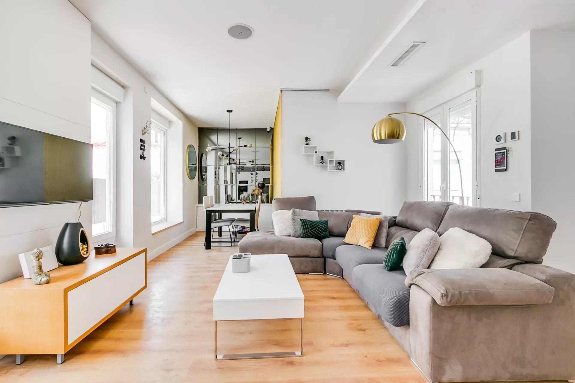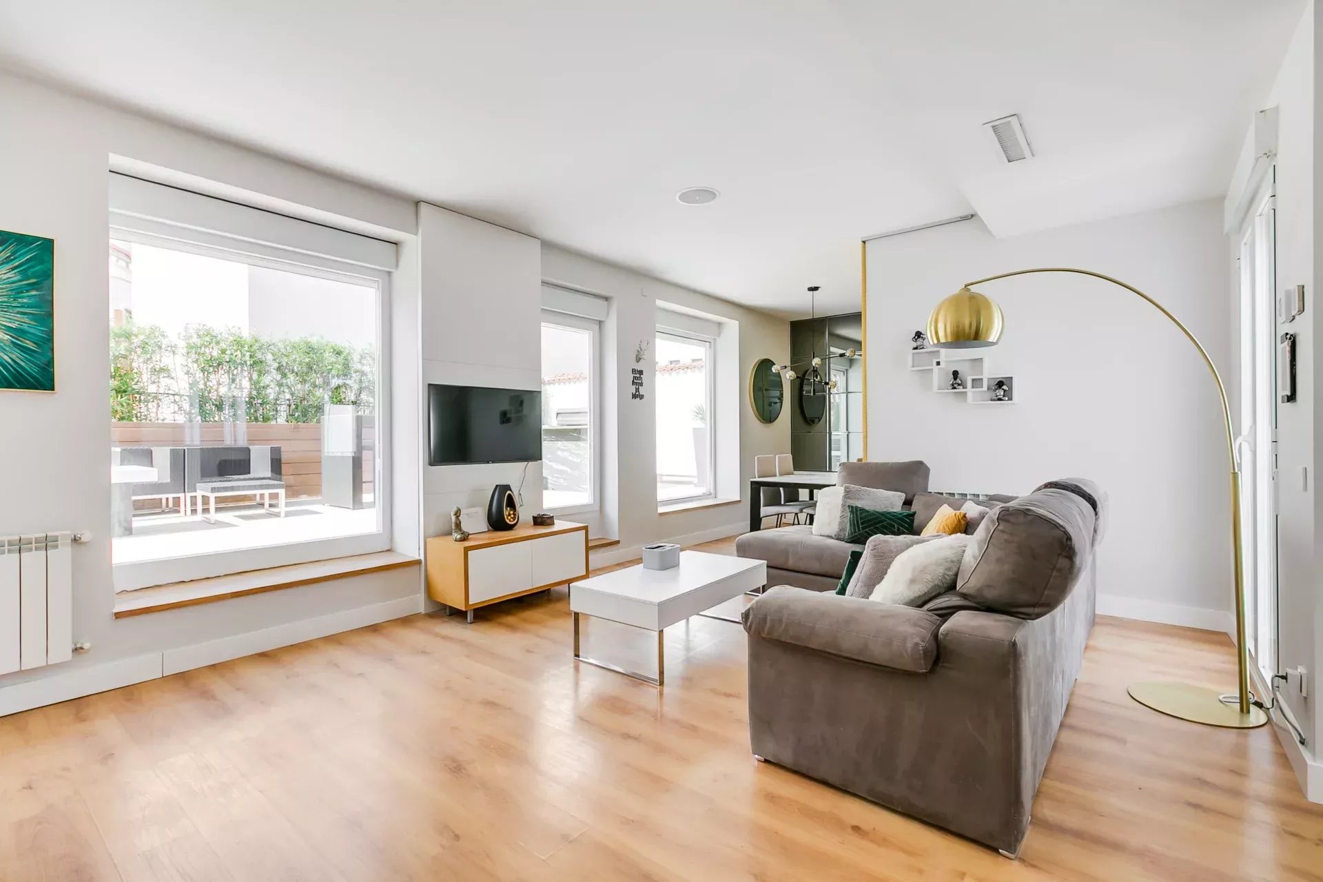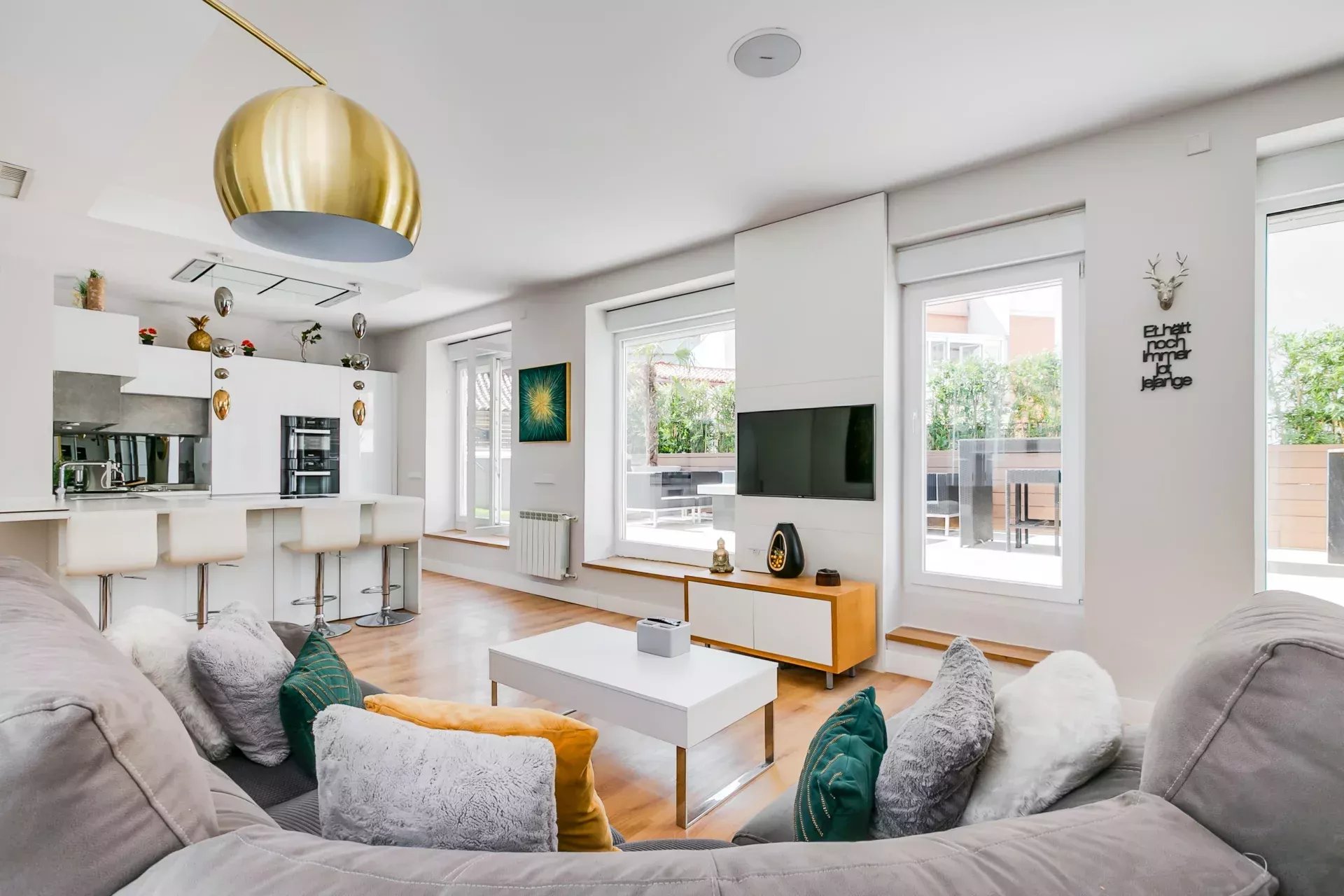 El salón principal con salida directa a la terraza se presenta como el núcleo del hogar, gracias a sus grandes ventanales y su orientación privilegiada, toda la vivienda goza de una luminosidad extraordinaria durante todo el día.