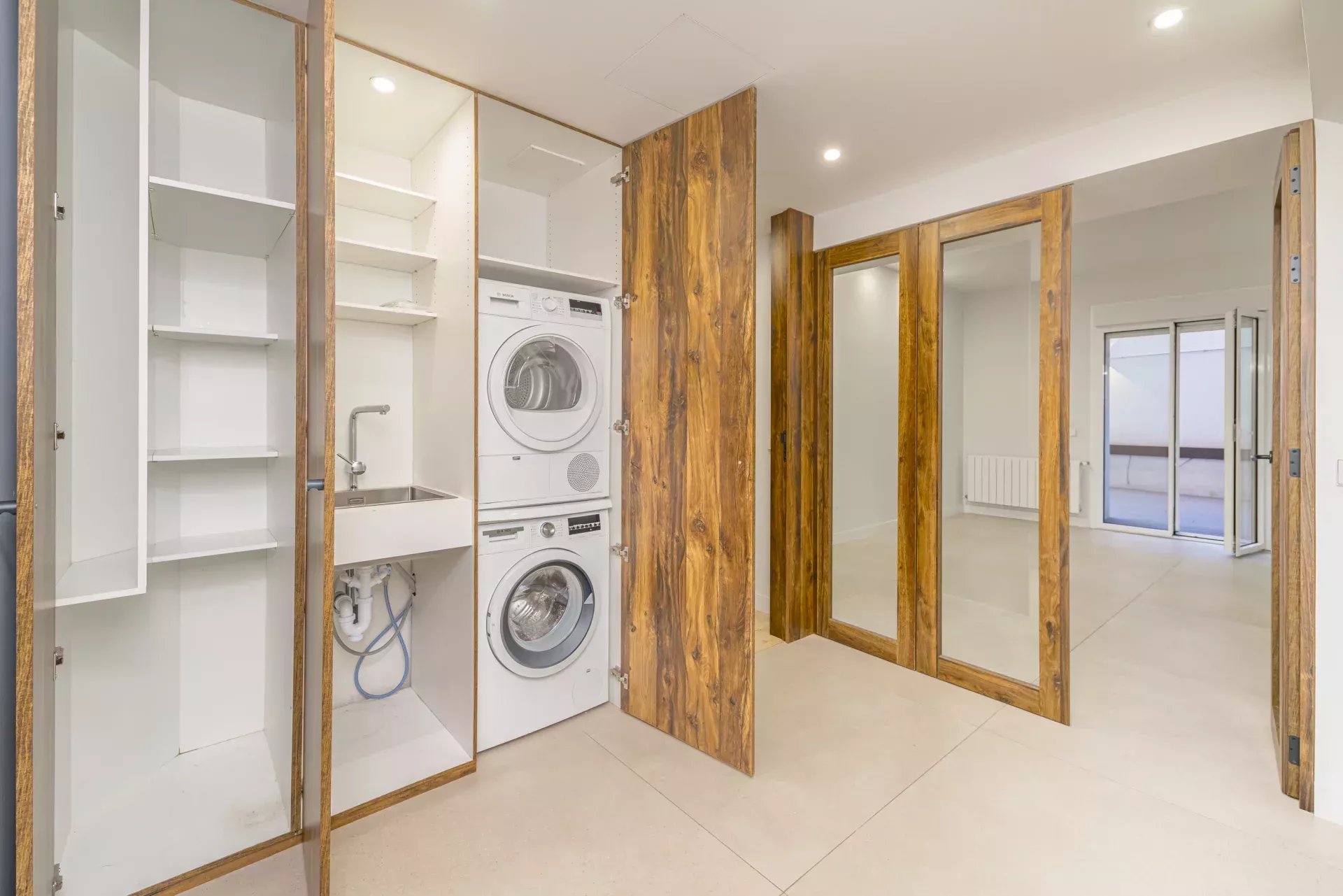 Entre las múltiples comodidades adicionales, la propiedad ofrece aire acondicionado por conductos en todas las estancias, calefacción individual por gas, suelos de madera natural en los dormitorios, techos altos con molduras decorativas y lámparas de diseño que añaden un toque distintivo a cada estancia.