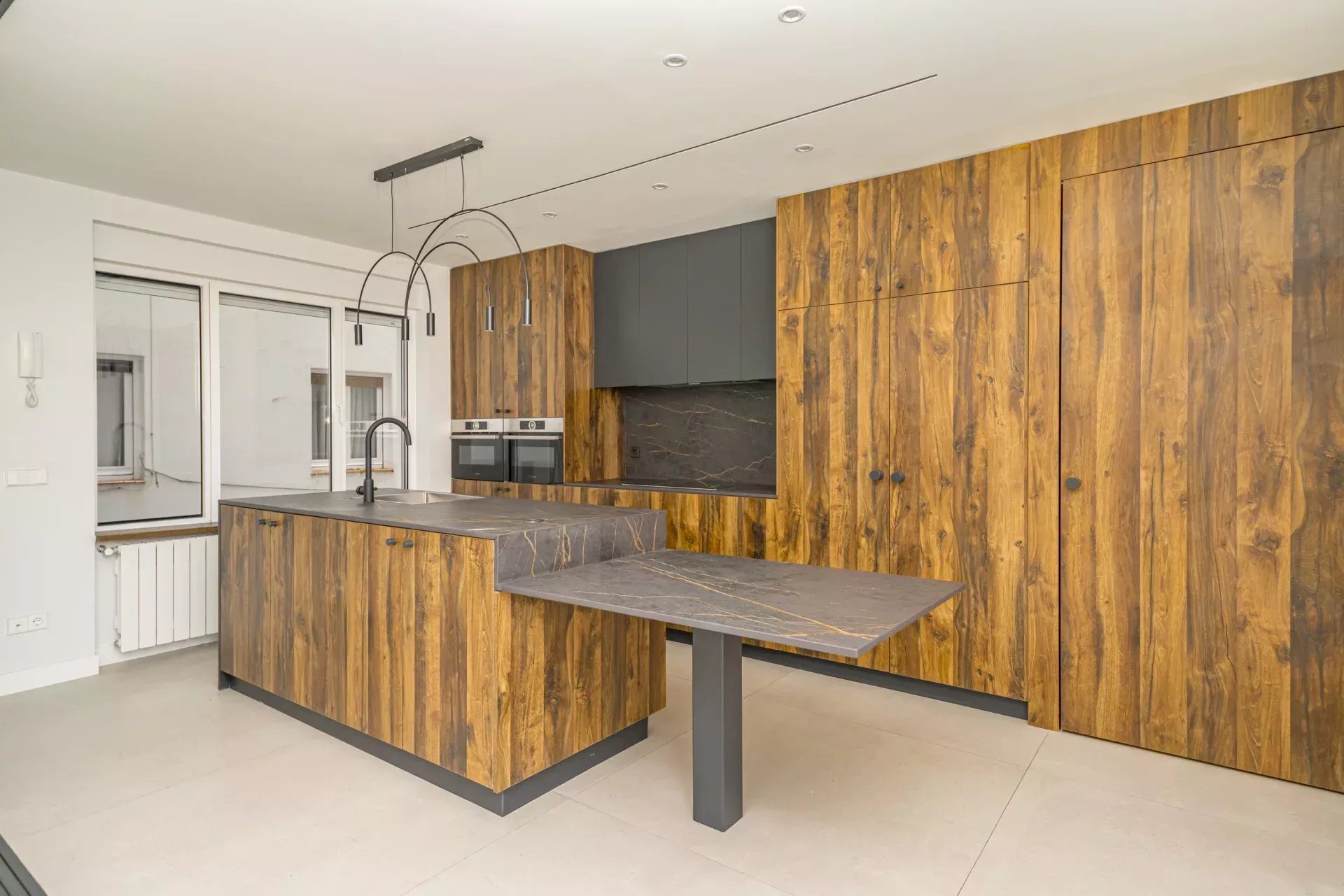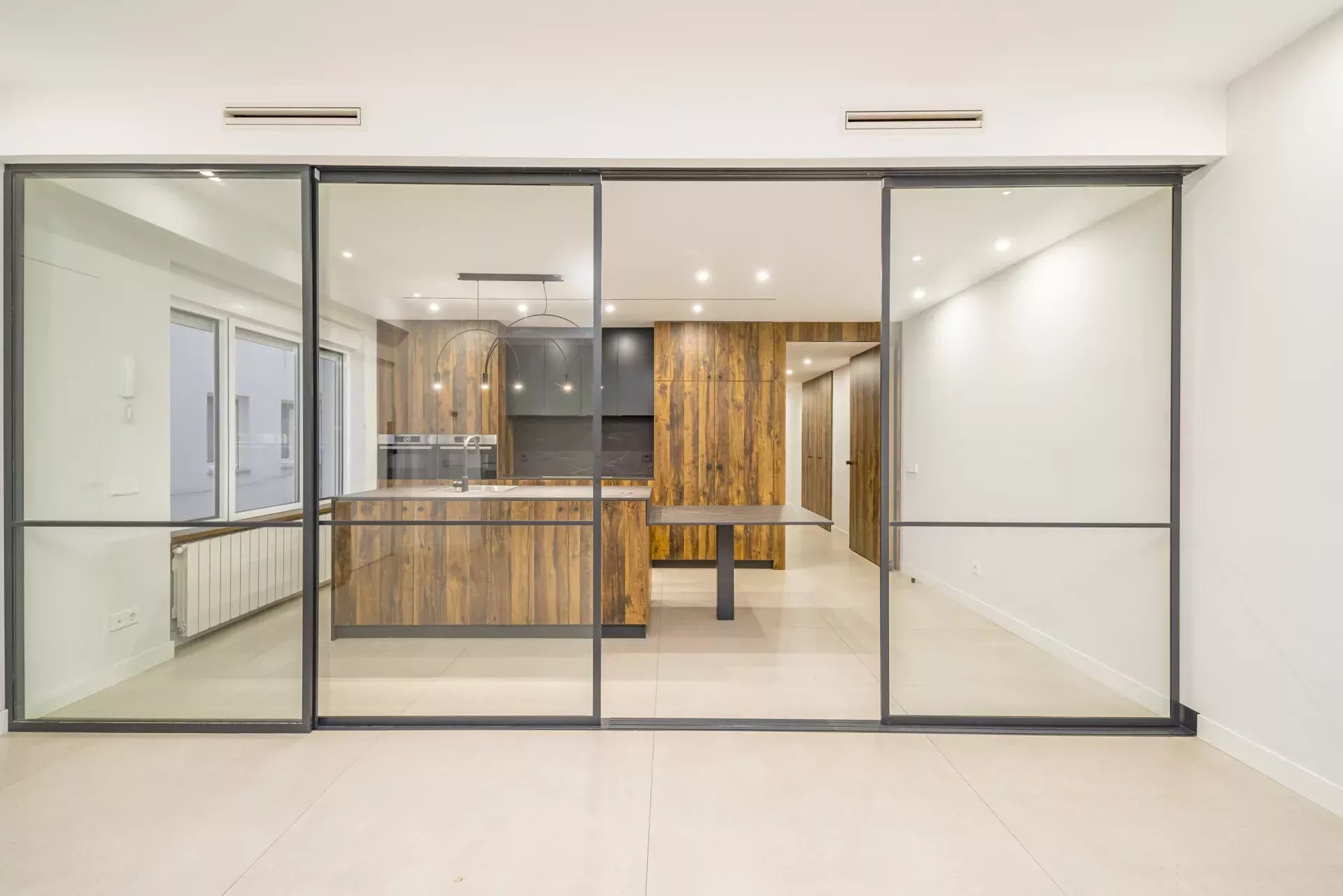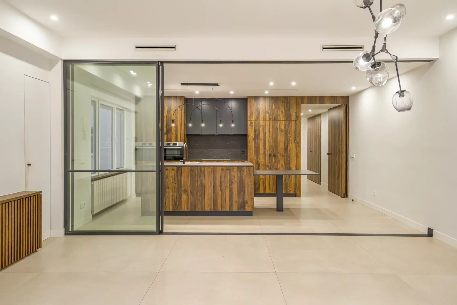 El salón está conectado a una moderna cocina abierta equipada con electrodomésticos de alta gama, incluyendo horno, microondas, nevera, lavavajillas, lavadora y secadora. La cocina, que cuenta con una isla central y una zona de office, puede separarse del salón mediante elegantes puertas correderas de cristal.