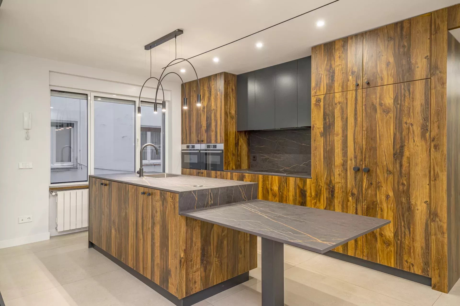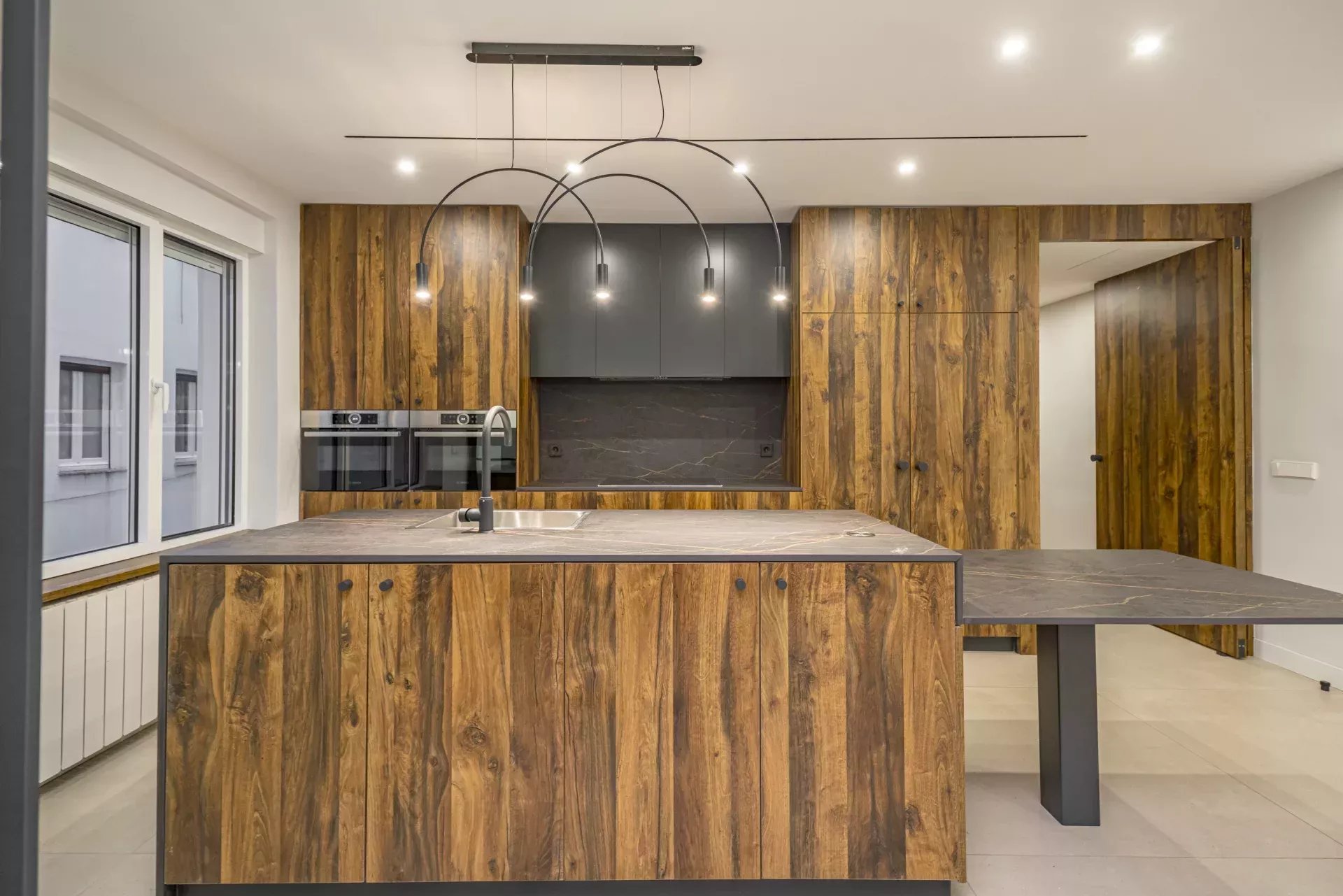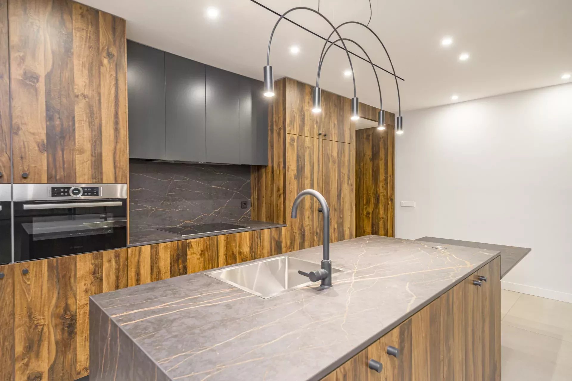 El salón está conectado a una moderna cocina abierta equipada con electrodomésticos de alta gama, incluyendo horno, microondas, nevera, lavavajillas, lavadora y secadora. La cocina, que cuenta con una isla central y una zona de office, puede separarse del salón mediante elegantes puertas correderas de cristal.