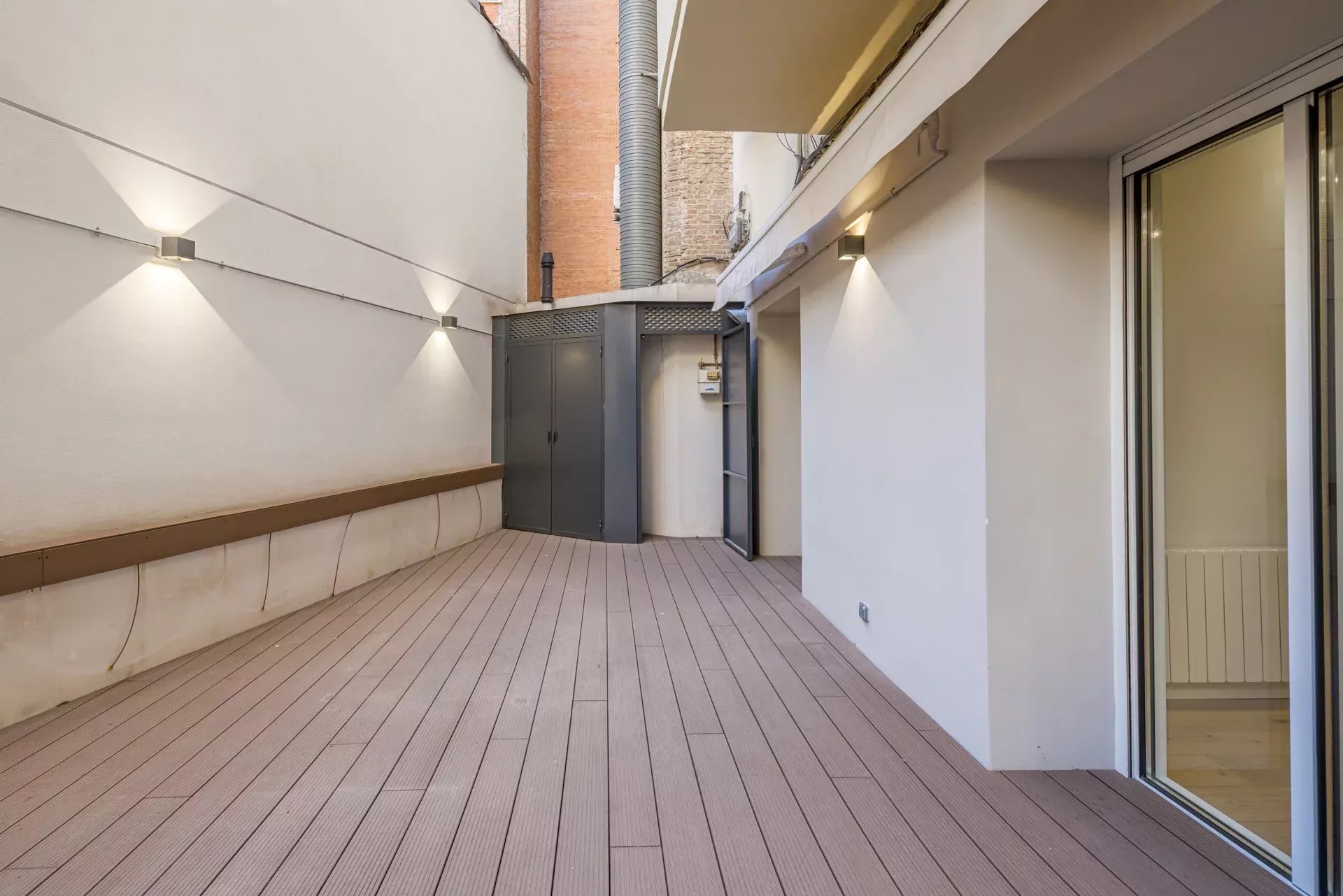 Desde la acogedora sala de estar o despacho, se accede a la magnífica terraza de 28 m², que cuenta con un toldo retráctil con control de viento y suelos de madera tipo deck, ideal para disfrutar de momentos al aire libre.