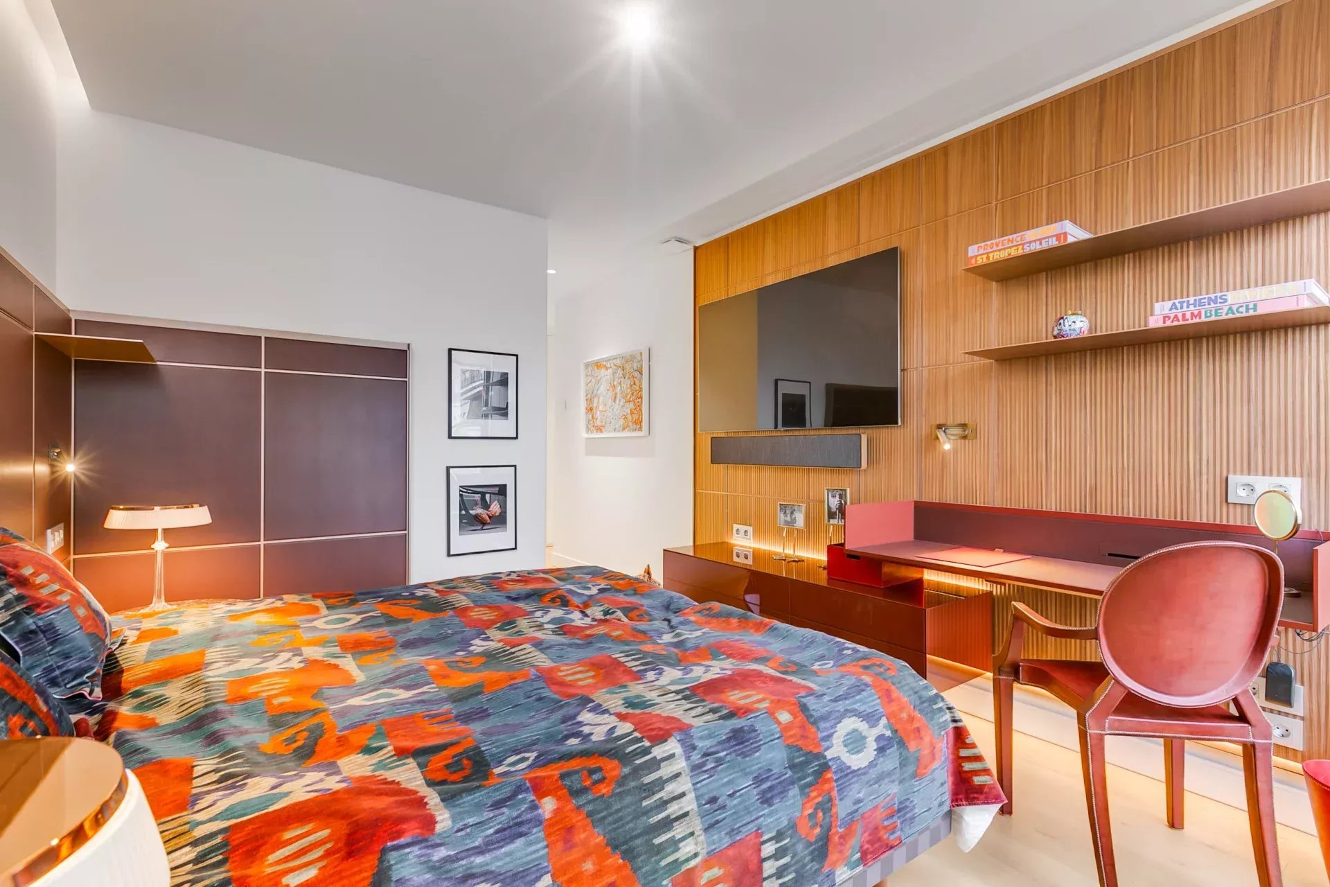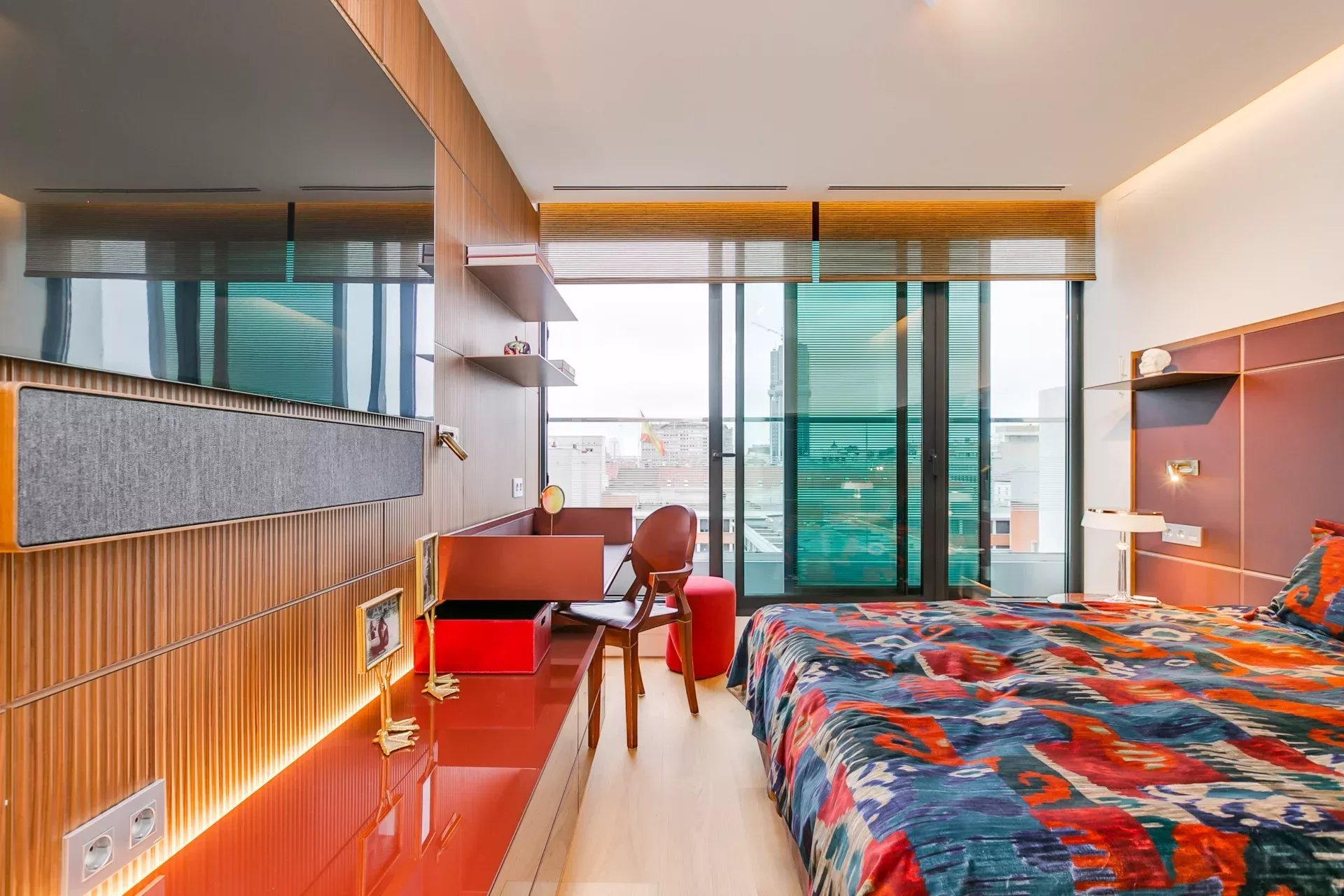 La zona de descanso reúne tres magníficas suites con amplios ventanales y espacios de trabajo; la suite principal incorpora un vestidor de gran capacidad. En total, la vivienda cuenta con tres habitaciones y cuatro baños, y se entrega completamente equipada y amueblada con piezas de diseño seleccionadas por interioristas.