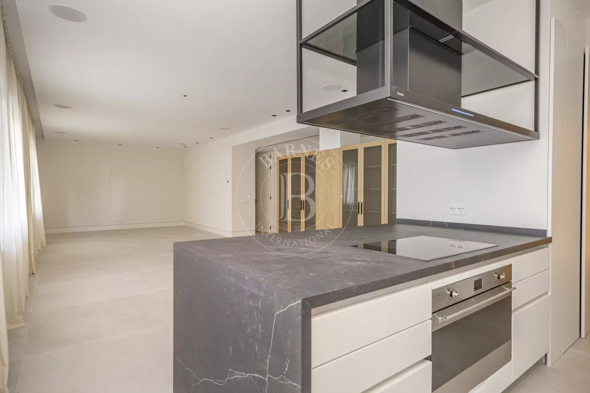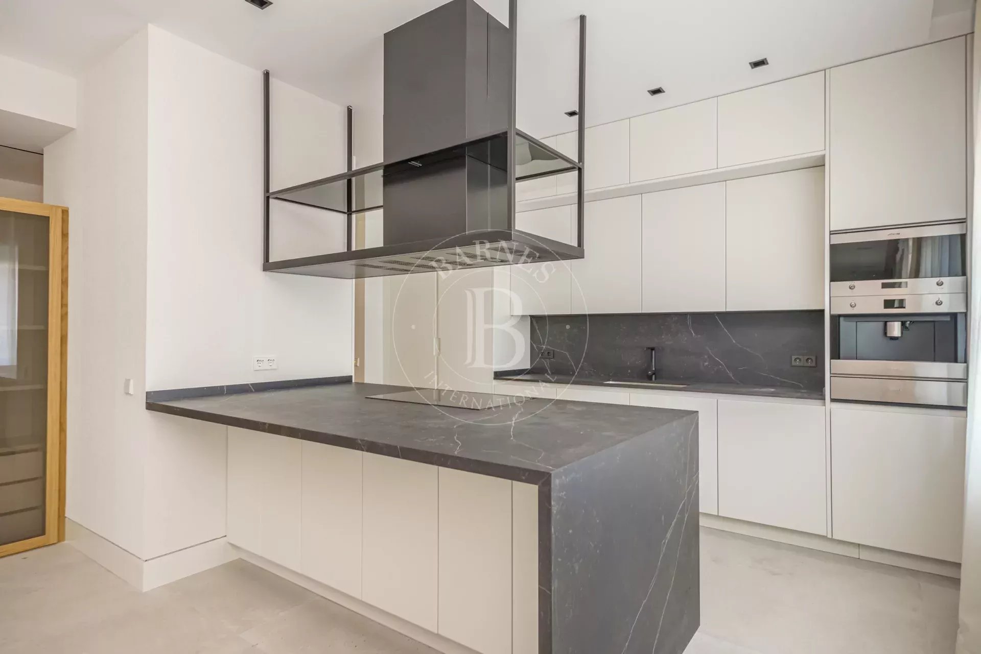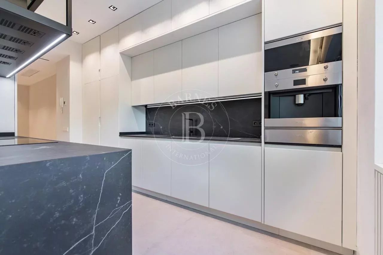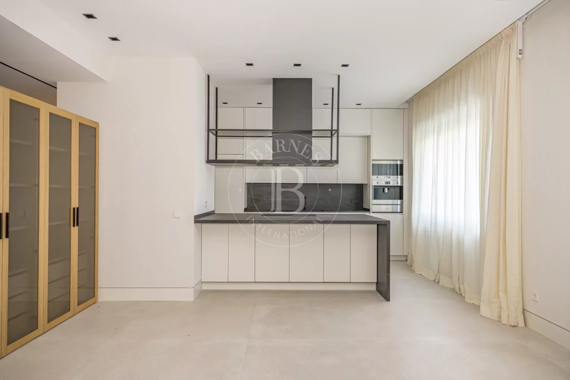 La cocina, concebida como una pieza central del espacio, incorpora una gran isla en Dekton y está equipada con electrodomésticos de alta gama de SMEG, Siemens y Pando. El diseño se completa con mobiliario a medida de gran capacidad de almacenaje y vinoteca integrada de suelo a techo.