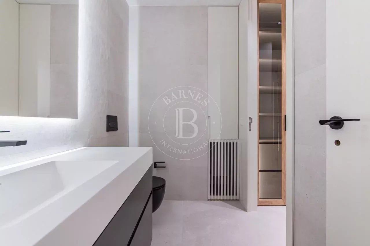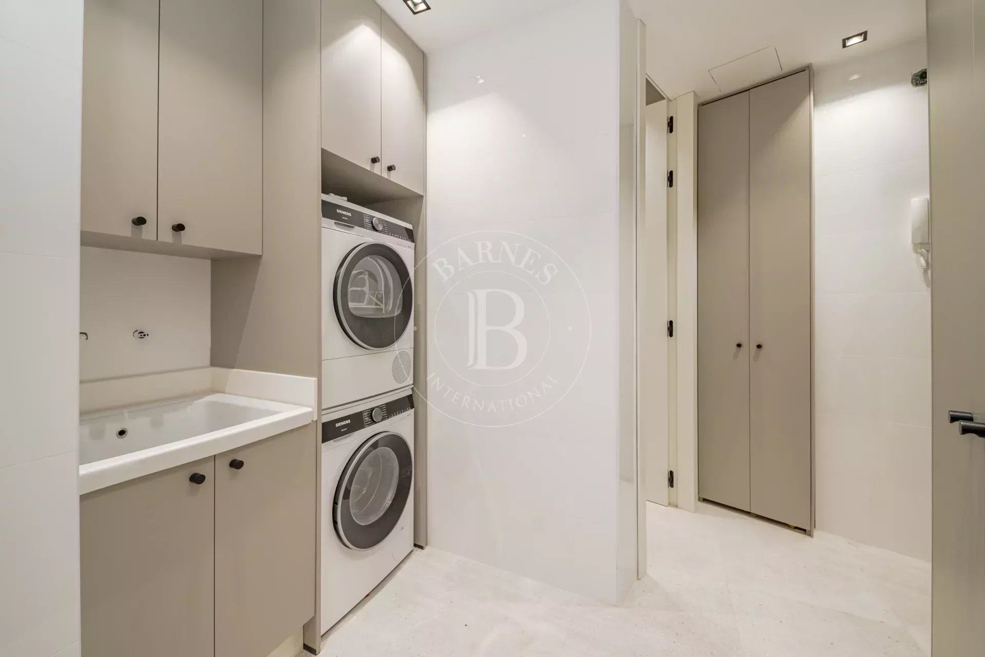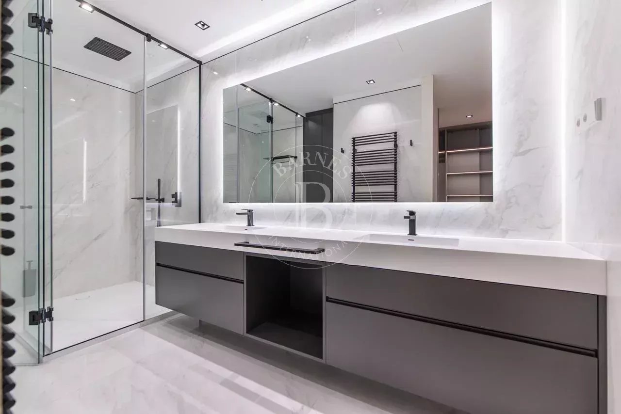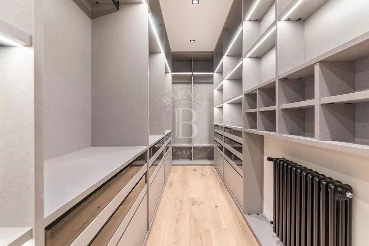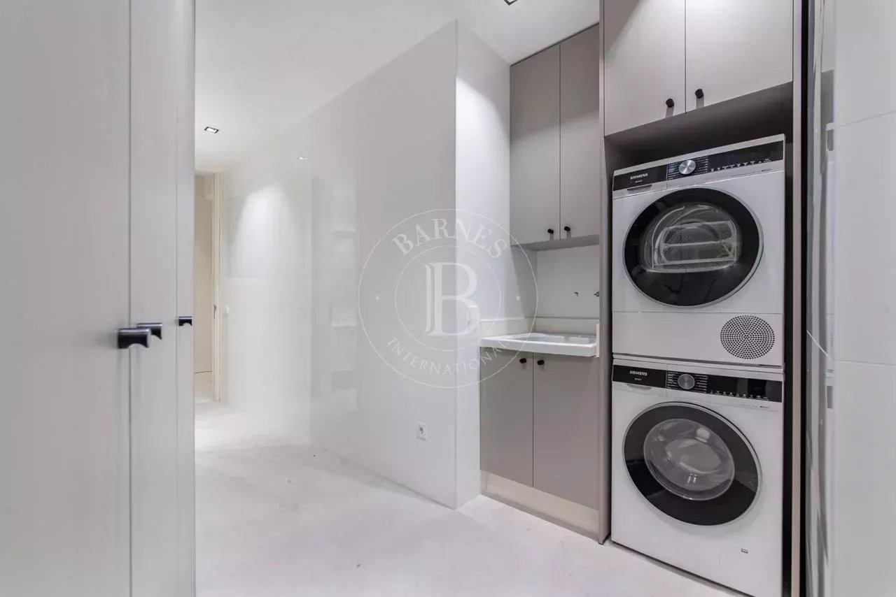 La zona de descanso se compone de cuatro dormitorios dobles en suite, cada uno con vestidor independiente y baño completo revestido en Porcelanosa. La vivienda incluye además un dormitorio de servicio con baño propio y una lavandería independiente totalmente equipada.
