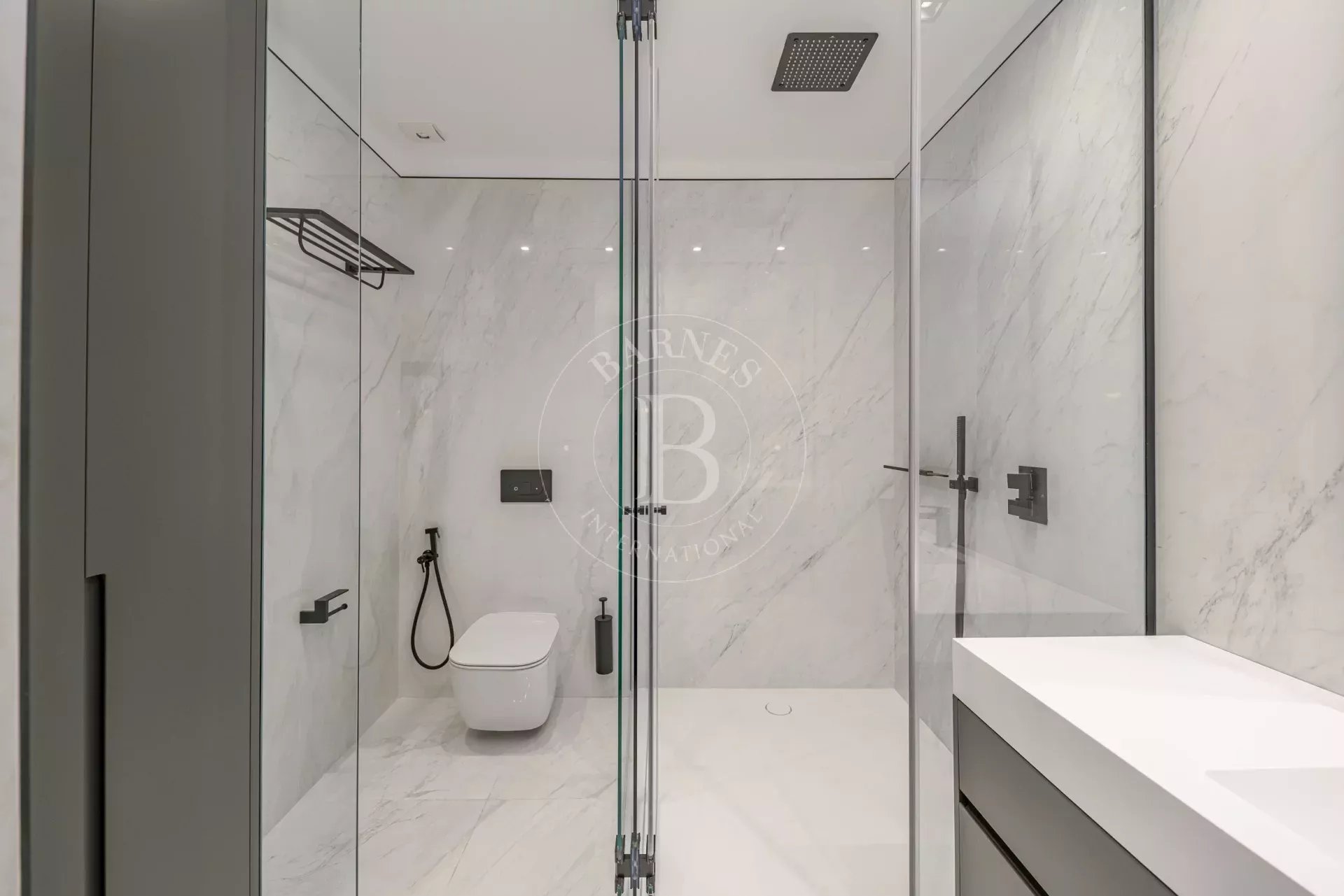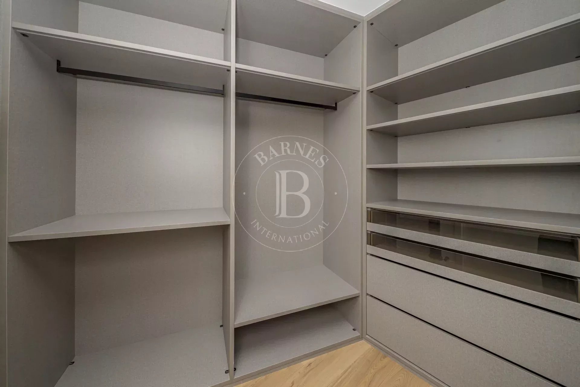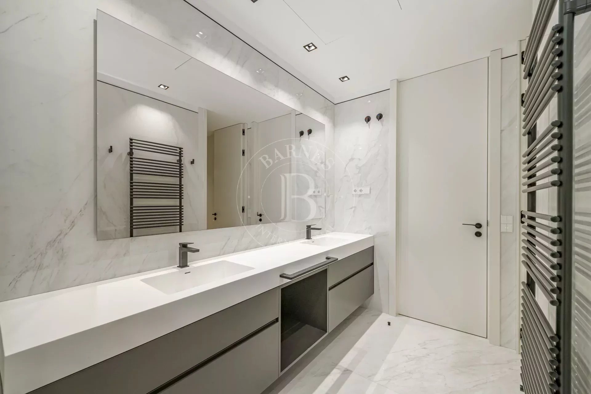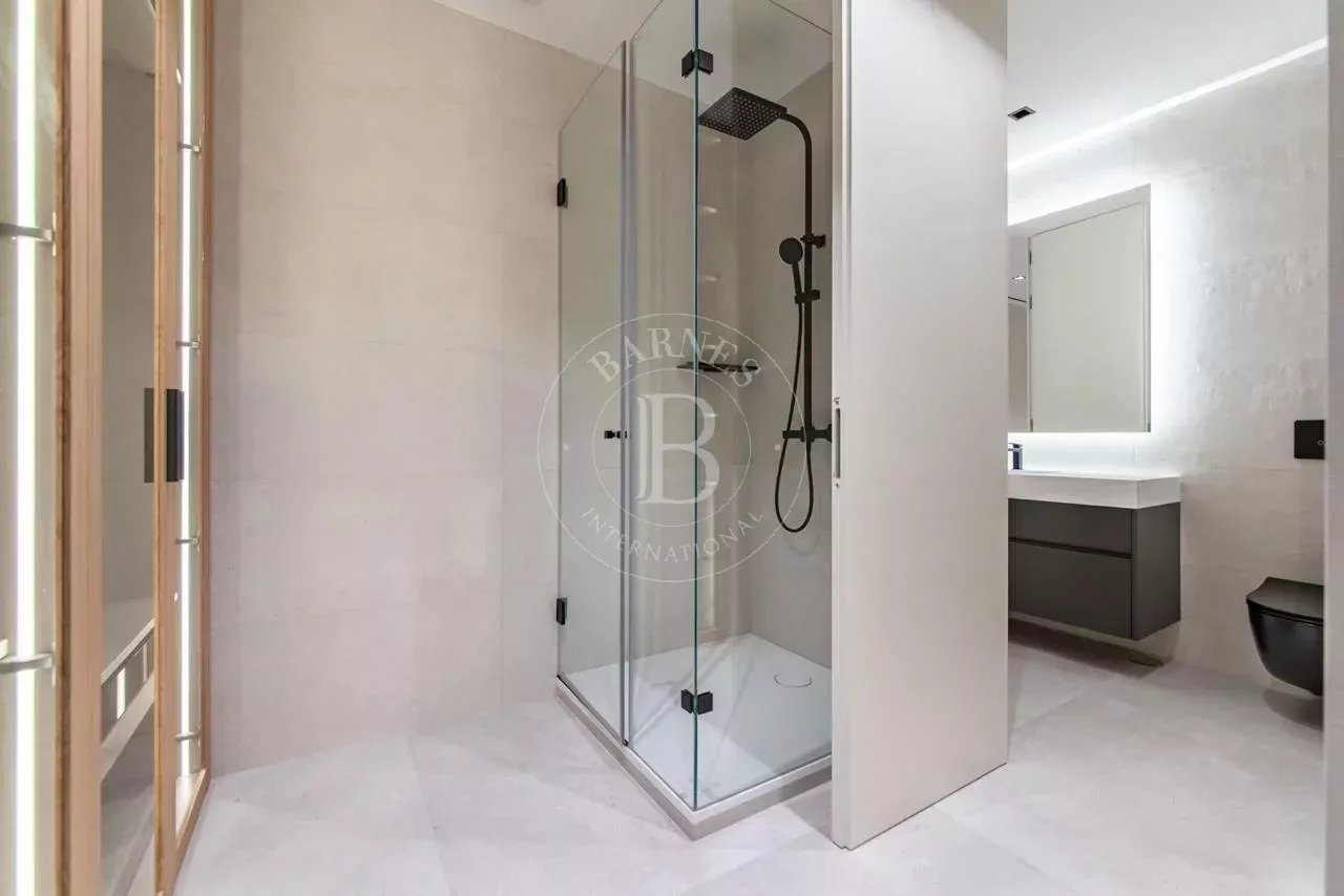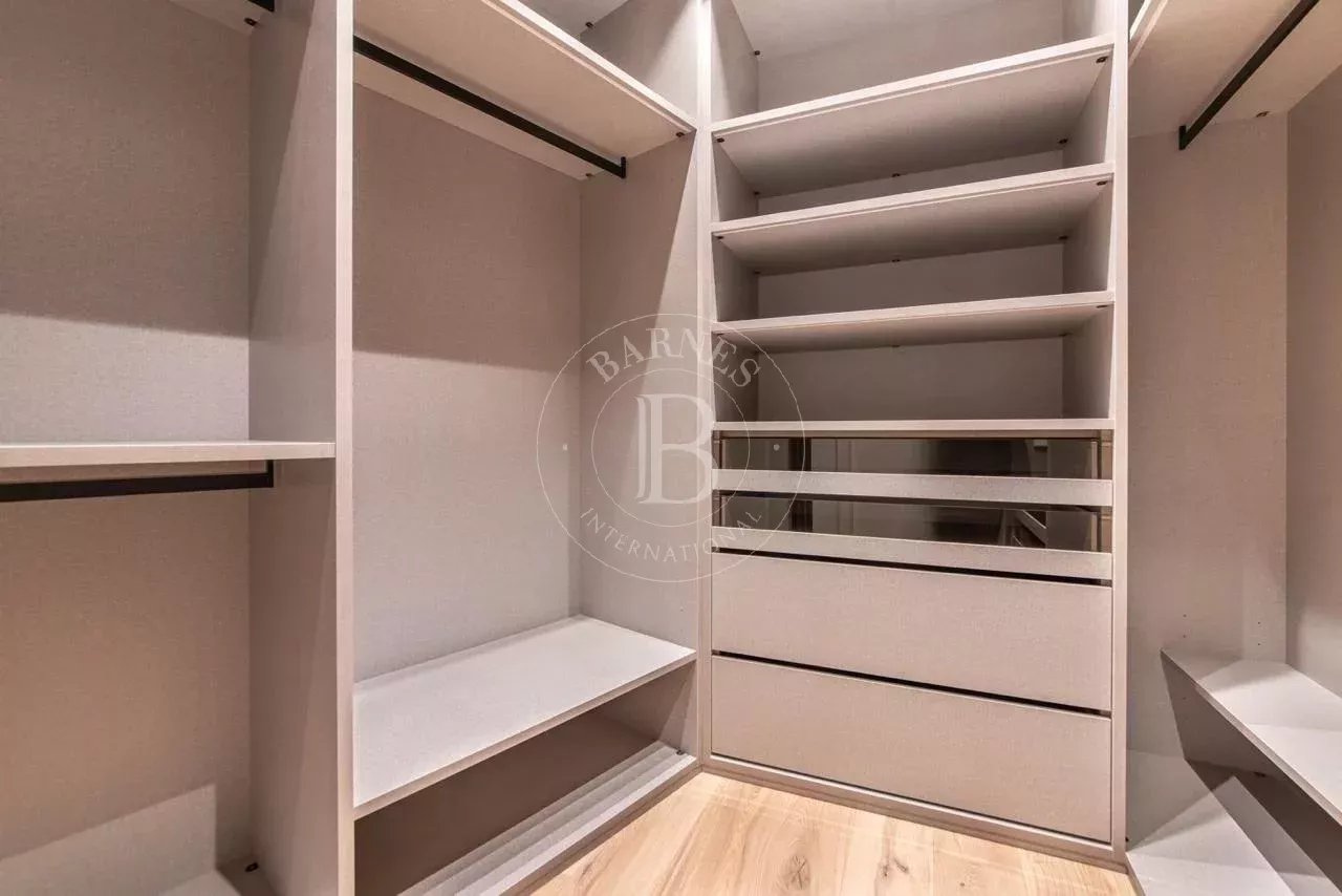 La zona de descanso se compone de cuatro dormitorios dobles en suite, cada uno con vestidor independiente y baño completo revestido en Porcelanosa. La vivienda incluye además un dormitorio de servicio con baño propio y una lavandería independiente totalmente equipada.
