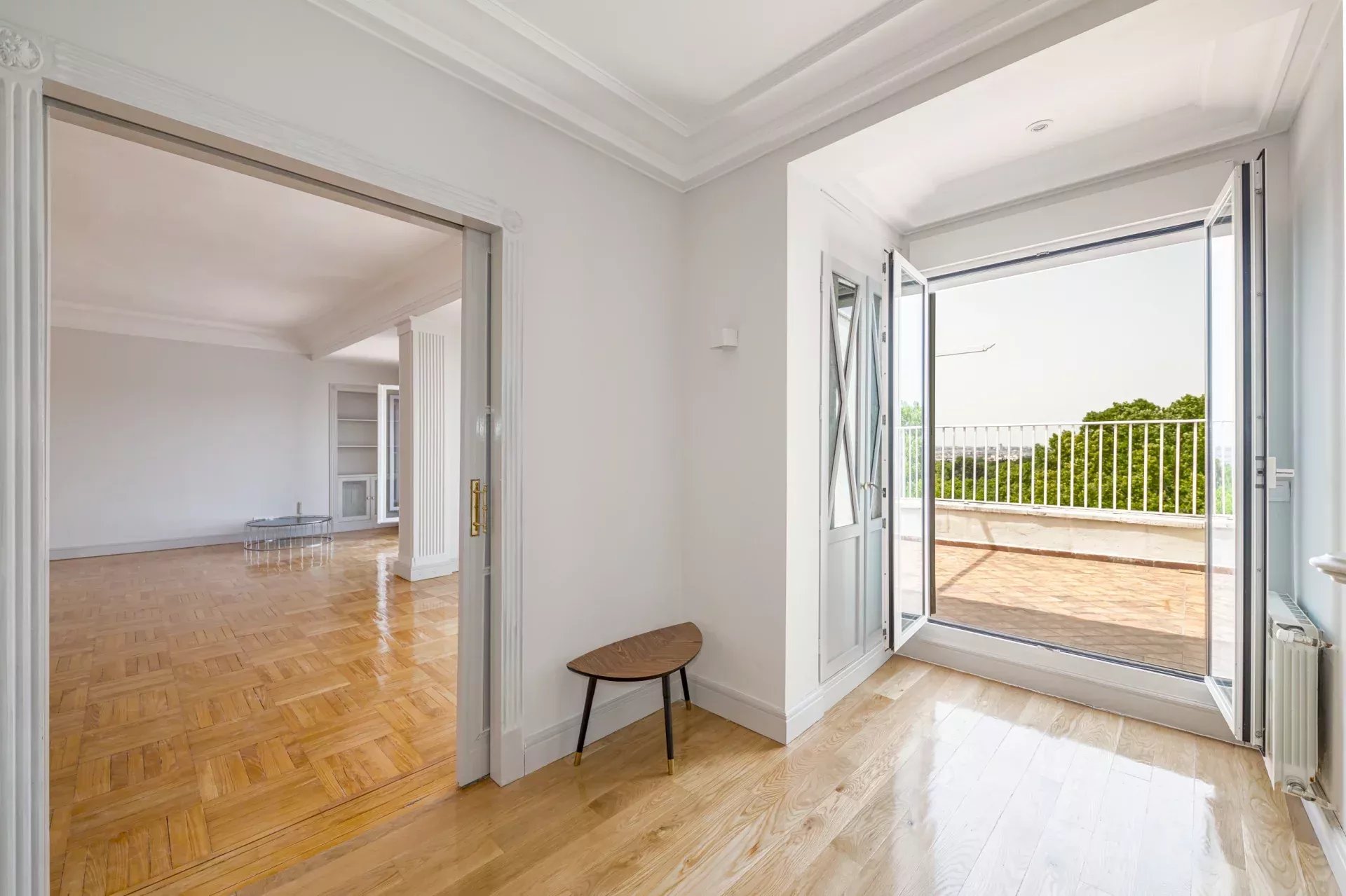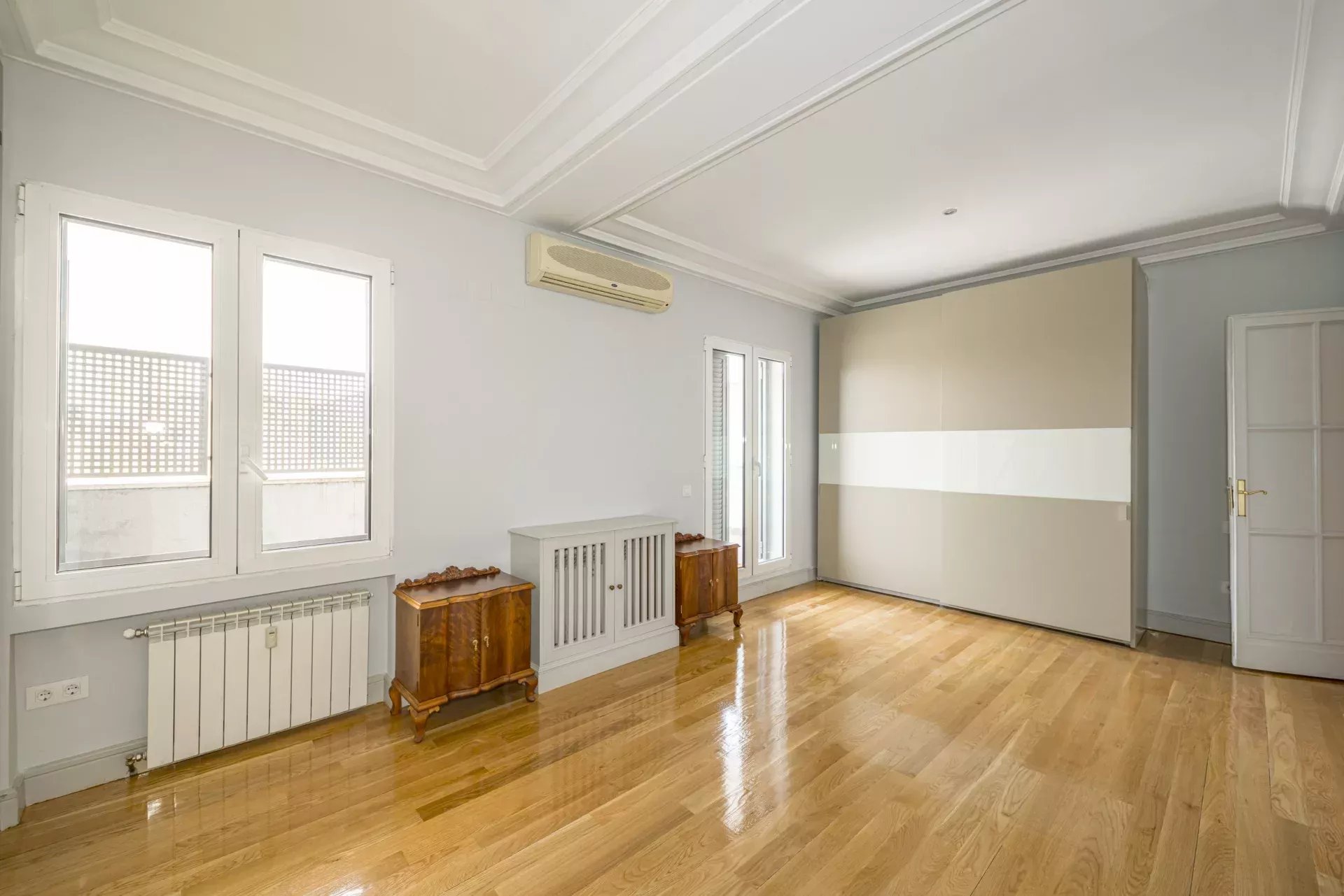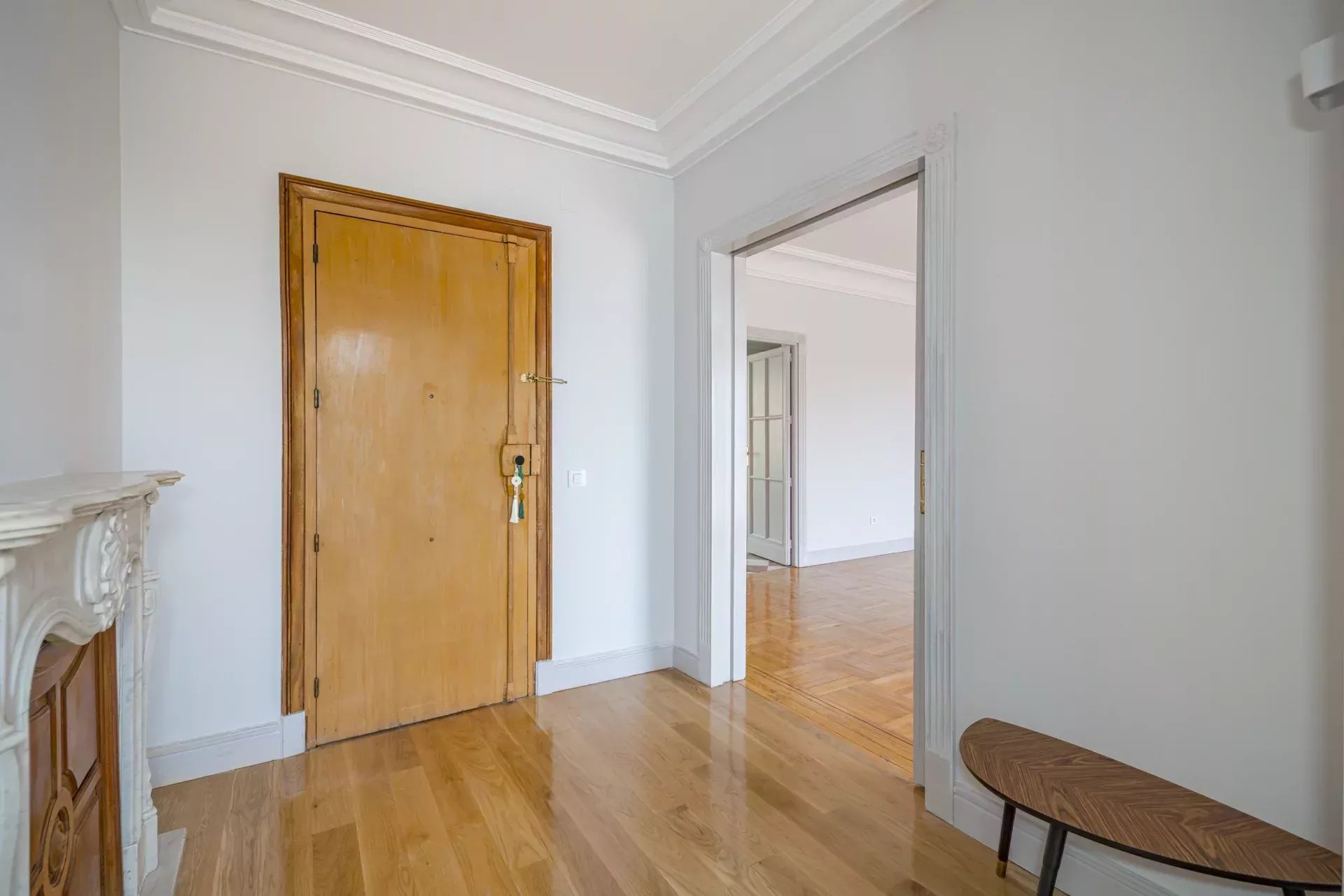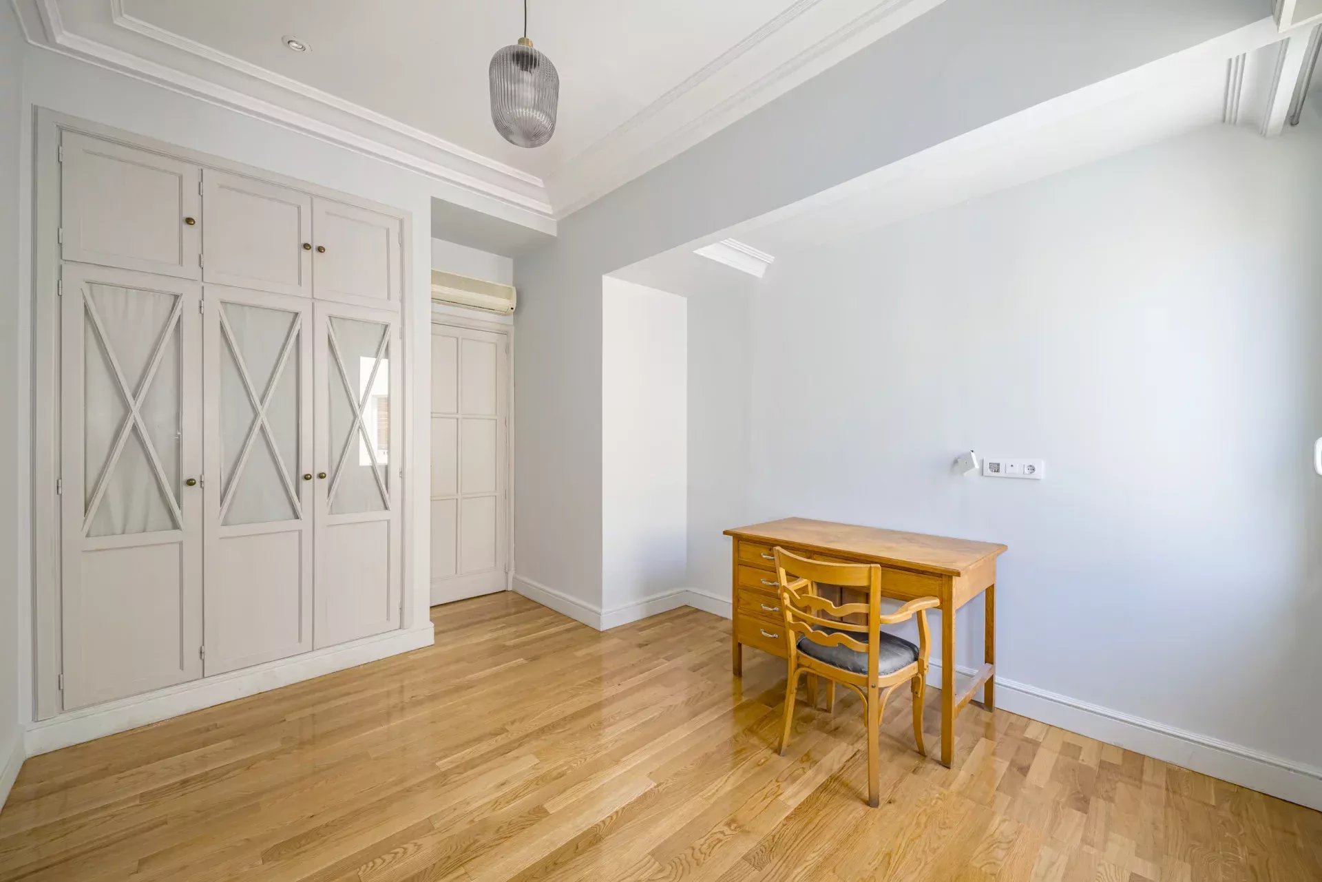 El ático conserva elementos clásicos como suelos de parquet, techos altos con molduras, chimenea de mármol y amplios espacios de almacenamiento. Dispone de aire acondicionado y calefacción central de gas natural, garantizando el confort durante todo el año.