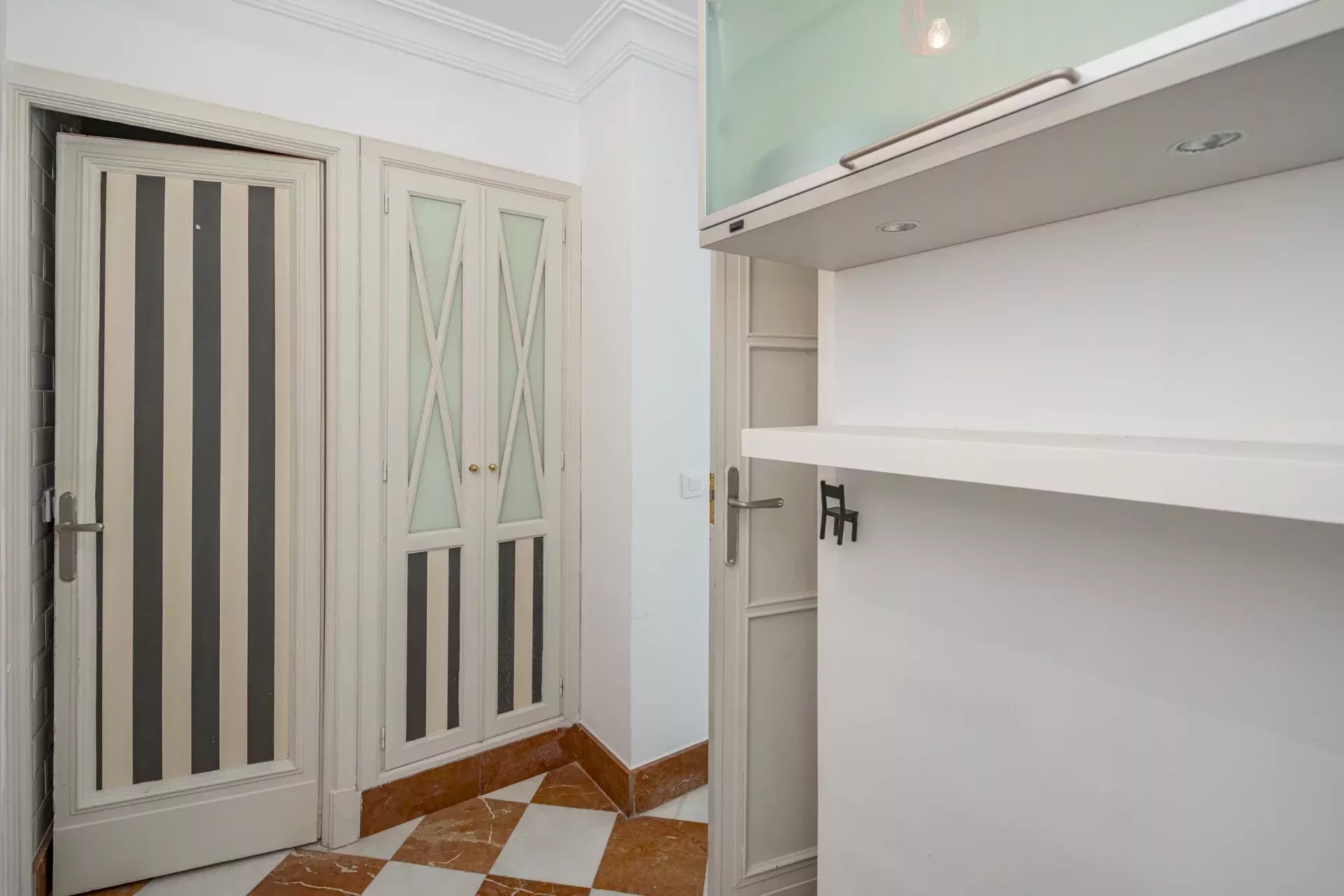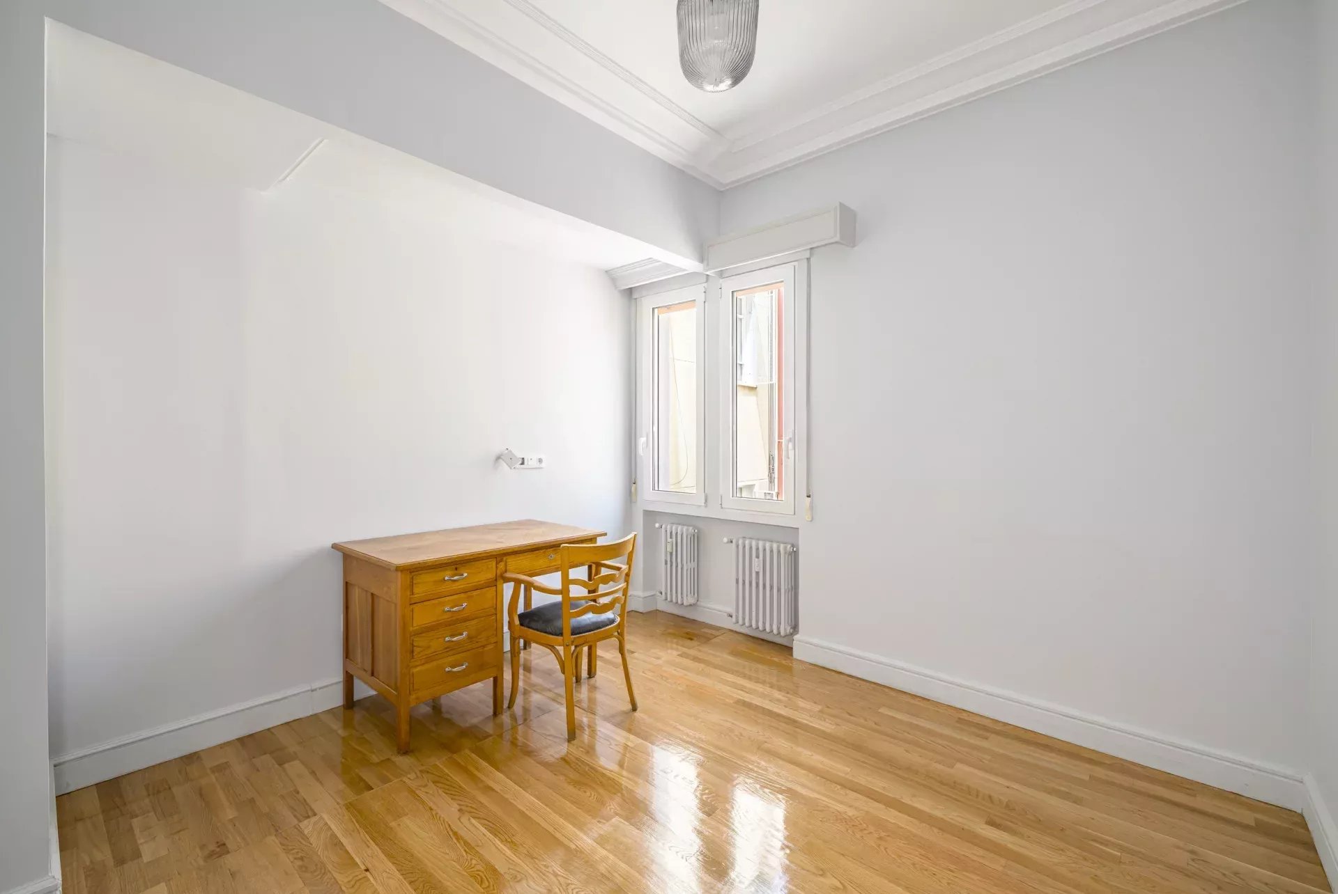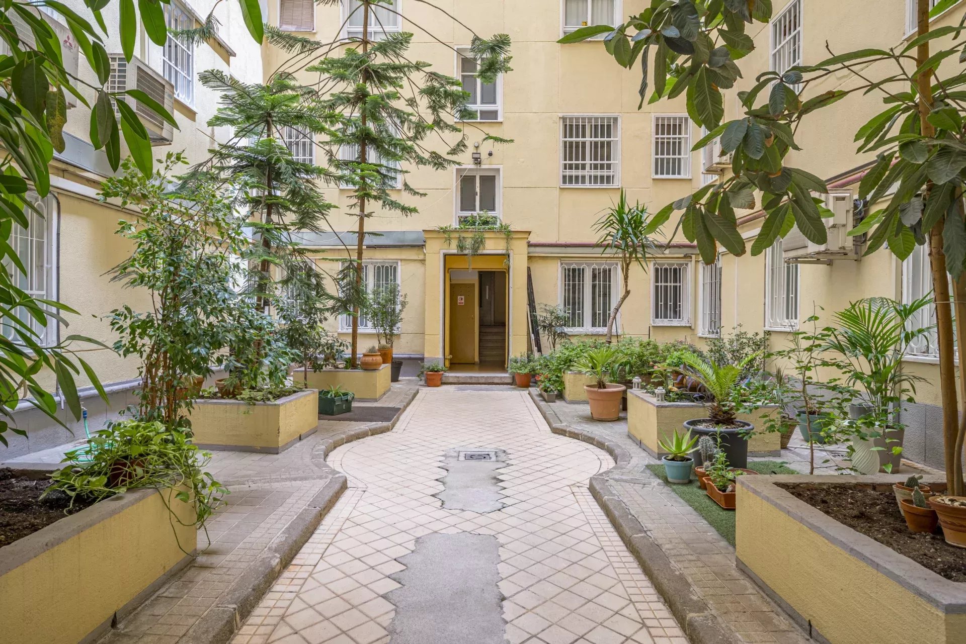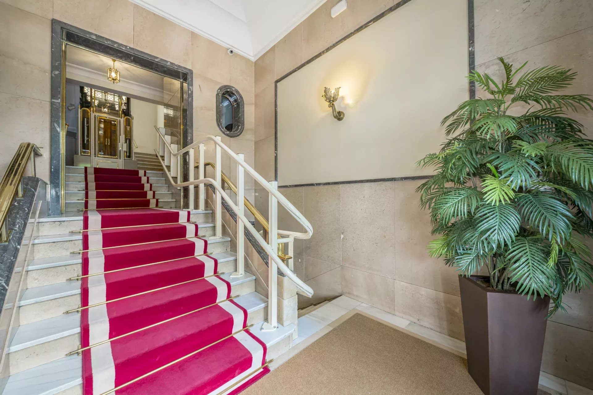 La propiedad se ubica en un edificio señorial de principios del siglo XX, con portal representativo, portero físico, ascensor de estilo parisino, patio comunitario ajardinado, cámaras de videovigilancia y puerta de servicio con acceso a montacargas.