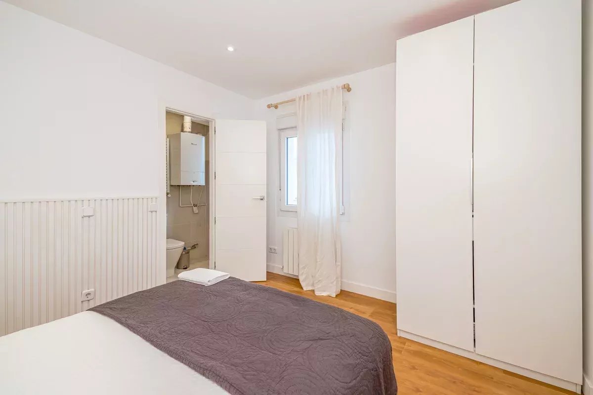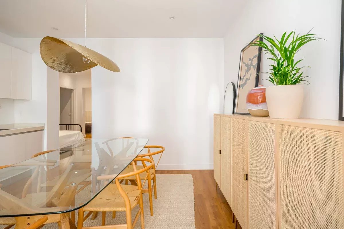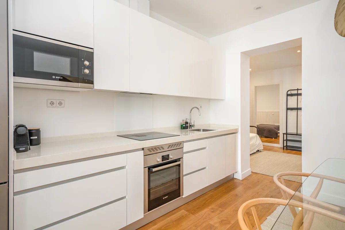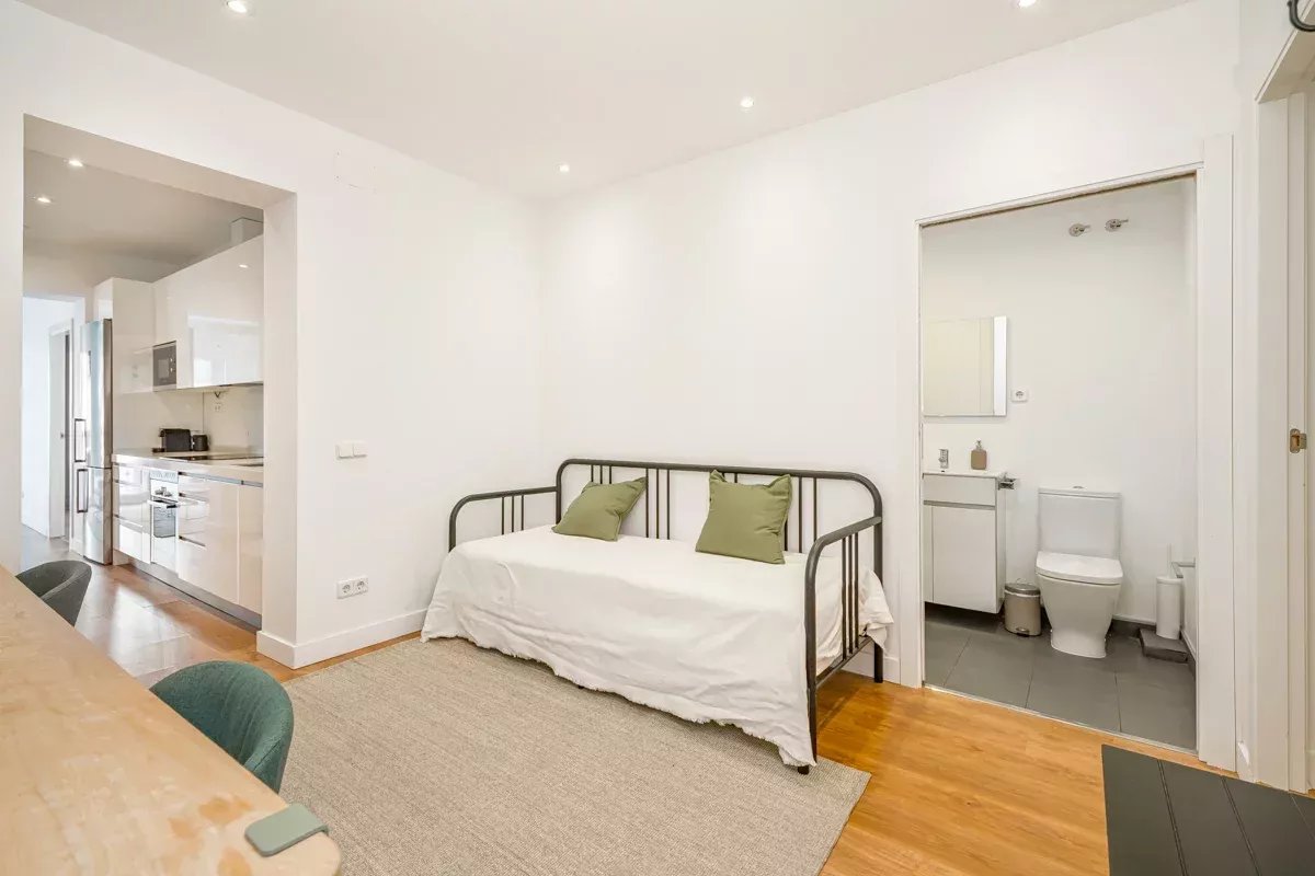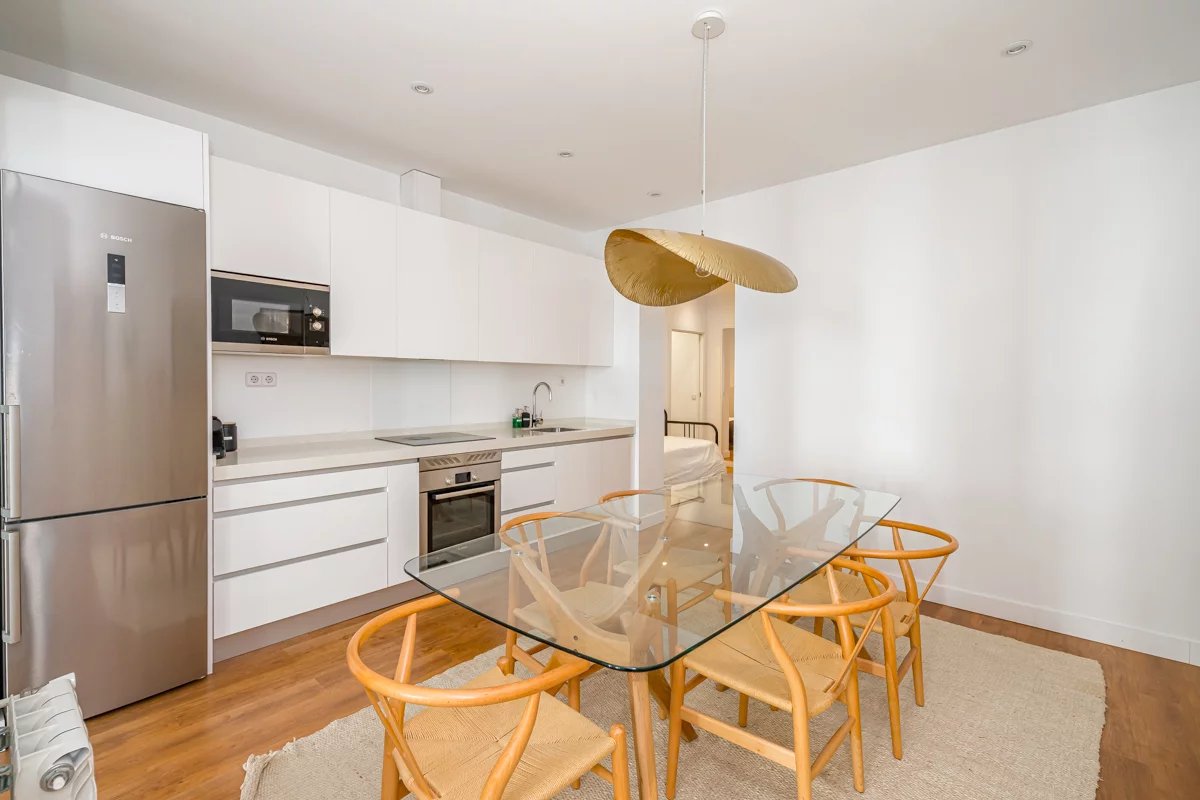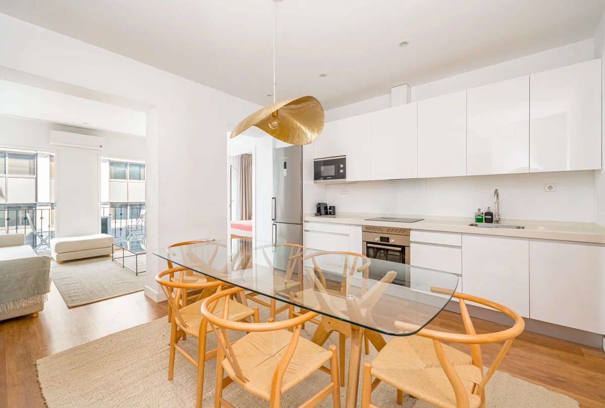 La cocina, equipada con electrodomésticos Bosch de alta gama, se integra en un único ambiente con el comedor y el salón, generando un espacio abierto, luminoso y acogedor. Desde el salón se accede a dos balcones exteriores, mientras que el dormitorio principal dispone de un tercer balcón, permitiendo disfrutar de abundante luz natural y vistas a la vibrante vida urbana del barrio.
