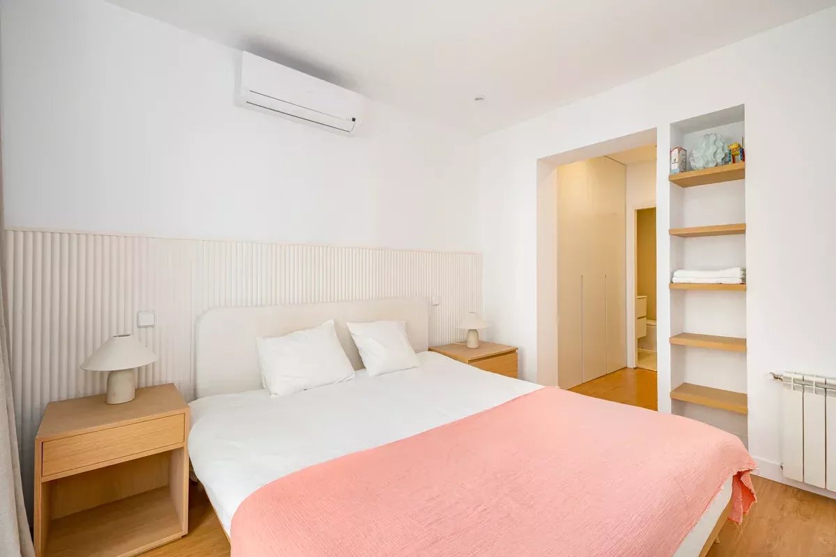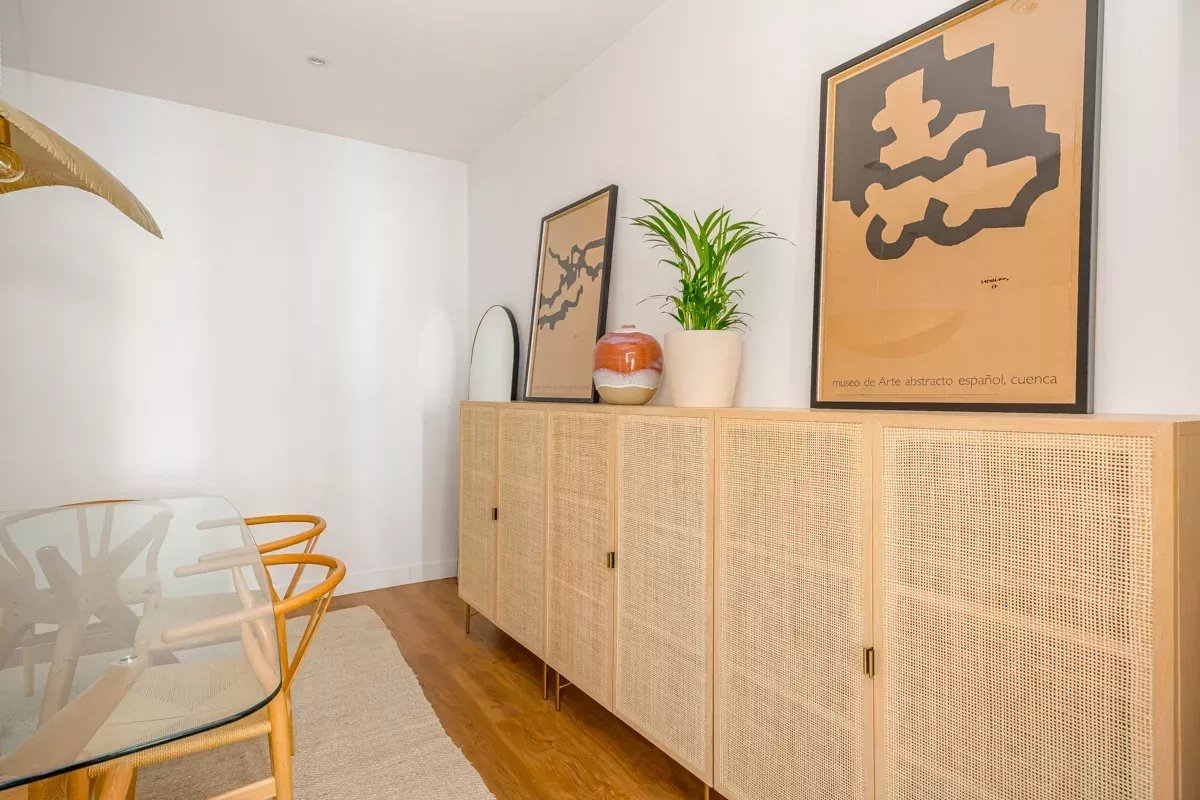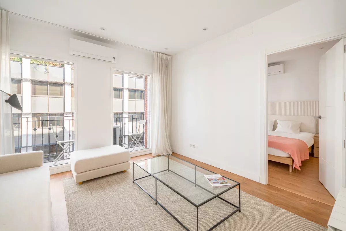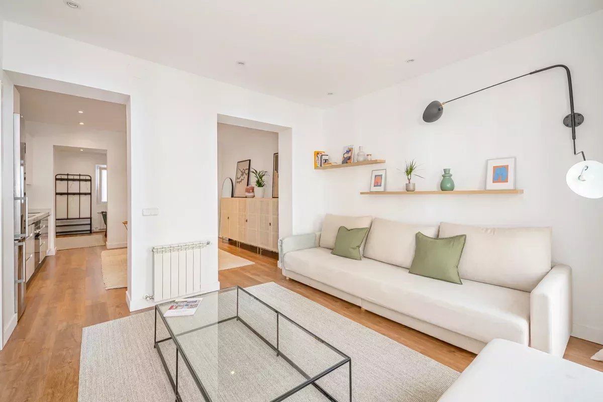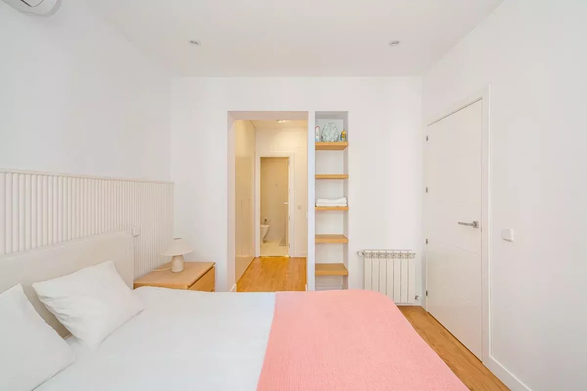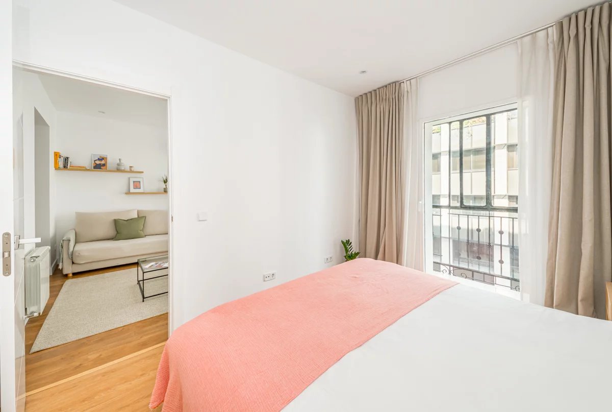La cocina, equipada con electrodomésticos Bosch de alta gama, se integra en un único ambiente con el comedor y el salón, generando un espacio abierto, luminoso y acogedor. Desde el salón se accede a dos balcones exteriores, mientras que el dormitorio principal dispone de un tercer balcón, permitiendo disfrutar de abundante luz natural y vistas a la vibrante vida urbana del barrio.
