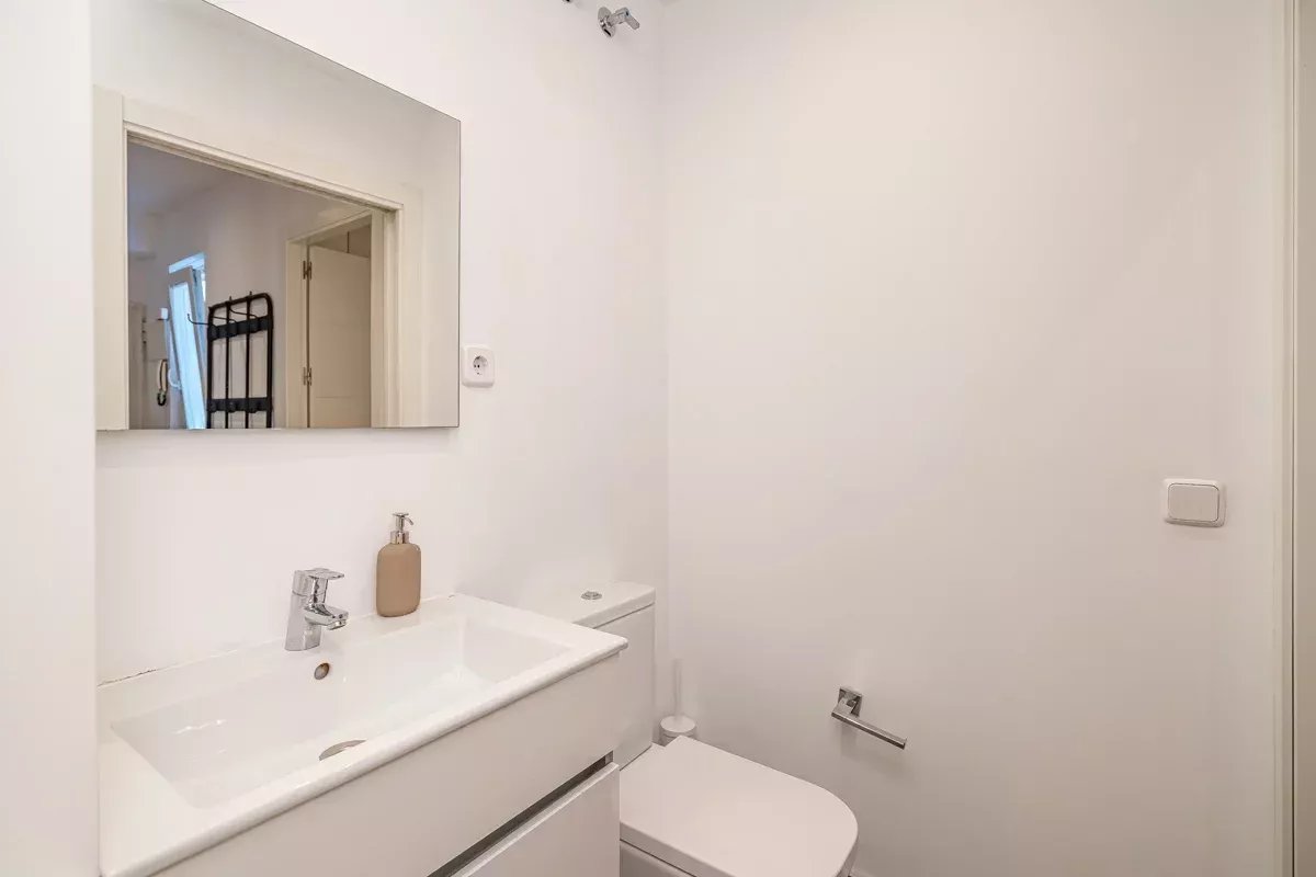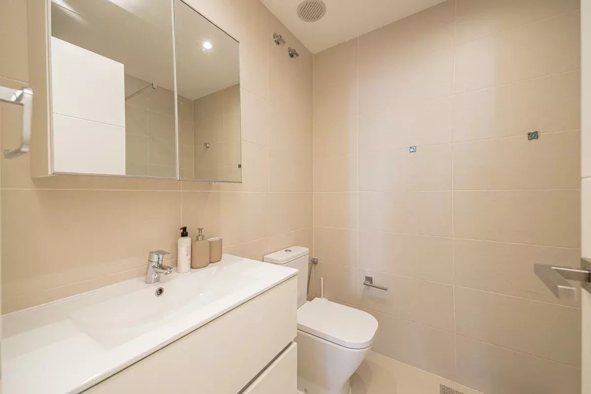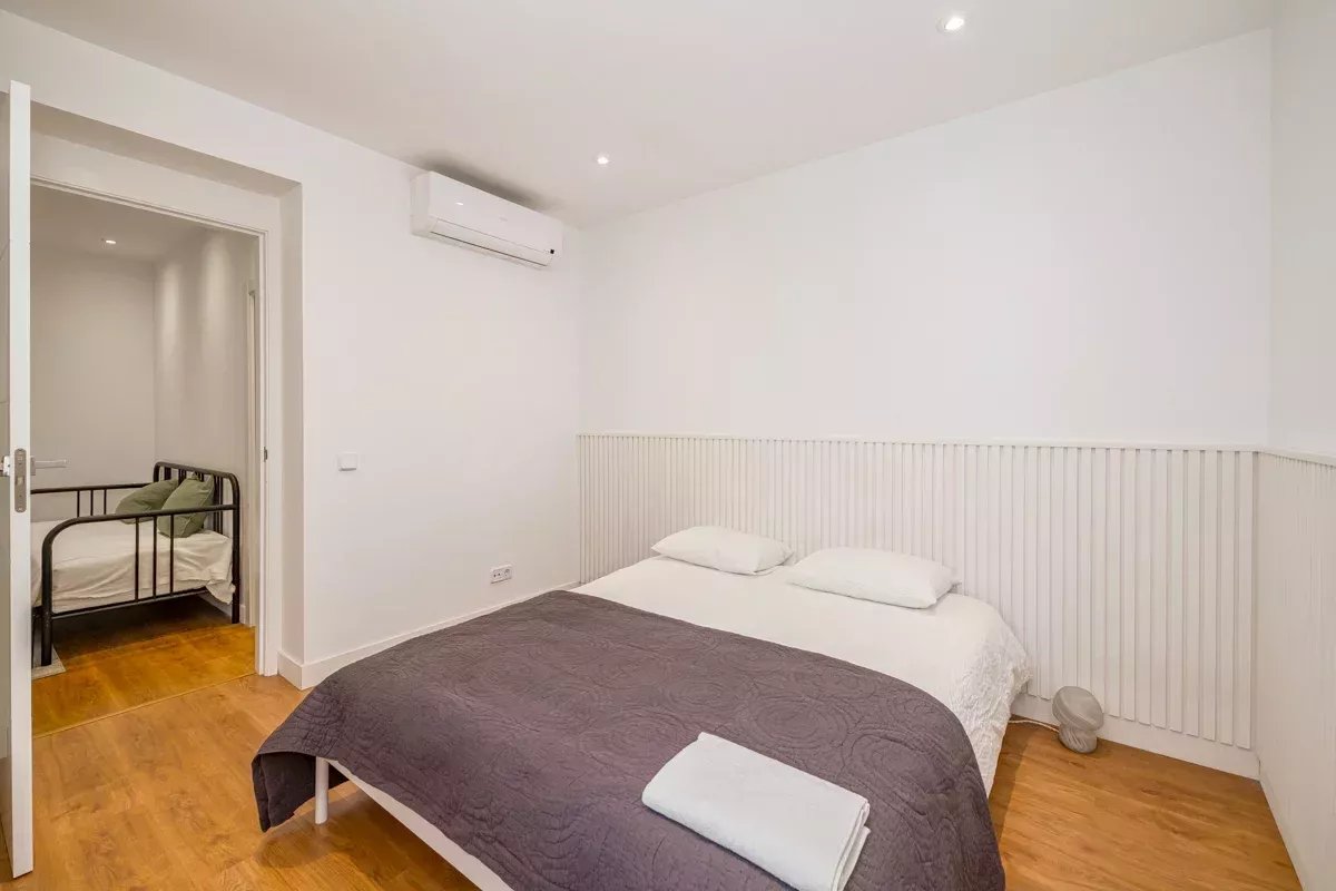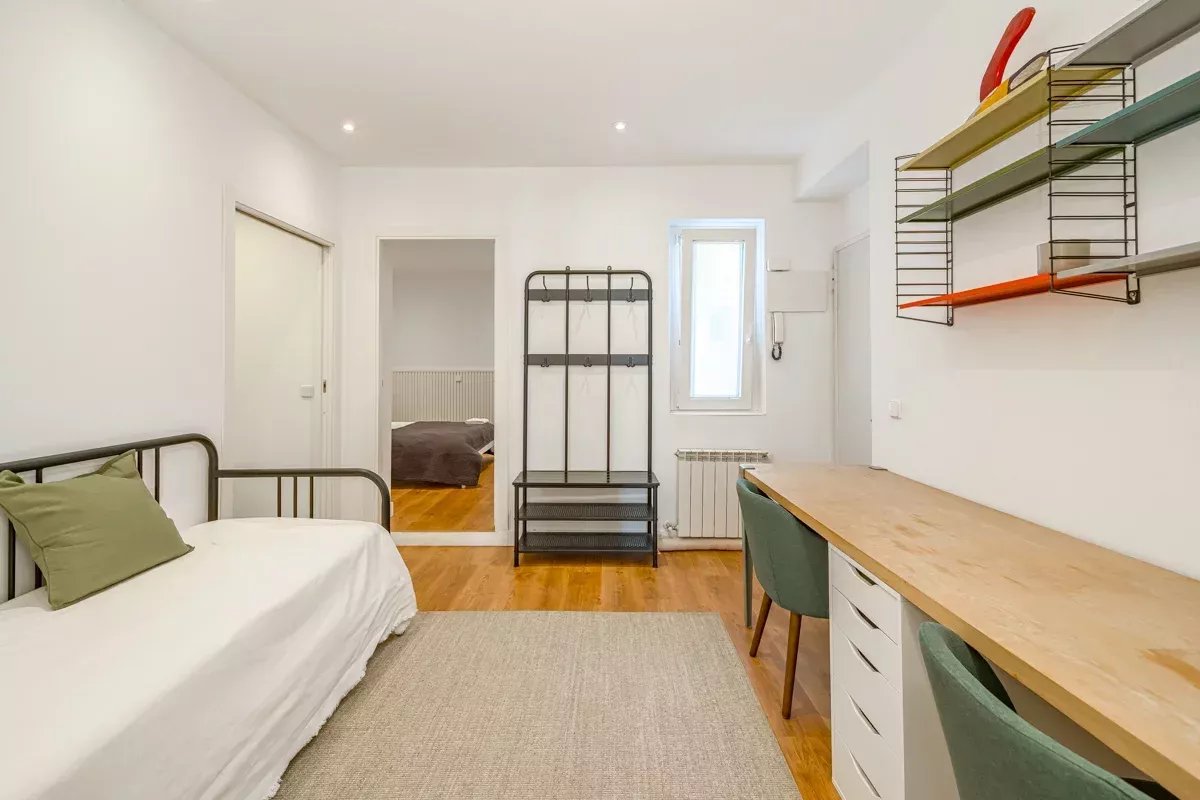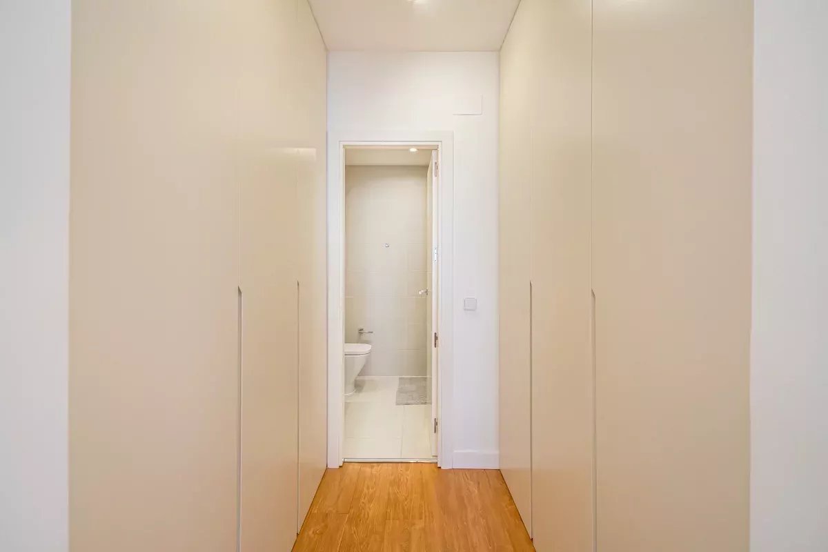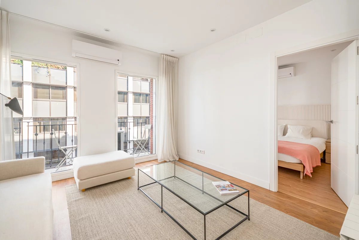 La cocina, equipada con electrodomésticos Bosch de alta gama, se integra en un único ambiente con el comedor y el salón, generando un espacio abierto, luminoso y acogedor. Desde el salón se accede a dos balcones exteriores, mientras que el dormitorio principal dispone de un tercer balcón, permitiendo disfrutar de abundante luz natural y vistas a la vibrante vida urbana del barrio.