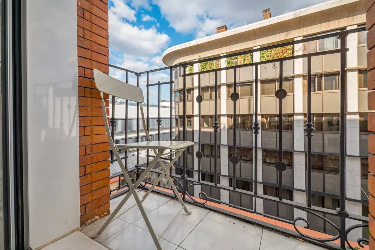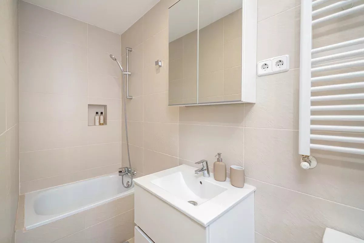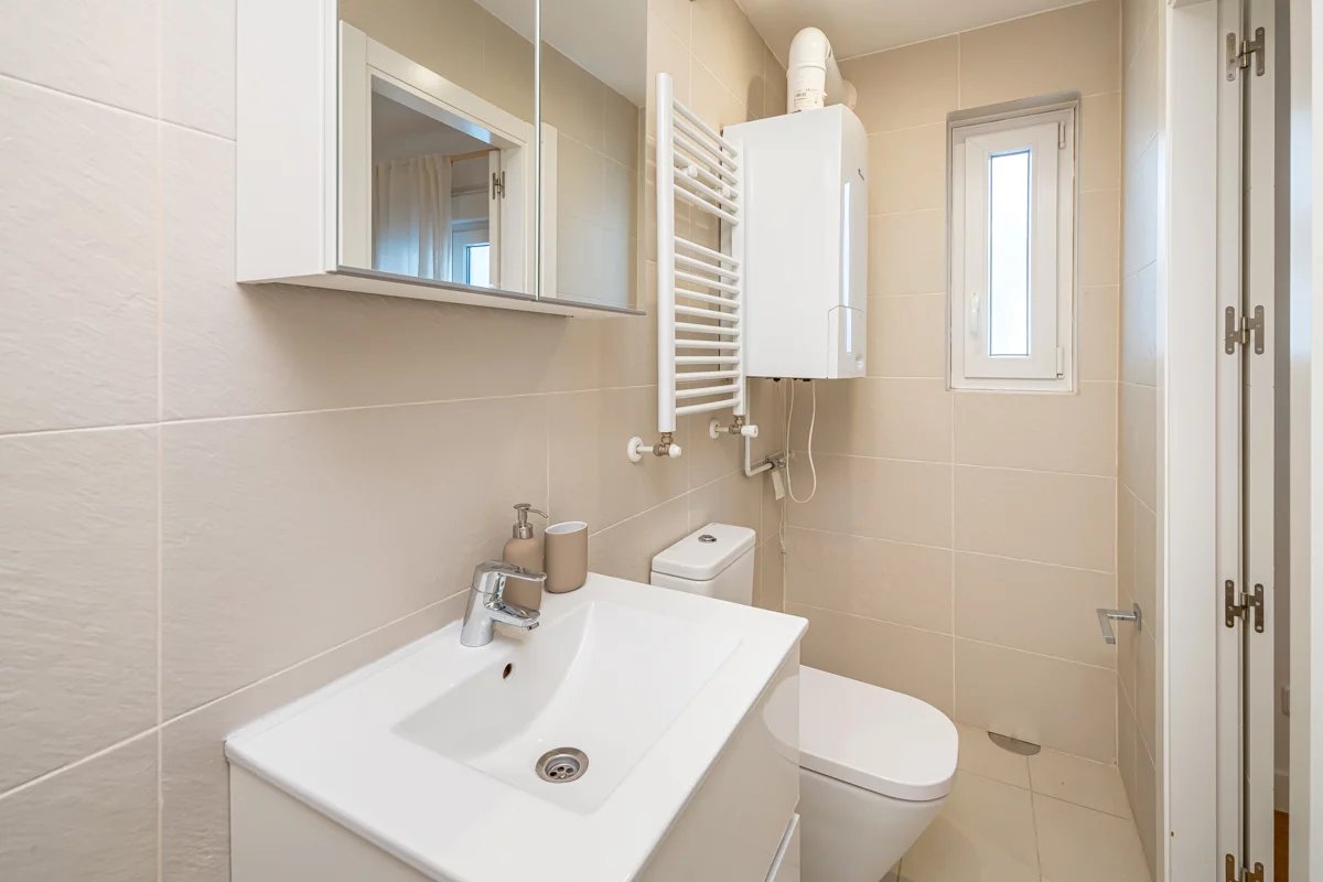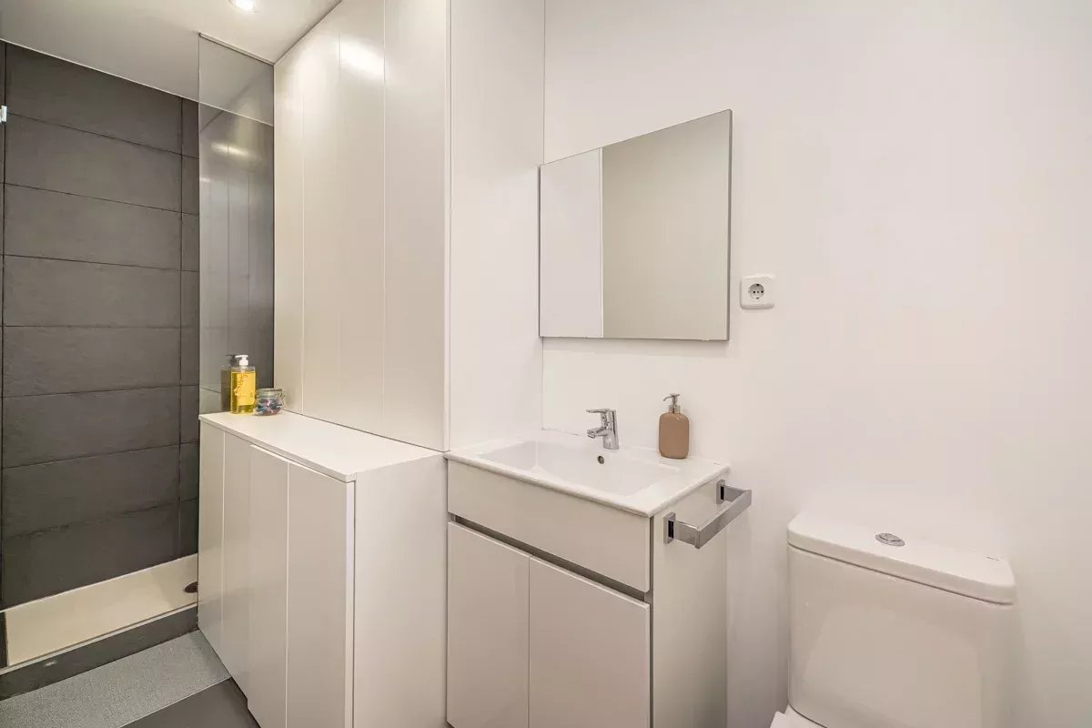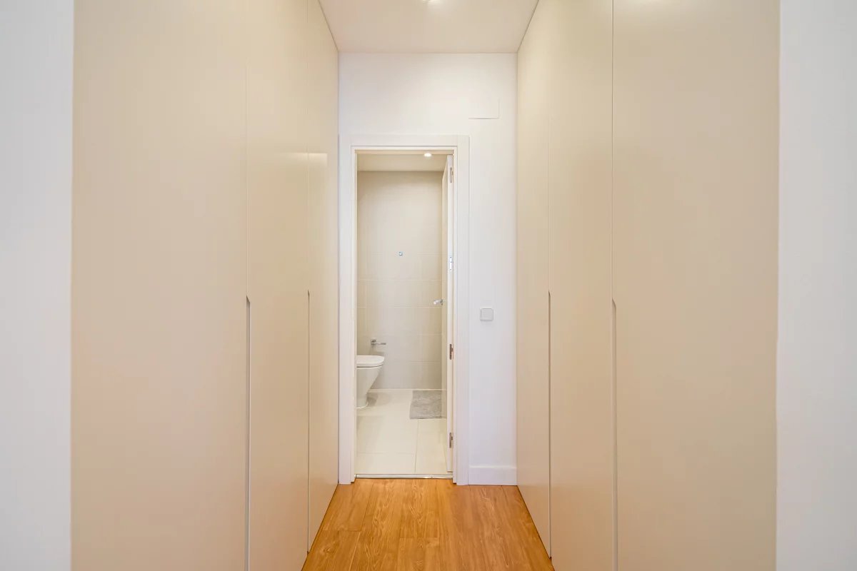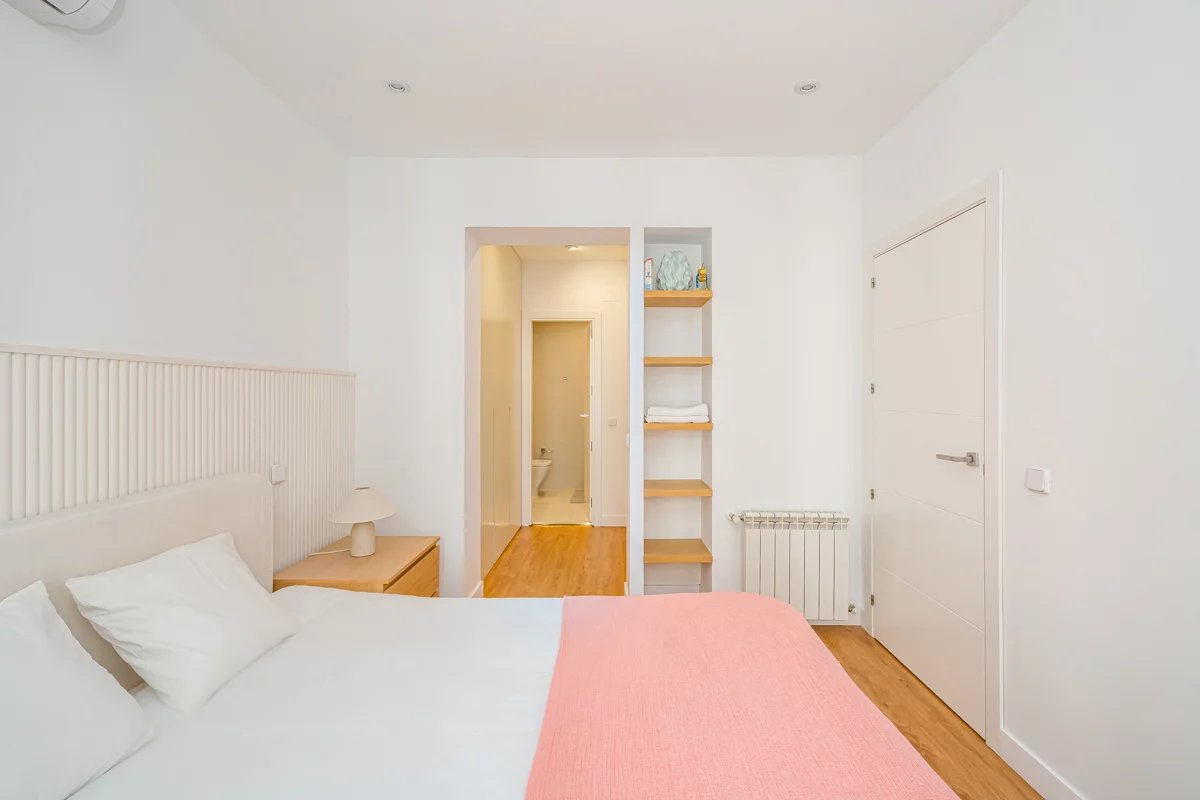 La cocina, equipada con electrodomésticos Bosch de alta gama, se integra en un único ambiente con el comedor y el salón, generando un espacio abierto, luminoso y acogedor. Desde el salón se accede a dos balcones exteriores, mientras que el dormitorio principal dispone de un tercer balcón, permitiendo disfrutar de abundante luz natural y vistas a la vibrante vida urbana del barrio.