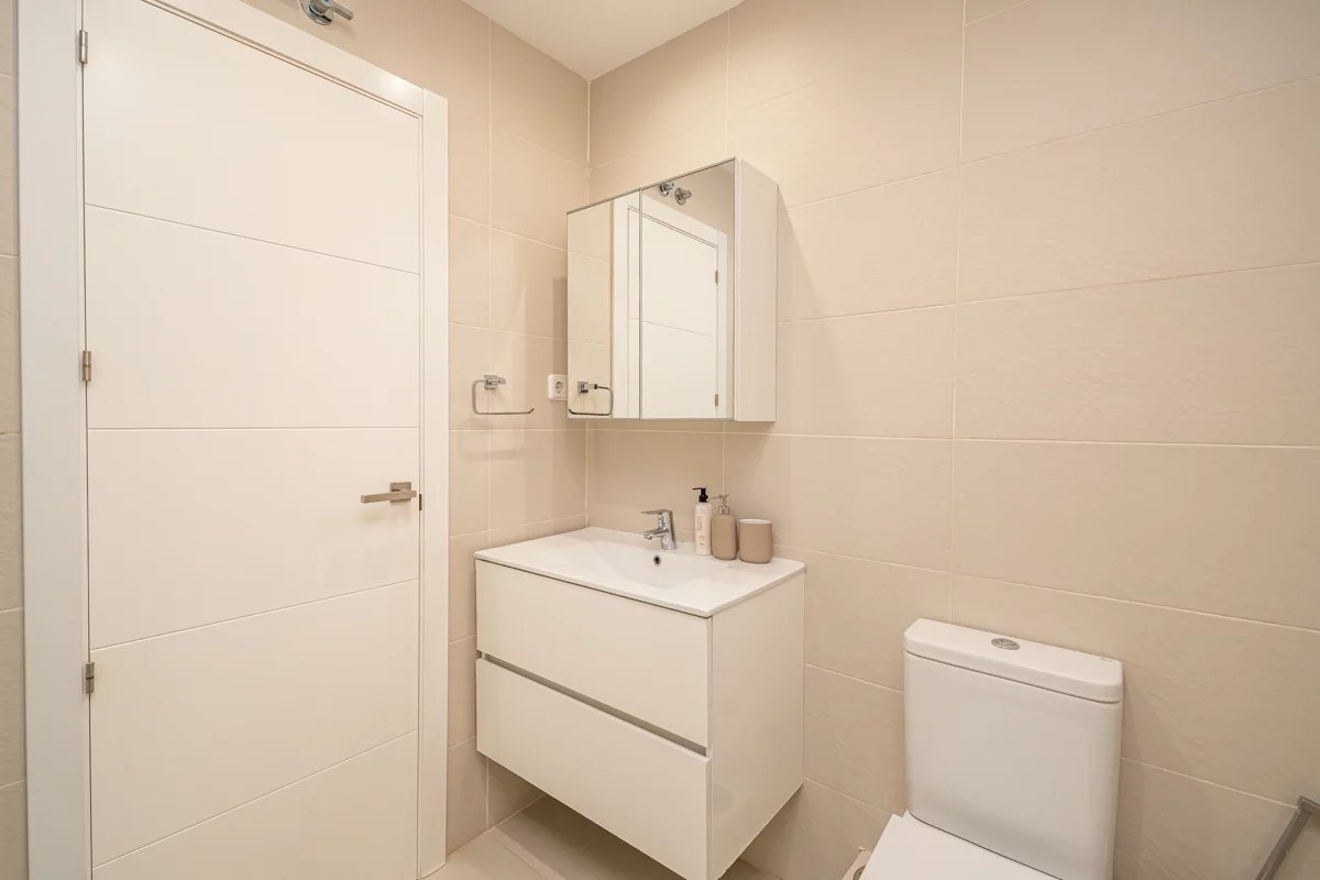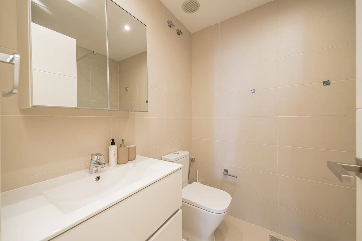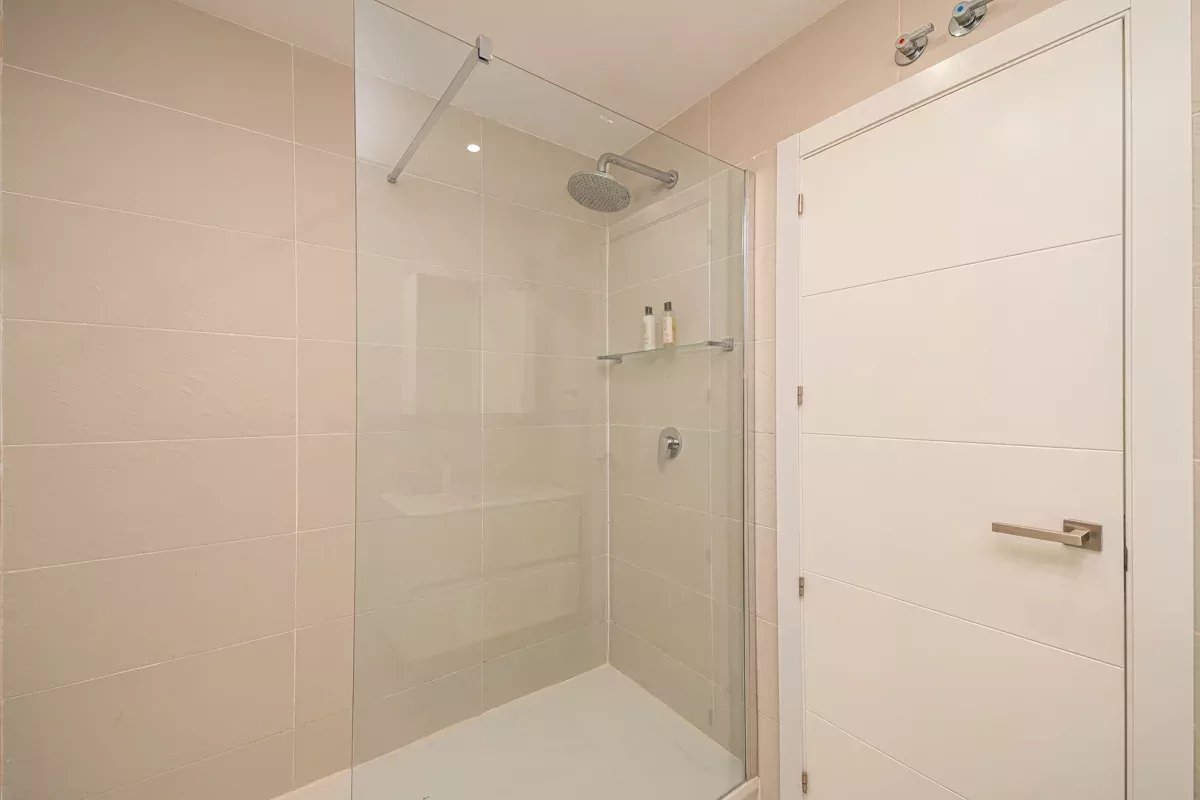 Cuenta con dos amplios dormitorios con camas dobles y baños en suite, además de un baño de cortesía completo con ducha. En la zona de entrada encontramos un espacio versátil con sofá cama y una mesa de trabajo, perfecta para quienes necesiten teletrabajar con comodidad.