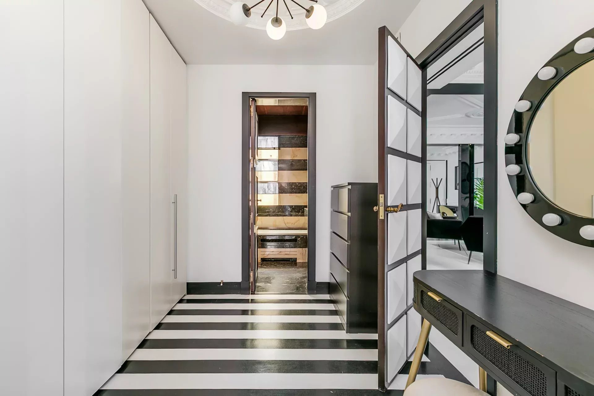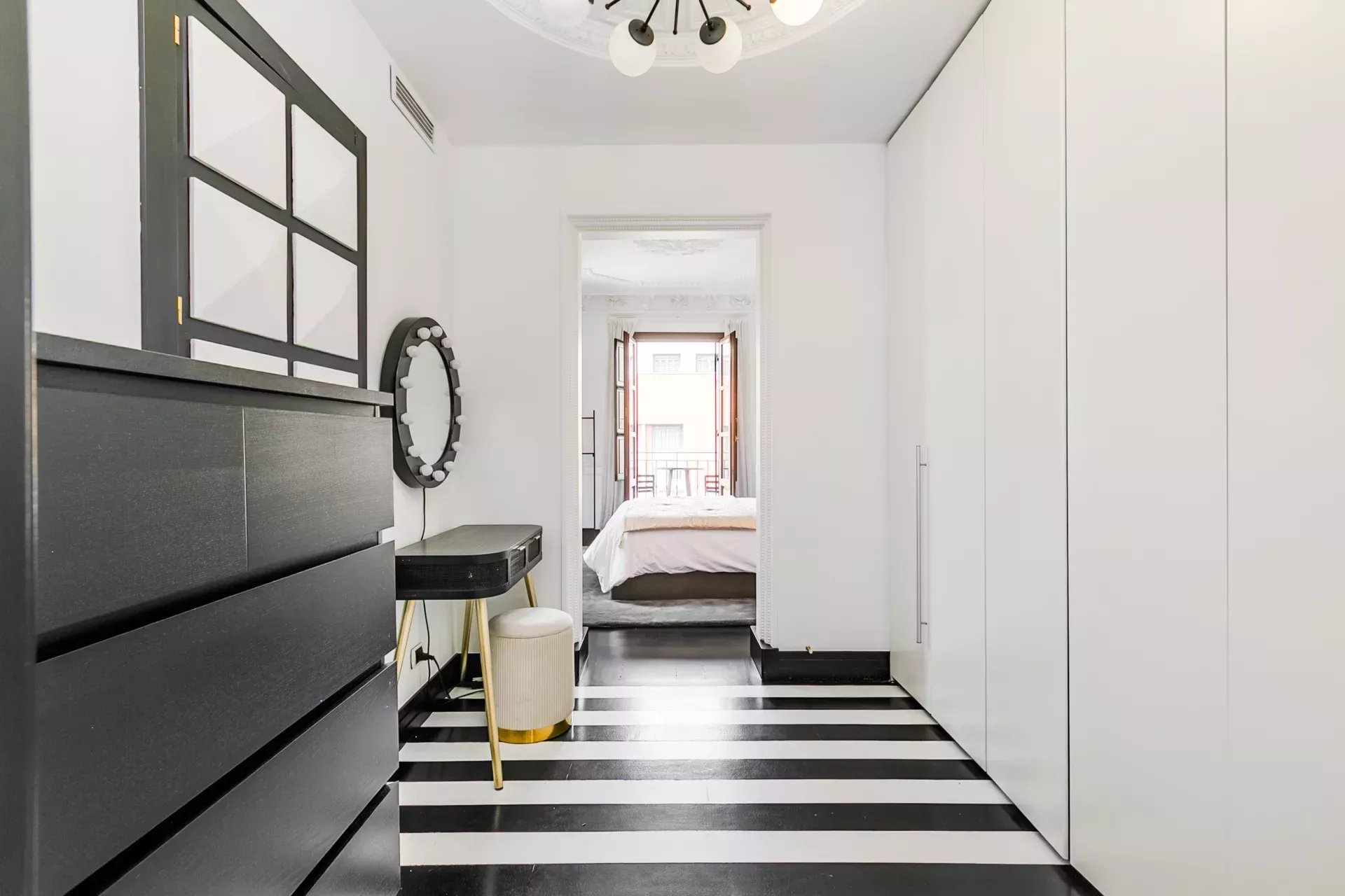 En la zona de descanso, un amplio vestidor con armarios empotrados, tocador y cajoneras conecta con el dormitorio principal, dotado de cama tipo canapé de 1,80 m, luz natural abundante y balcón exterior. El baño en suite, revestido en mármol, incluye bañera y ducha.