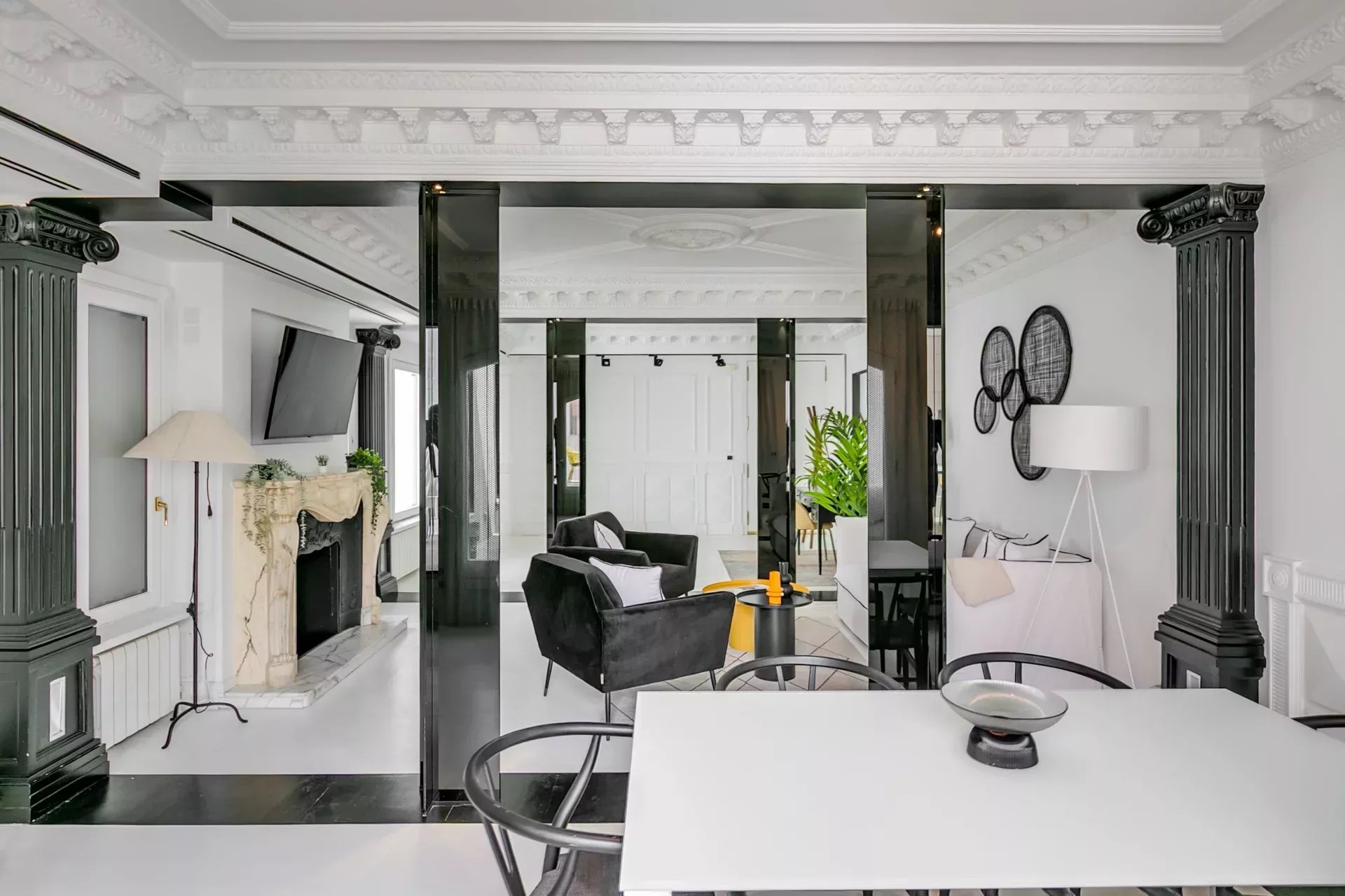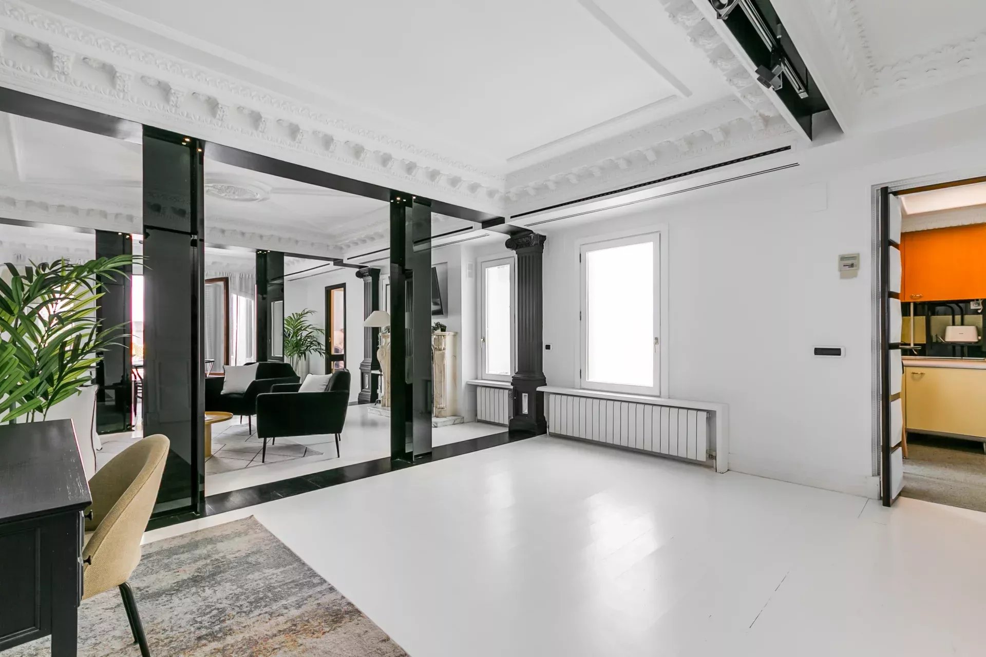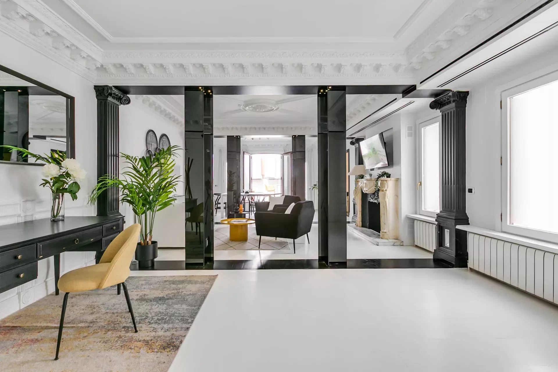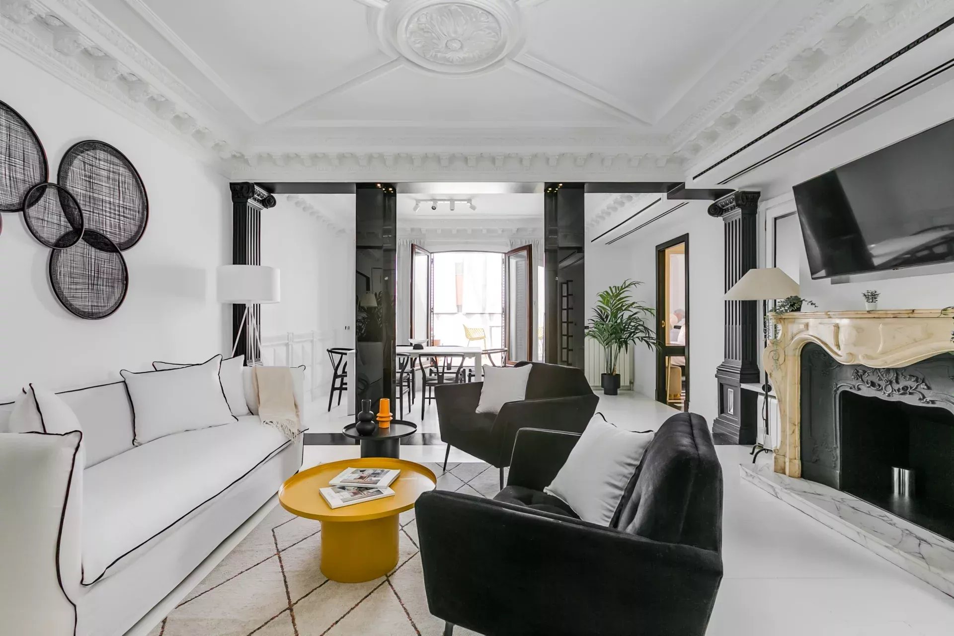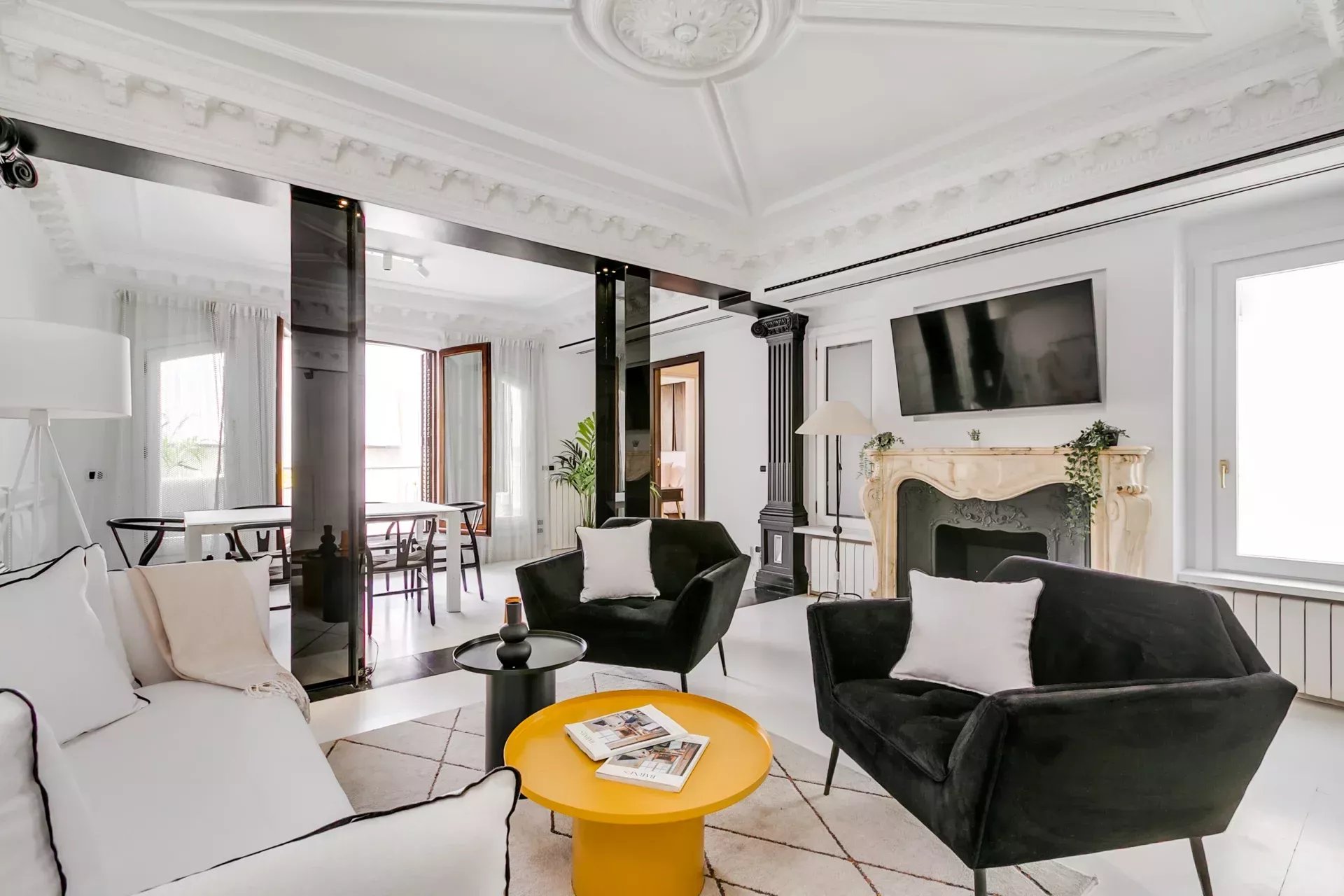El salón destaca por su luminosidad, techos altos con molduras neoclásicas, columnas decorativas, chimenea de mármol tallado y una cuidada iluminación ambiental. Incluye smart TV, sofá cama y mobiliario de diseño. A continuación, el comedor, presidido por una mesa extensible con tope de cristal templado y sillas estilo Wishbone, ofrece espacio para hasta diez comensales.