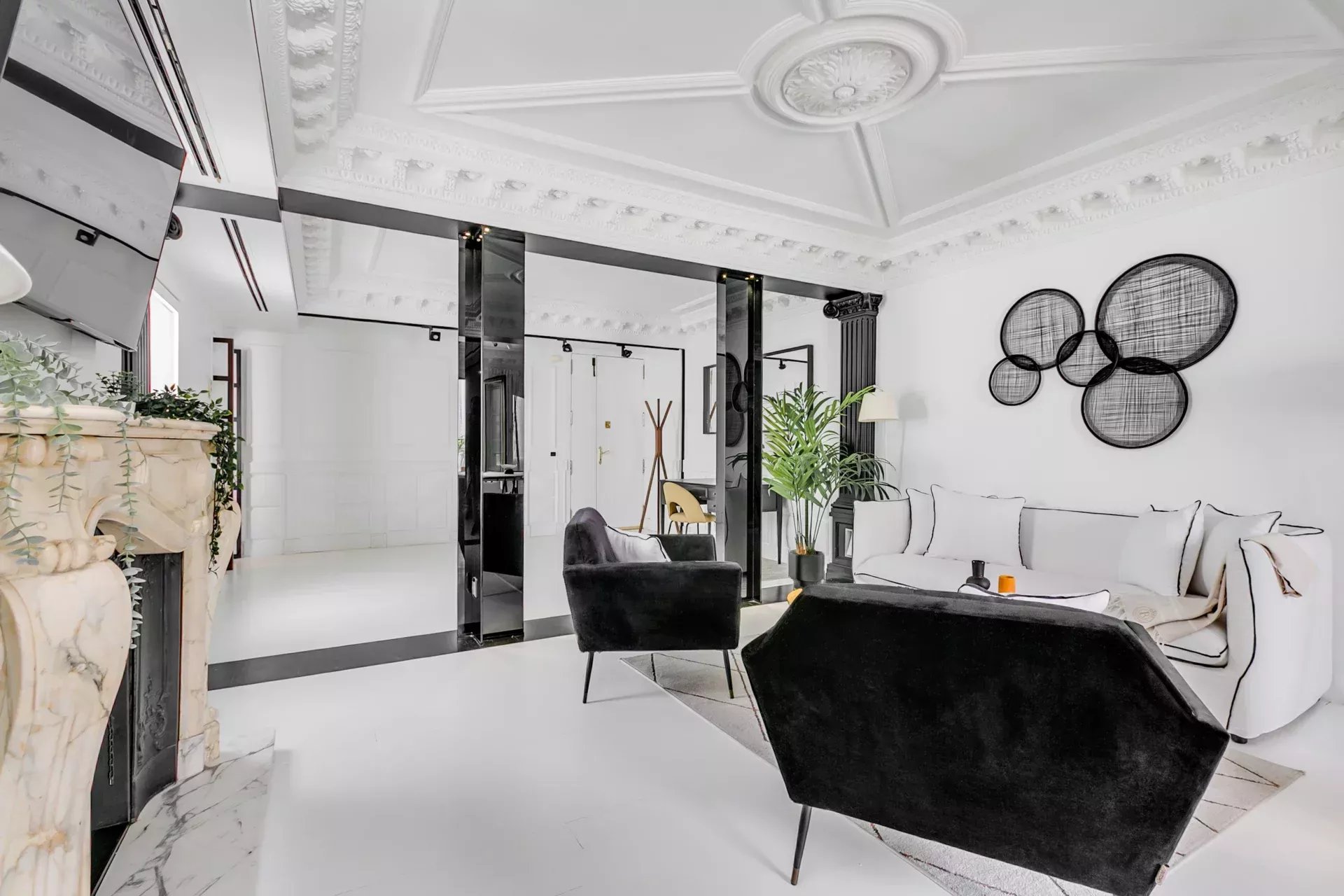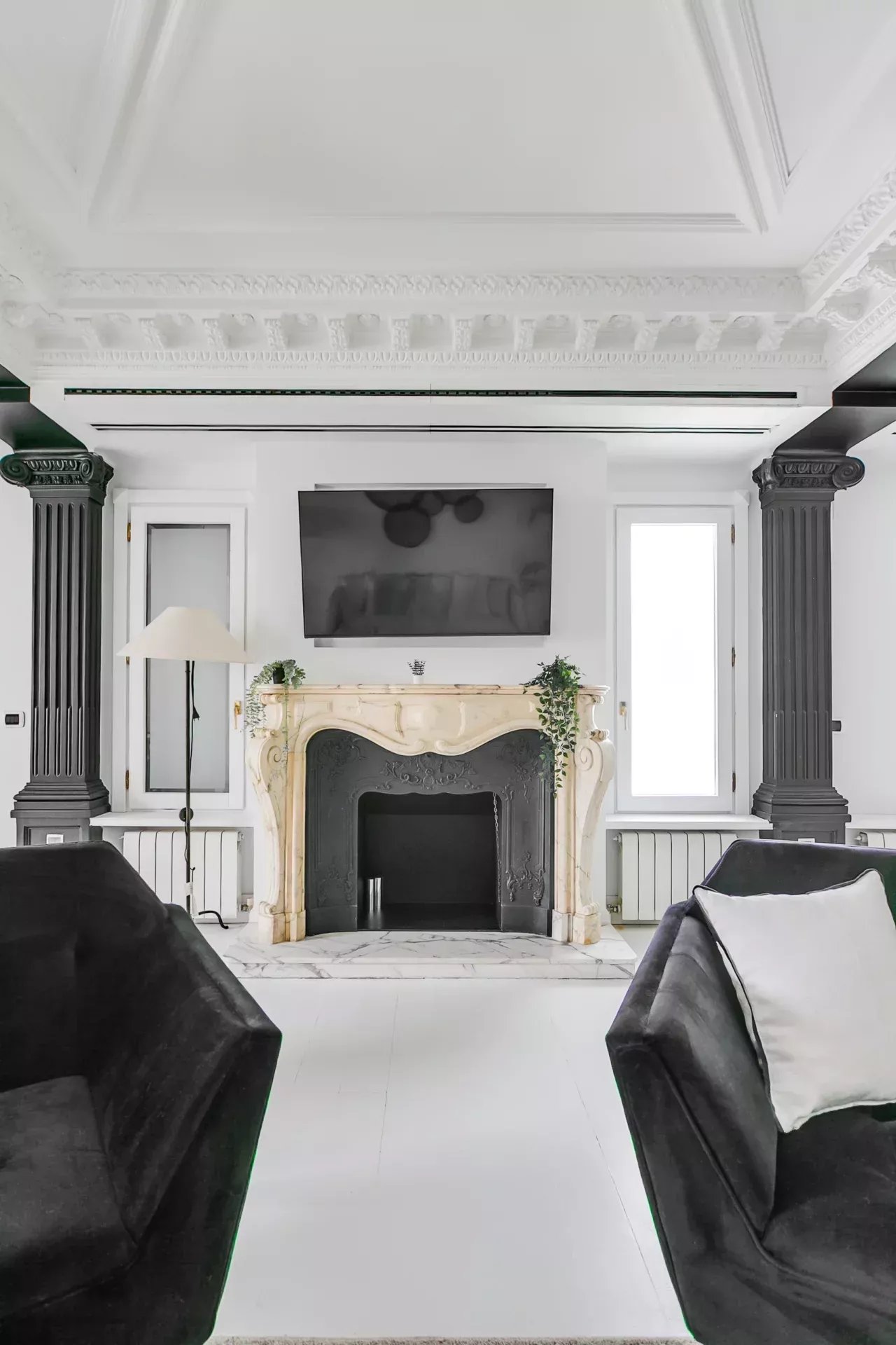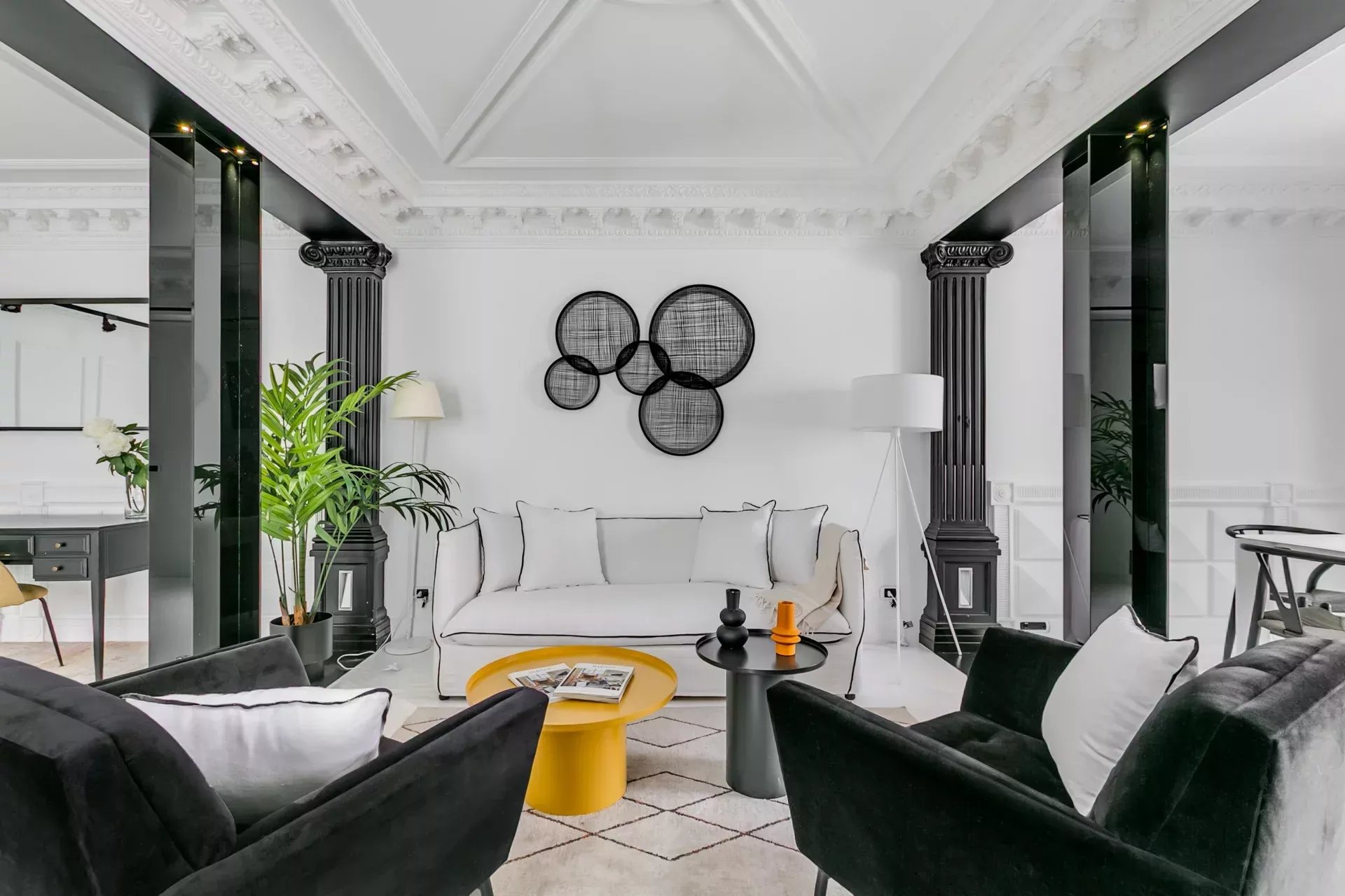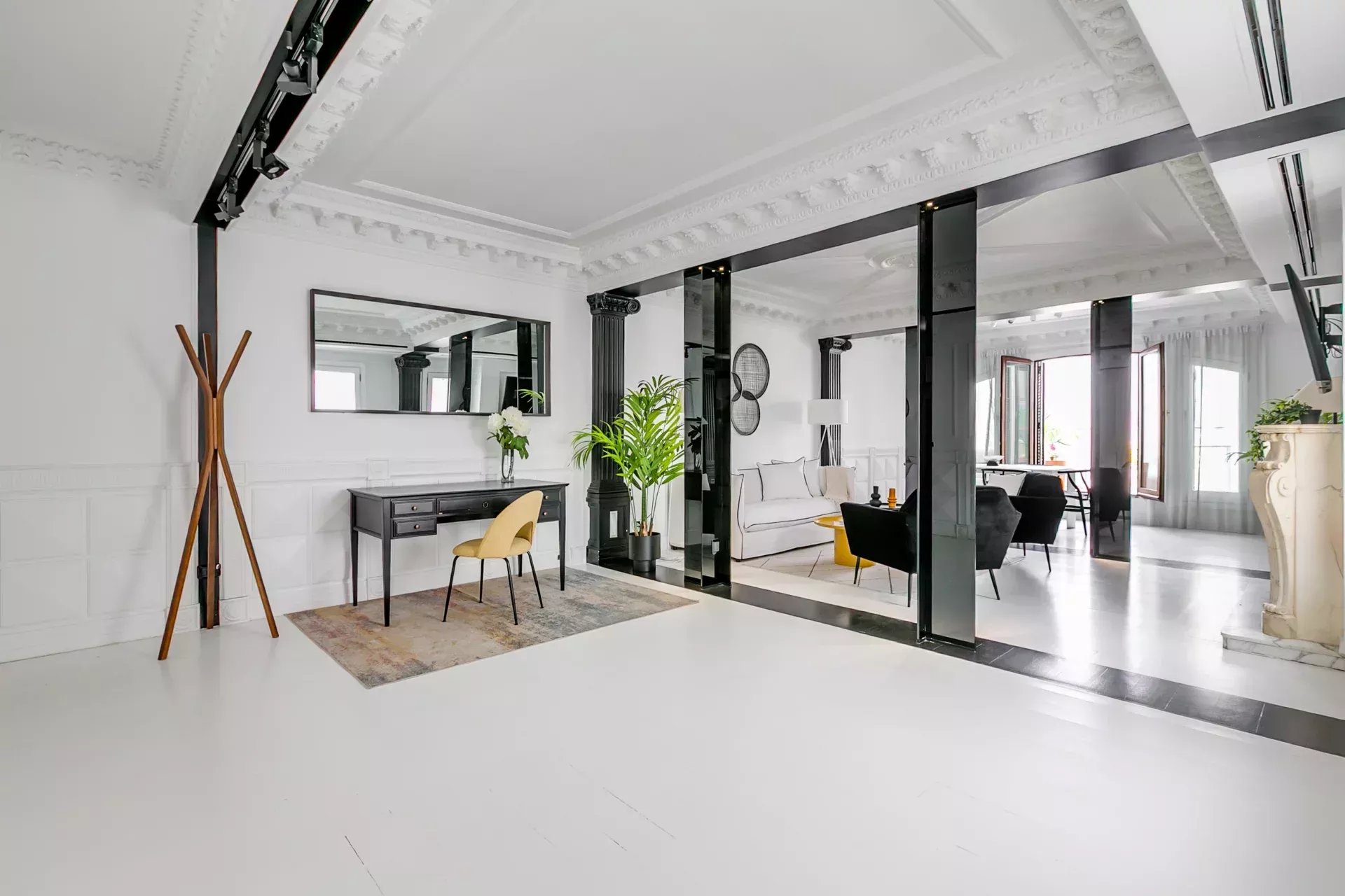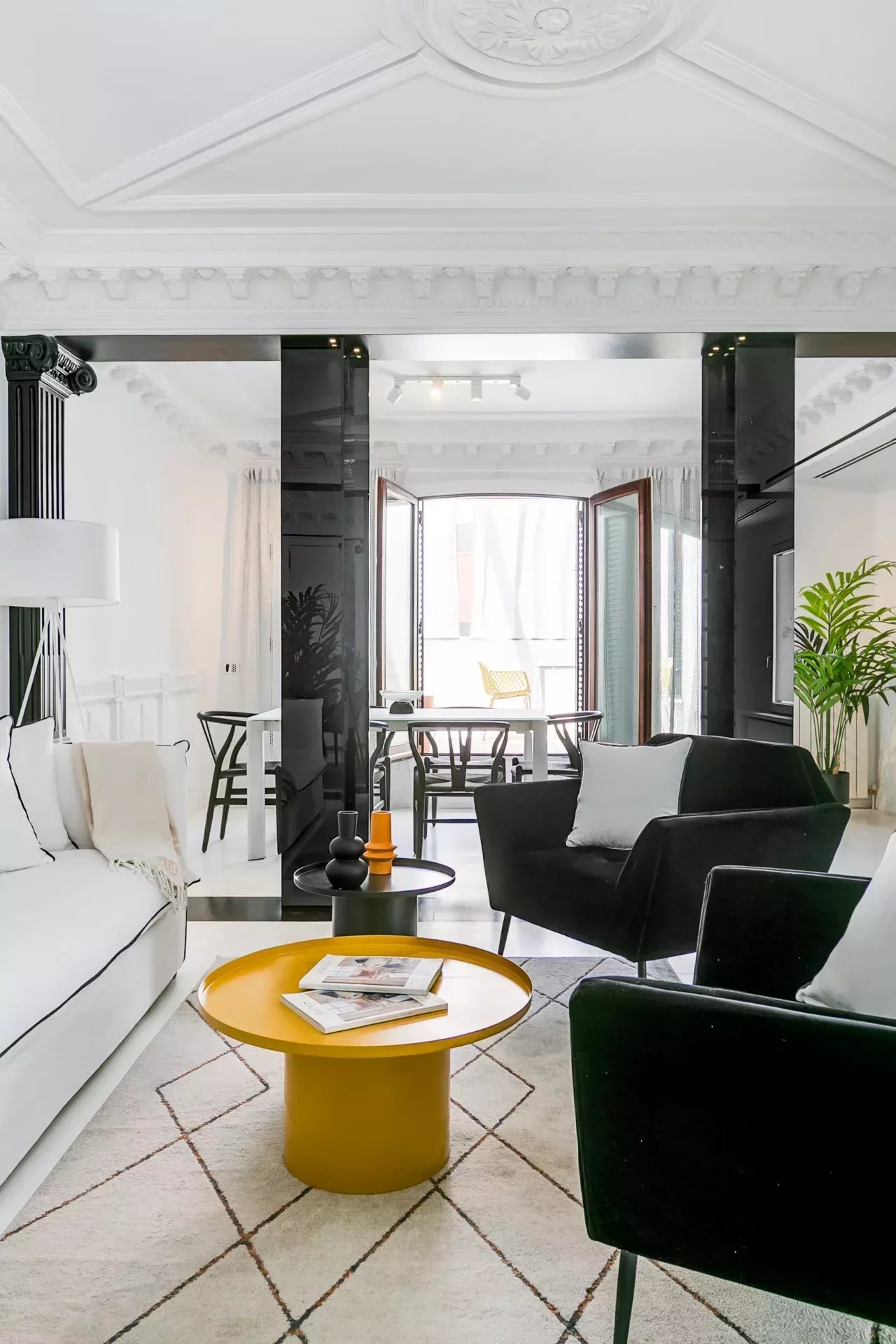 El salón destaca por su luminosidad, techos altos con molduras neoclásicas, columnas decorativas, chimenea de mármol tallado y una cuidada iluminación ambiental. Incluye smart TV, sofá cama y mobiliario de diseño. A continuación, el comedor, presidido por una mesa extensible con tope de cristal templado y sillas estilo Wishbone, ofrece espacio para hasta diez comensales.