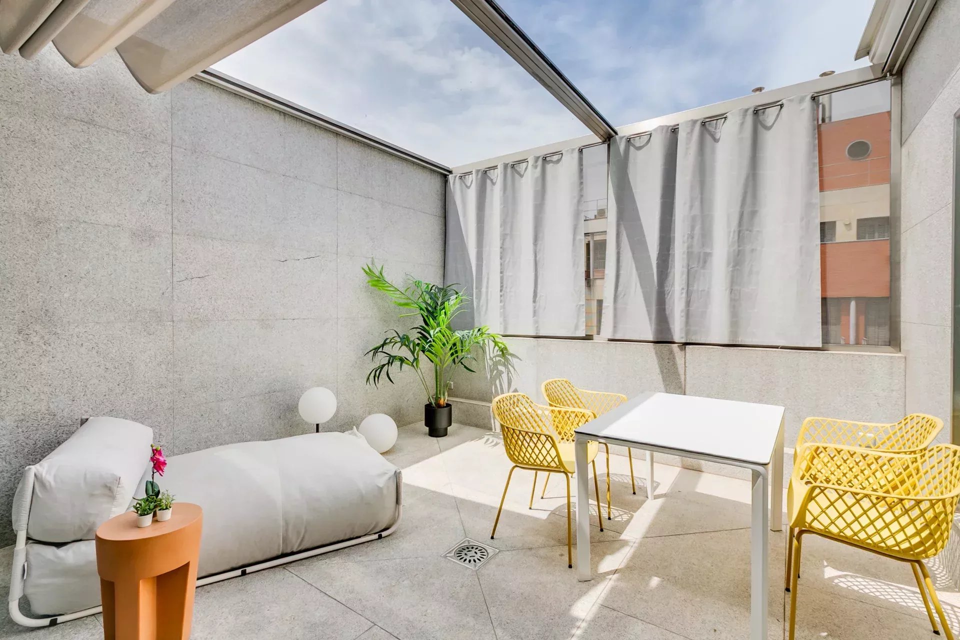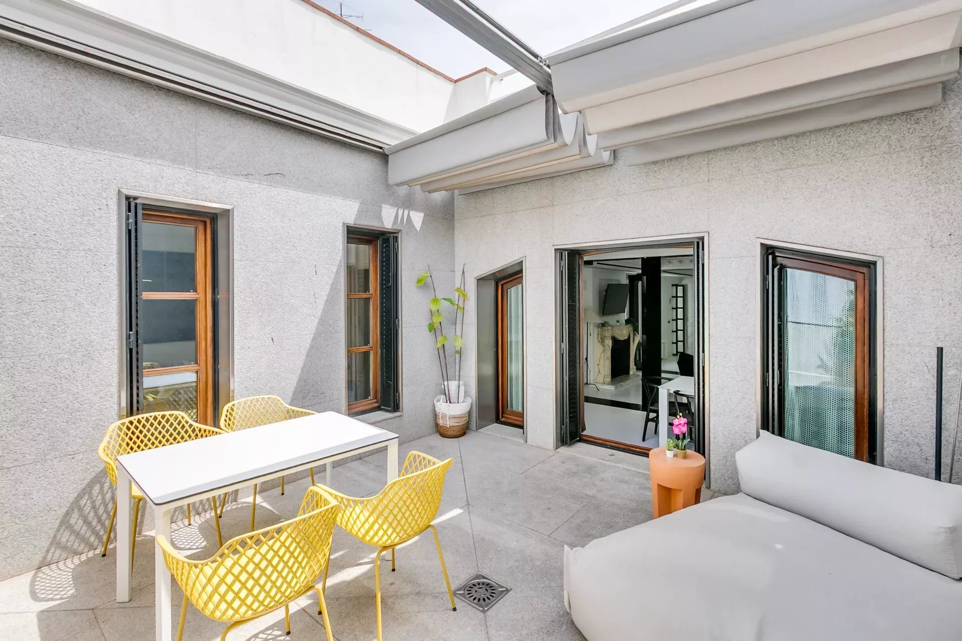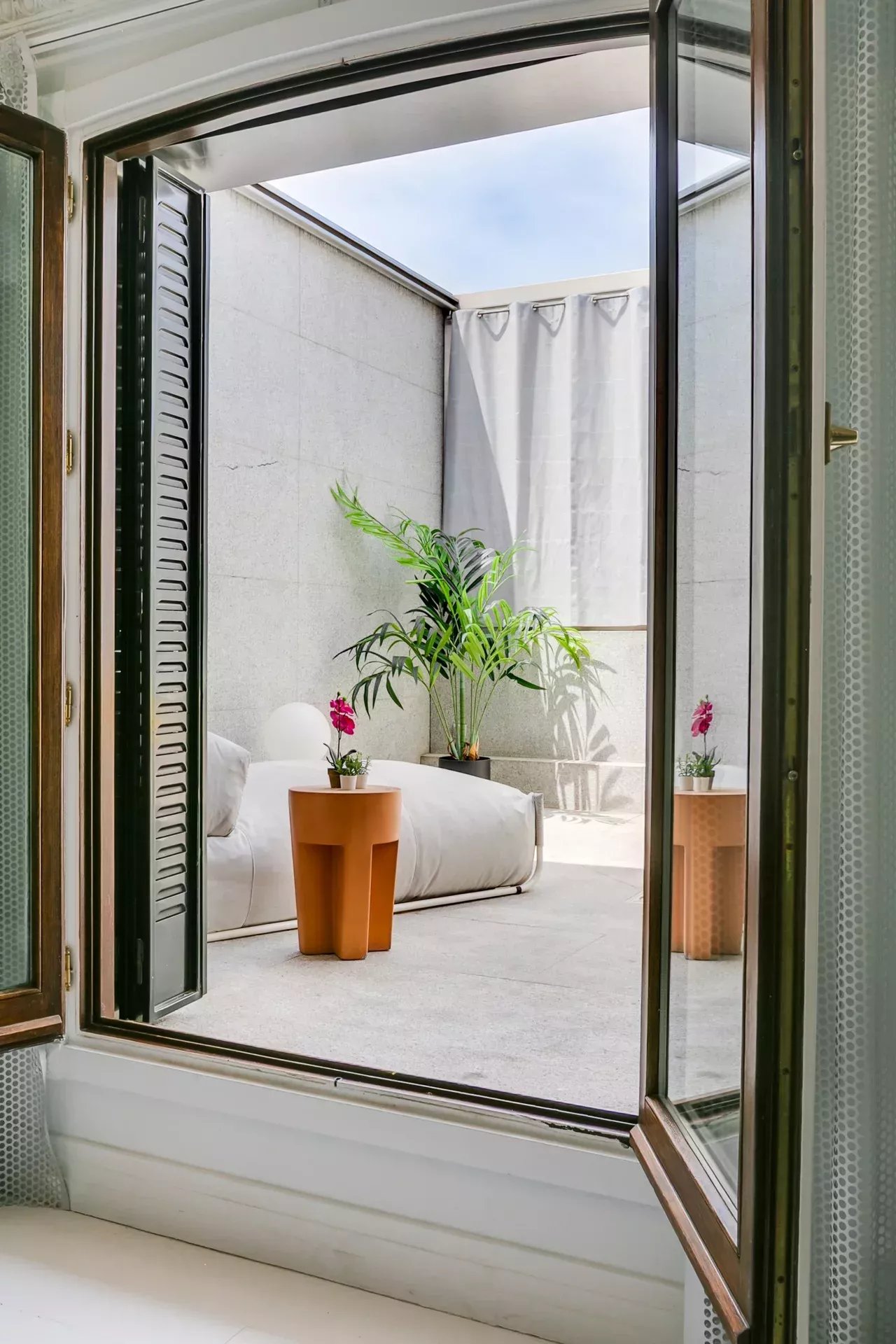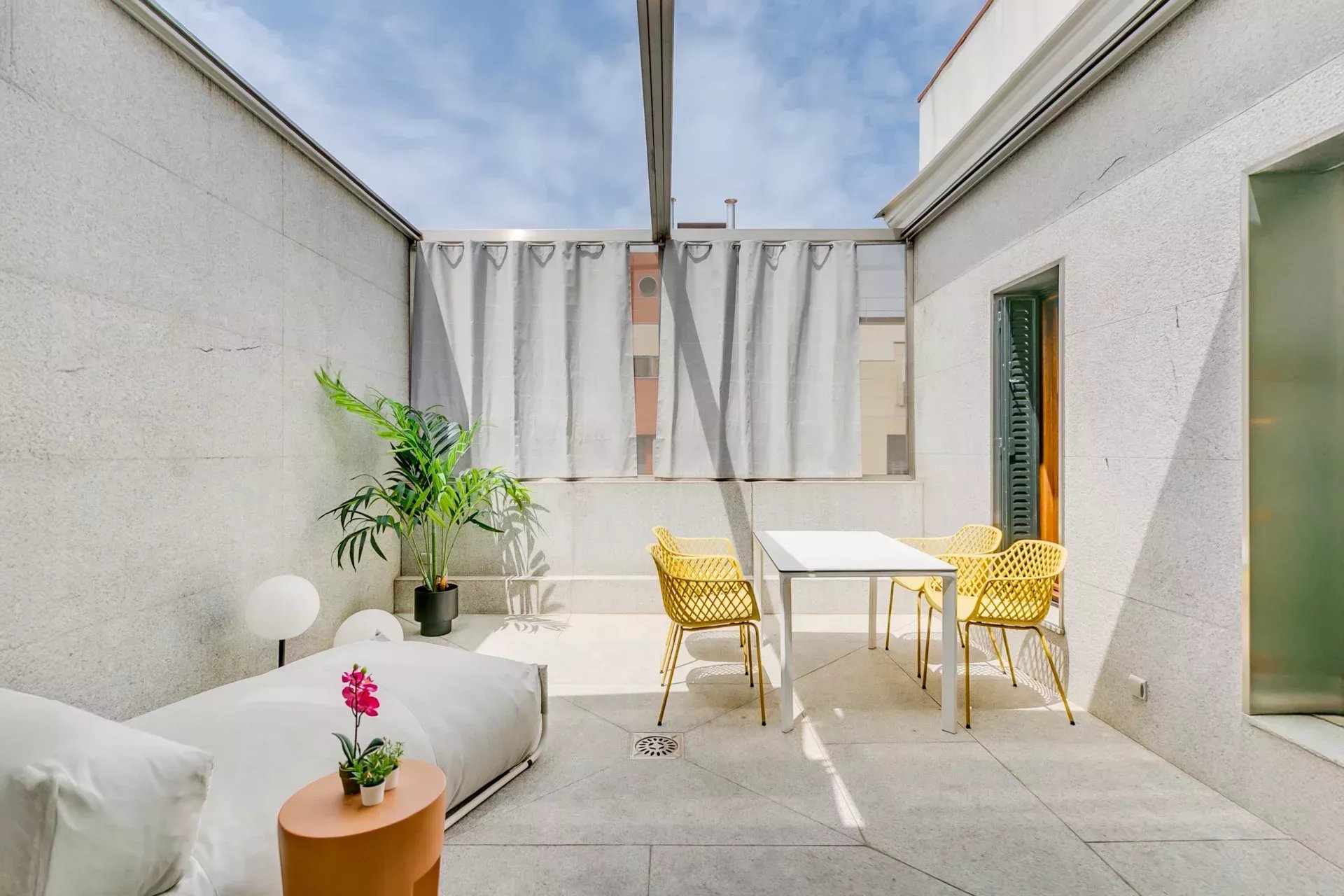 Una doble puerta de madera da acceso a una terraza orientada al oeste, equipada con mesa, chaise longue, iluminación ambiental y vegetación decorativa. Un rincón ideal para disfrutar de la luz del atardecer con privacidad y estilo.