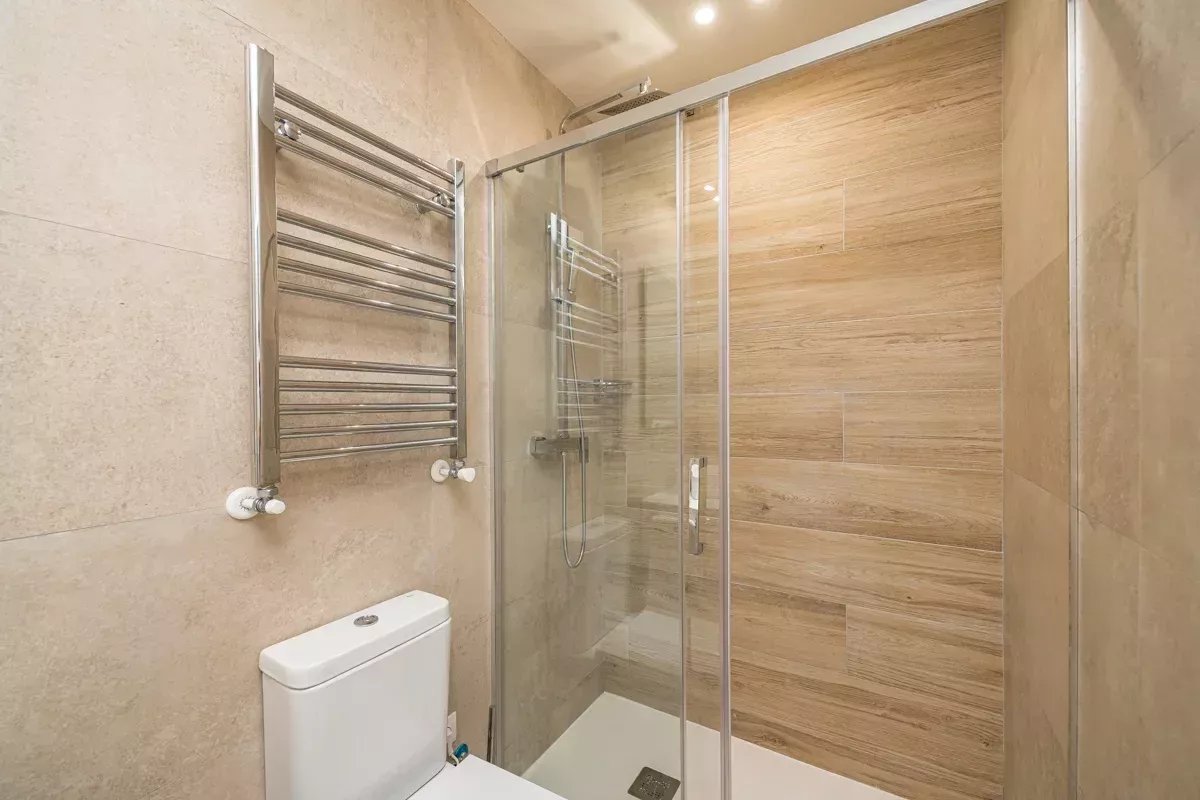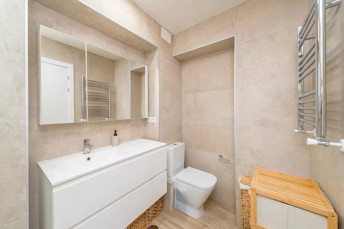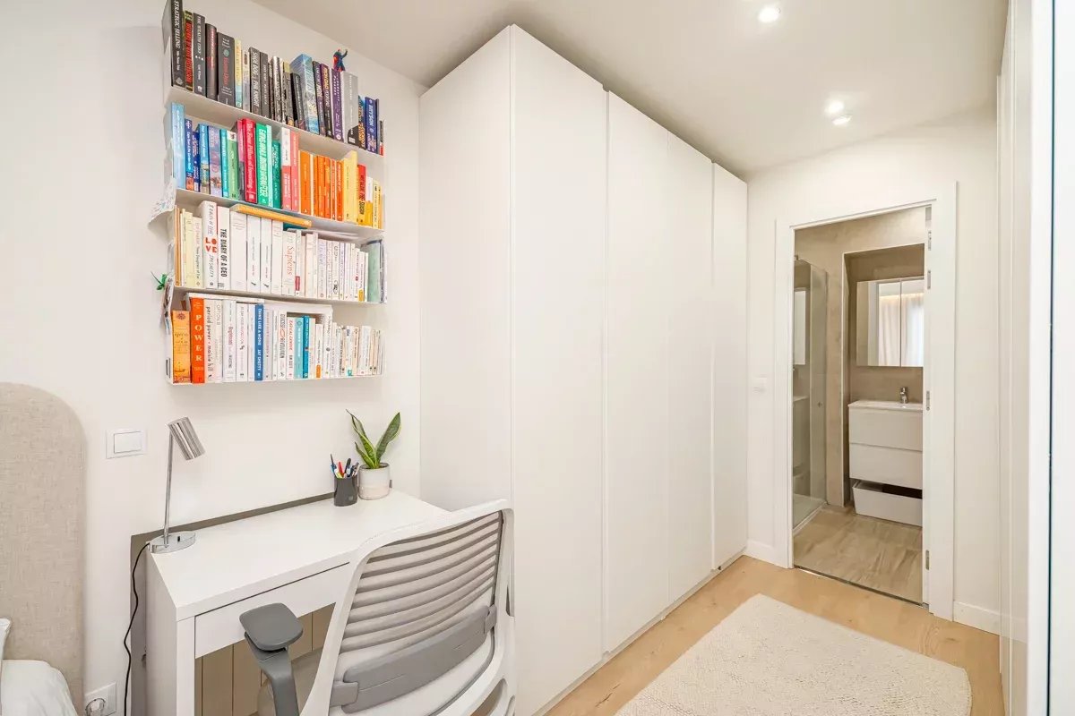 El piso ha sido diseñado cuidadosamente para ofrecer comodidad y funcionalidad. Cuenta con tres dormitorios, dos de ellos con baño en suite y armarios empotrados, mientras que el tercer dormitorio dispone de un baño completo independiente con bañera. La entrada se abre a un acogedor hall que conduce primero al dormitorio de invitados y al baño. Más adelante en el pasillo se encuentran el dormitorio principal y otra habitación en suite, ambas con amplios espacios de almacenamiento.