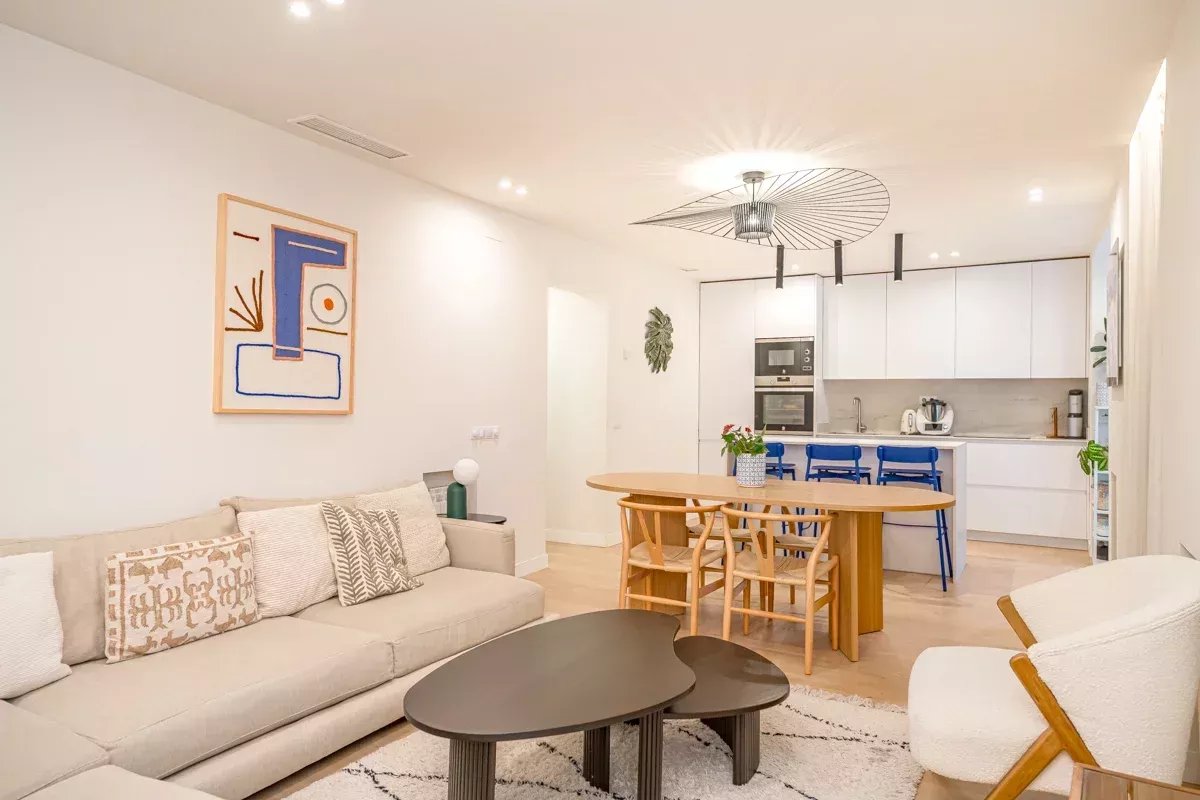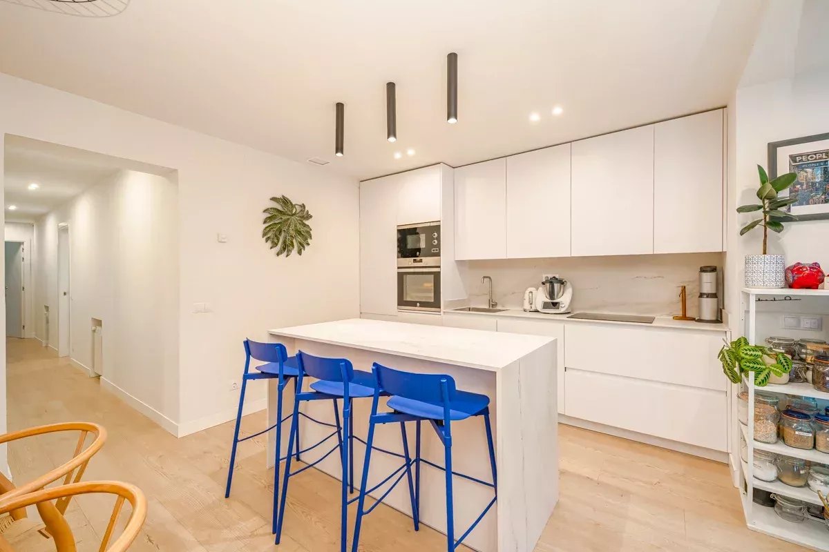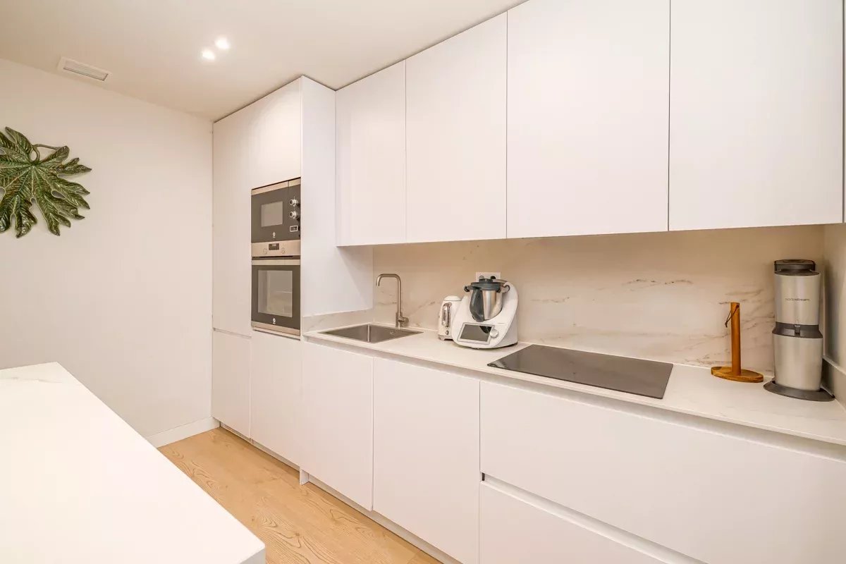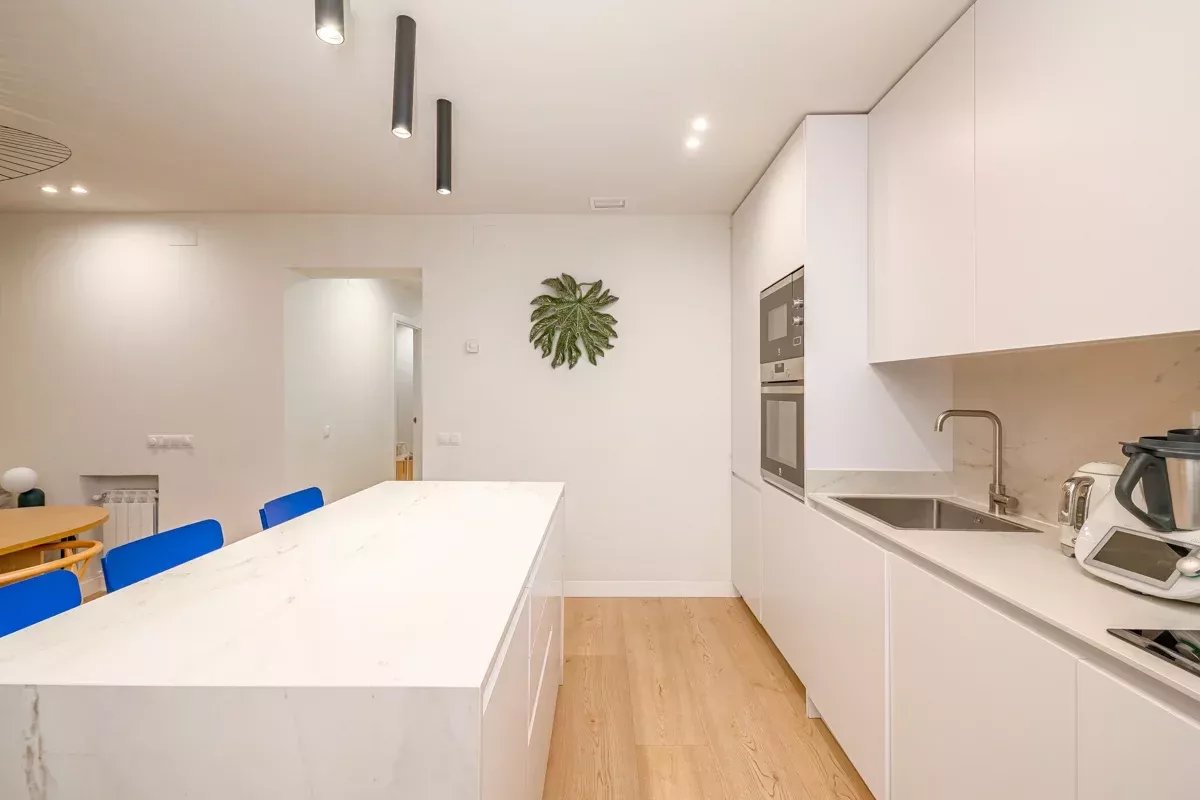 Al final del pasillo, el espacioso salón invita a relajarse en un gran sofá o en un sillón acogedor. La cocina de concepto abierto está integrada en la zona de estar mediante una isla central, y está totalmente equipada con electrodomésticos modernos, incluyendo lavavajillas y lavadora.