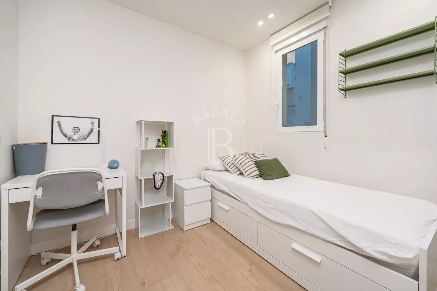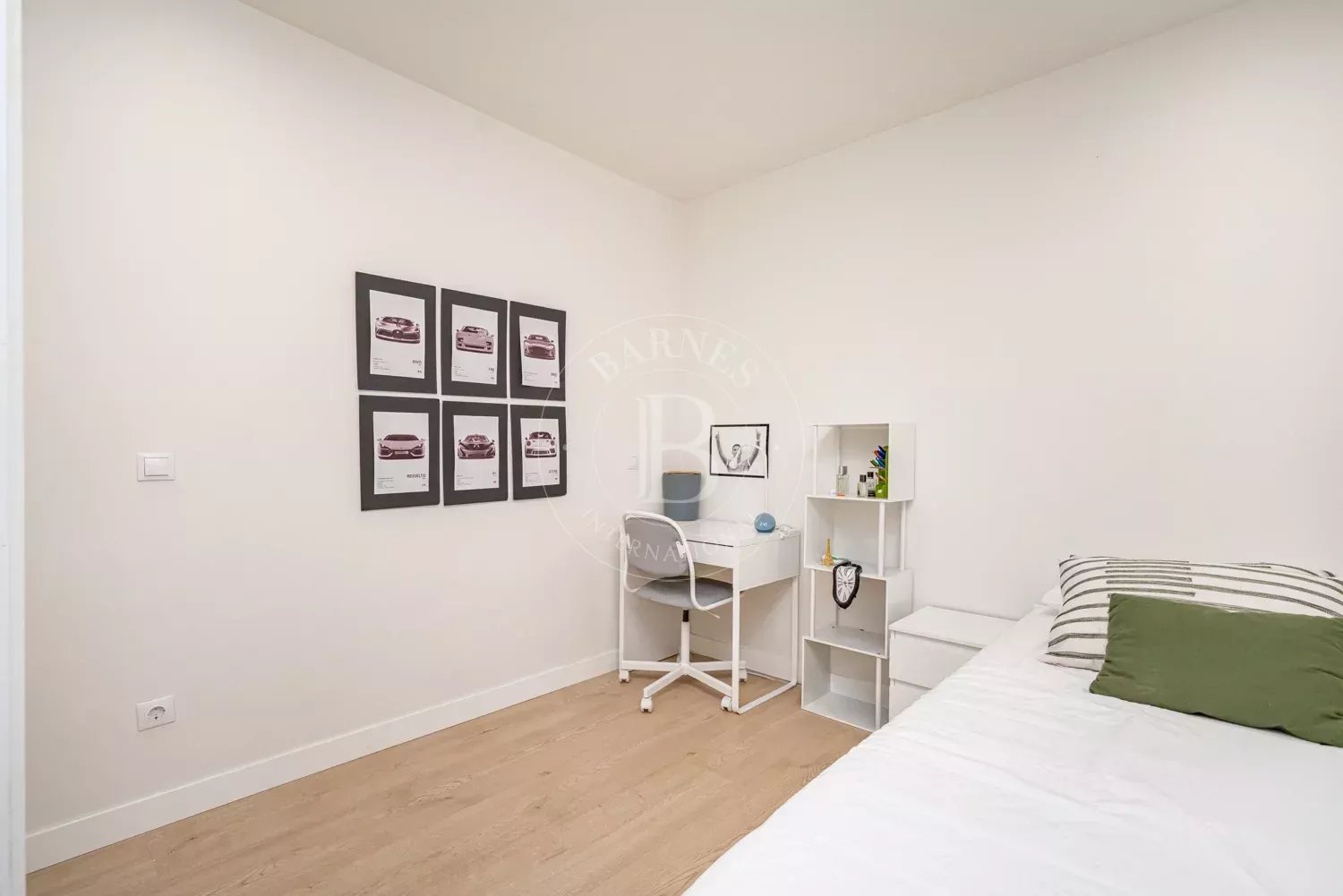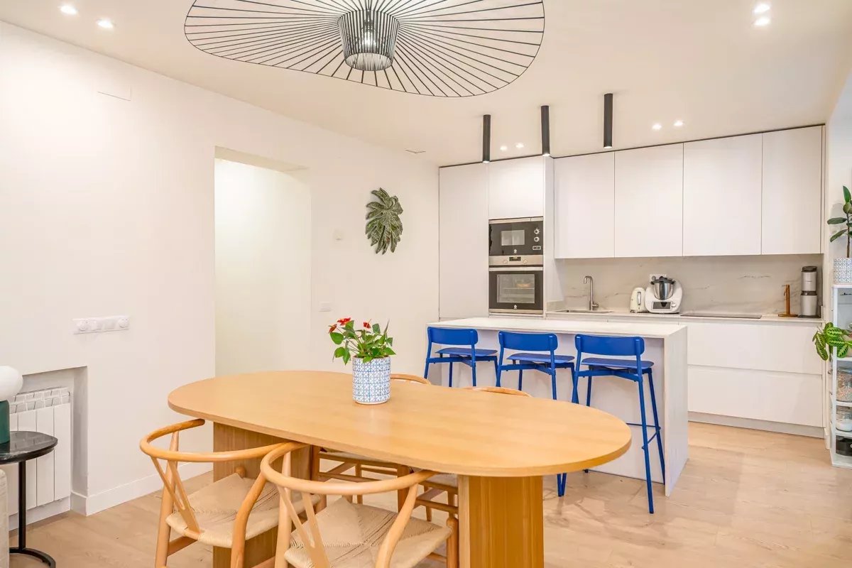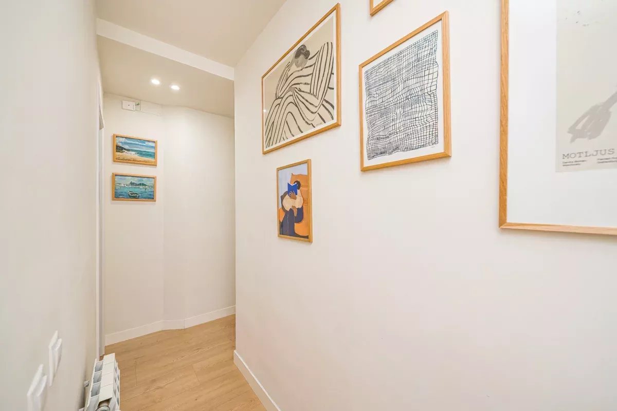 Al final del pasillo, el espacioso salón invita a relajarse en un gran sofá o en un sillón acogedor. La cocina de concepto abierto está integrada en la zona de estar mediante una isla central, y está totalmente equipada con electrodomésticos modernos, incluyendo lavavajillas y lavadora.