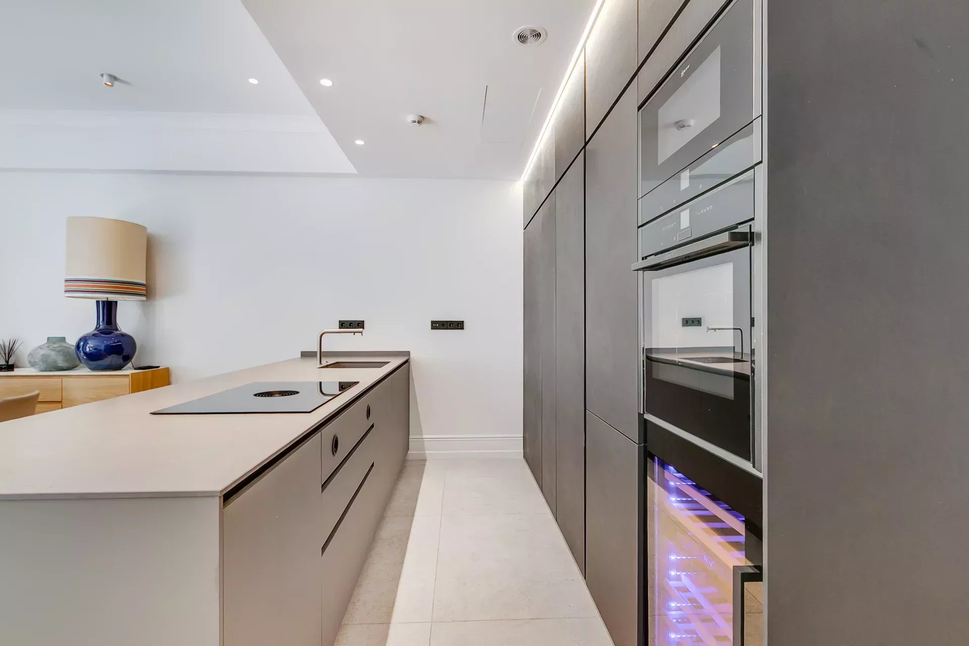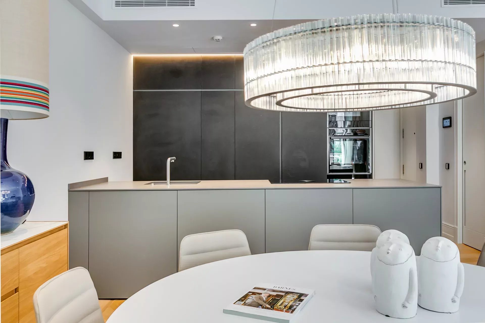 La zona de día se compone de un salón amplio y acogedor, con dos sofás, una televisión de 75” y una mesa auxiliar ideal tanto para tomar el té como para trabajar desde casa. A continuación, se integran la zona de comedor y una cocina abierta equipada con electrodomésticos de alta gama y menaje completo.