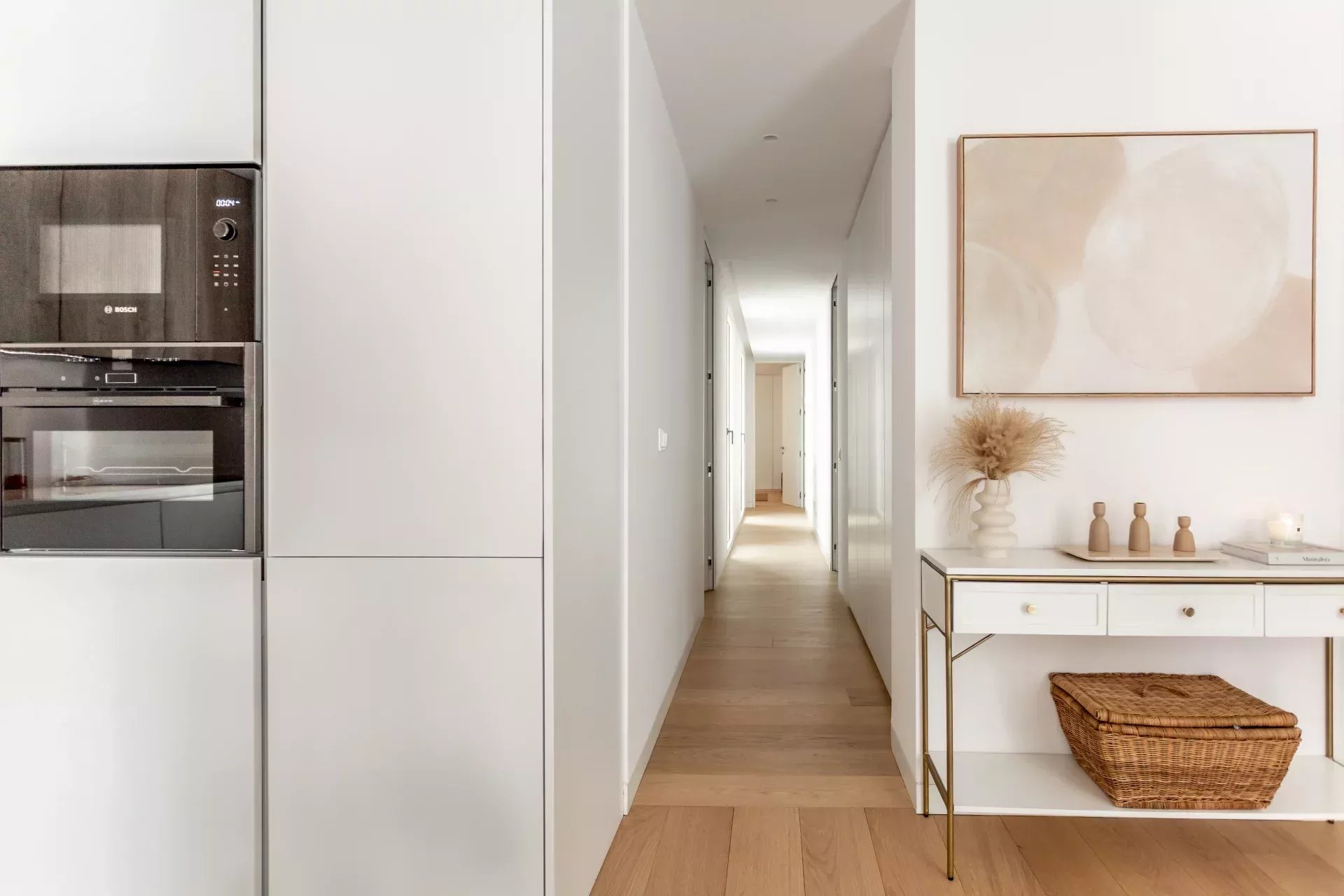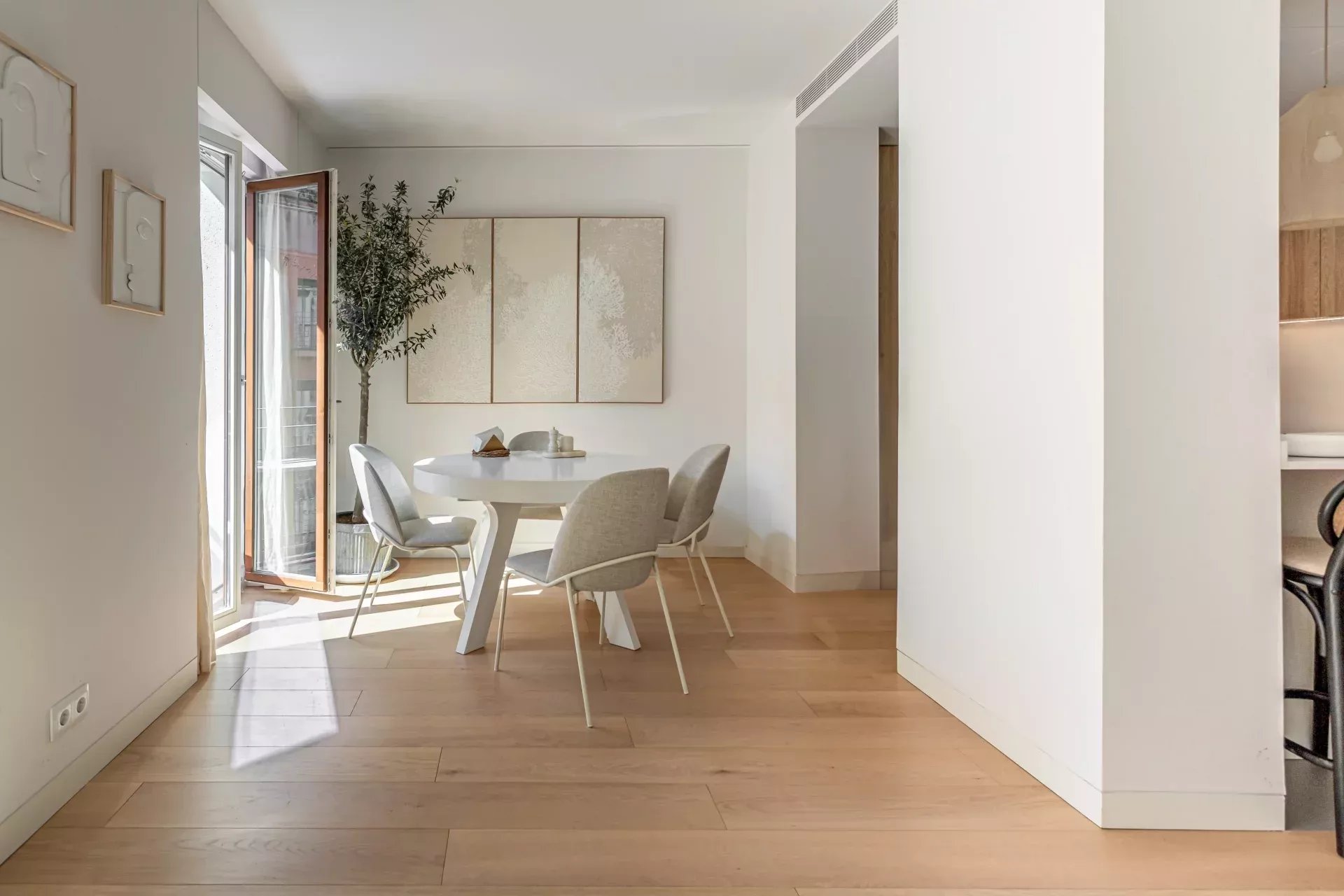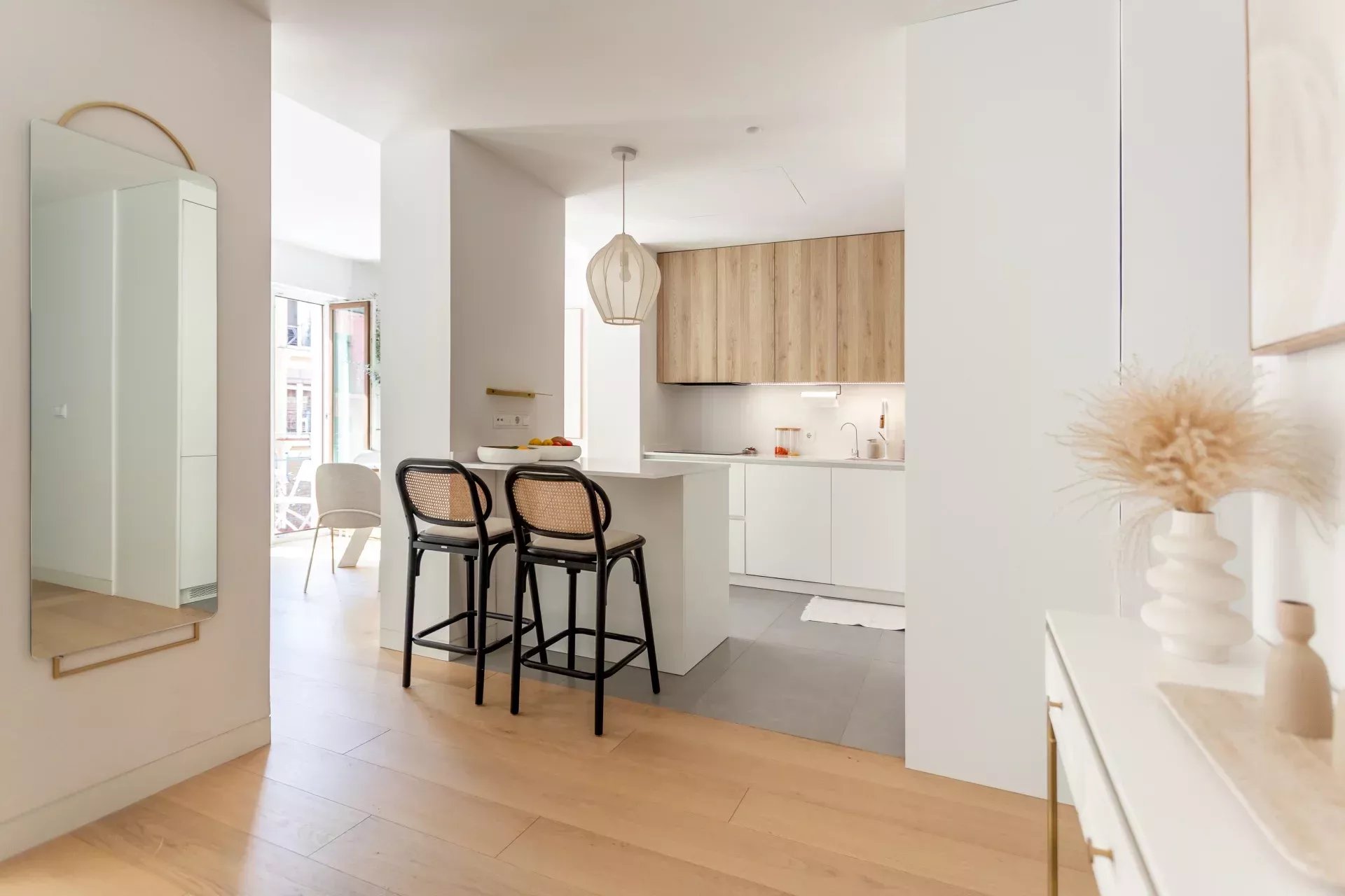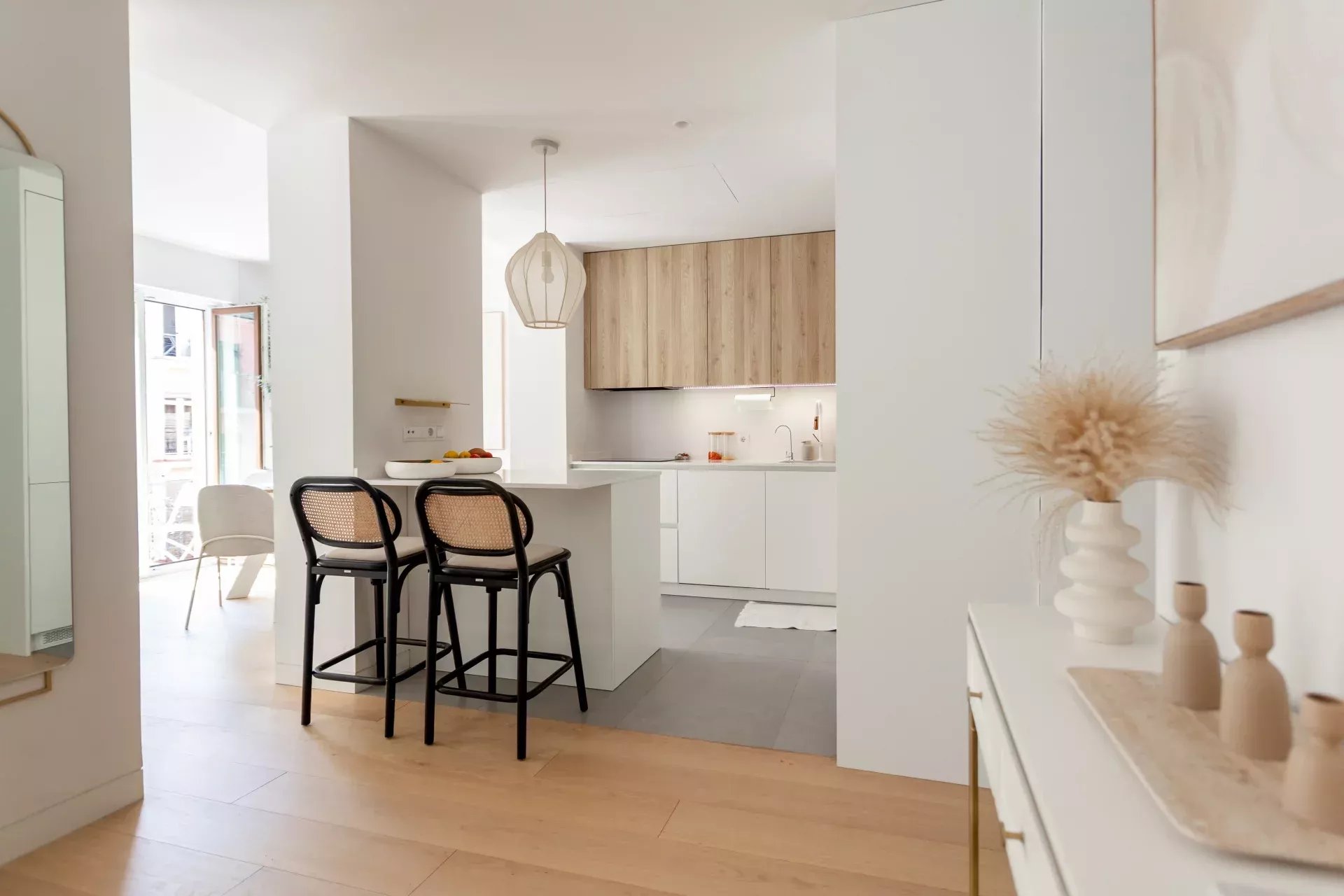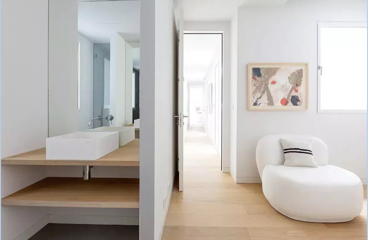 Al acceder, un hall de entrada de diseño da paso a una amplia zona de día compuesta por un luminoso salón-comedor, bañado en luz natural gracias a dos balcones orientados al sur, que aportan calidez y amplitud visual durante todo el año.