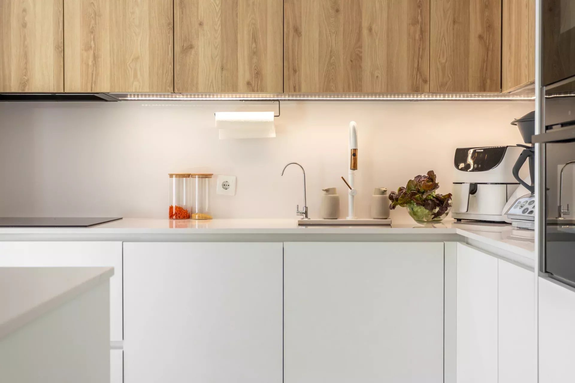 La cocina integrada cuenta con electrodomésticos de alta gama, perfectamente conectada con la zona social.