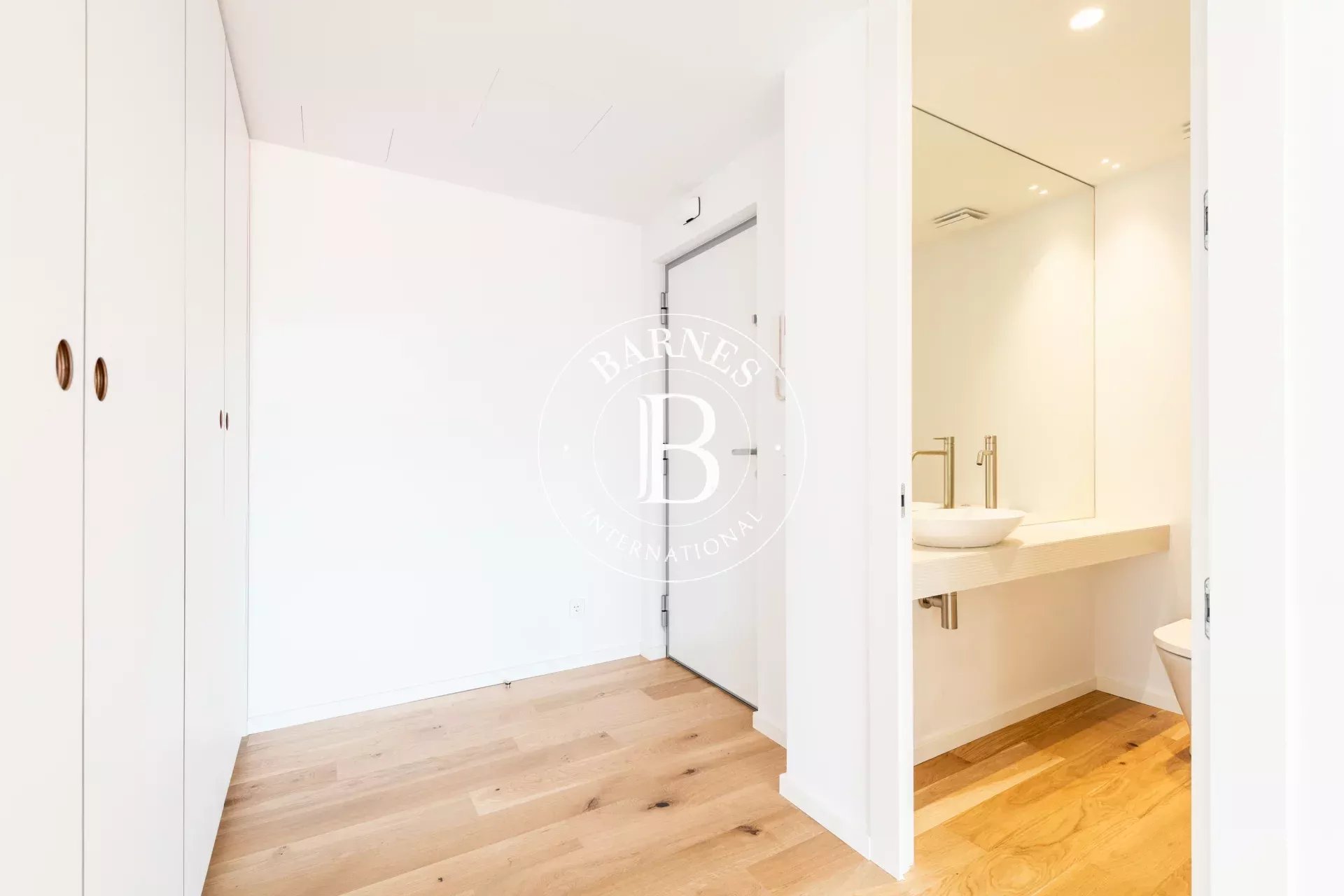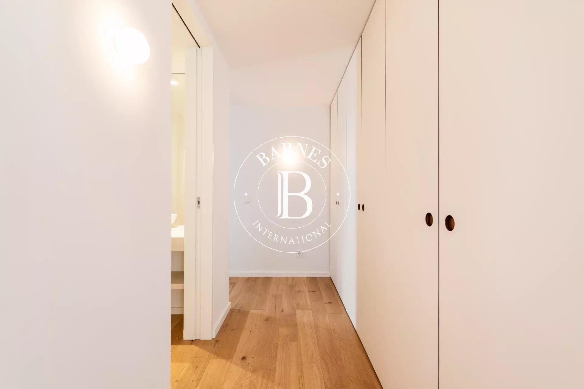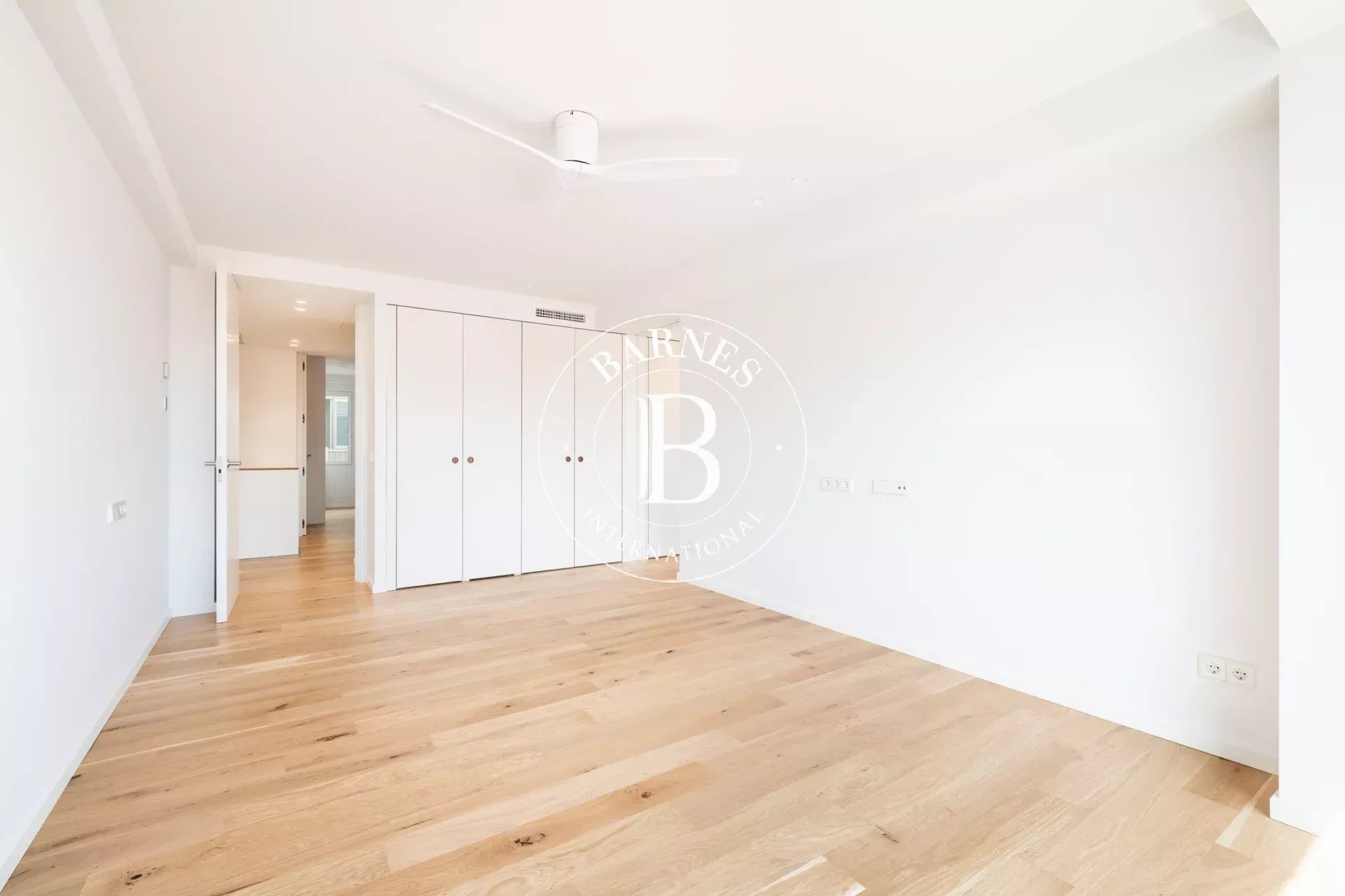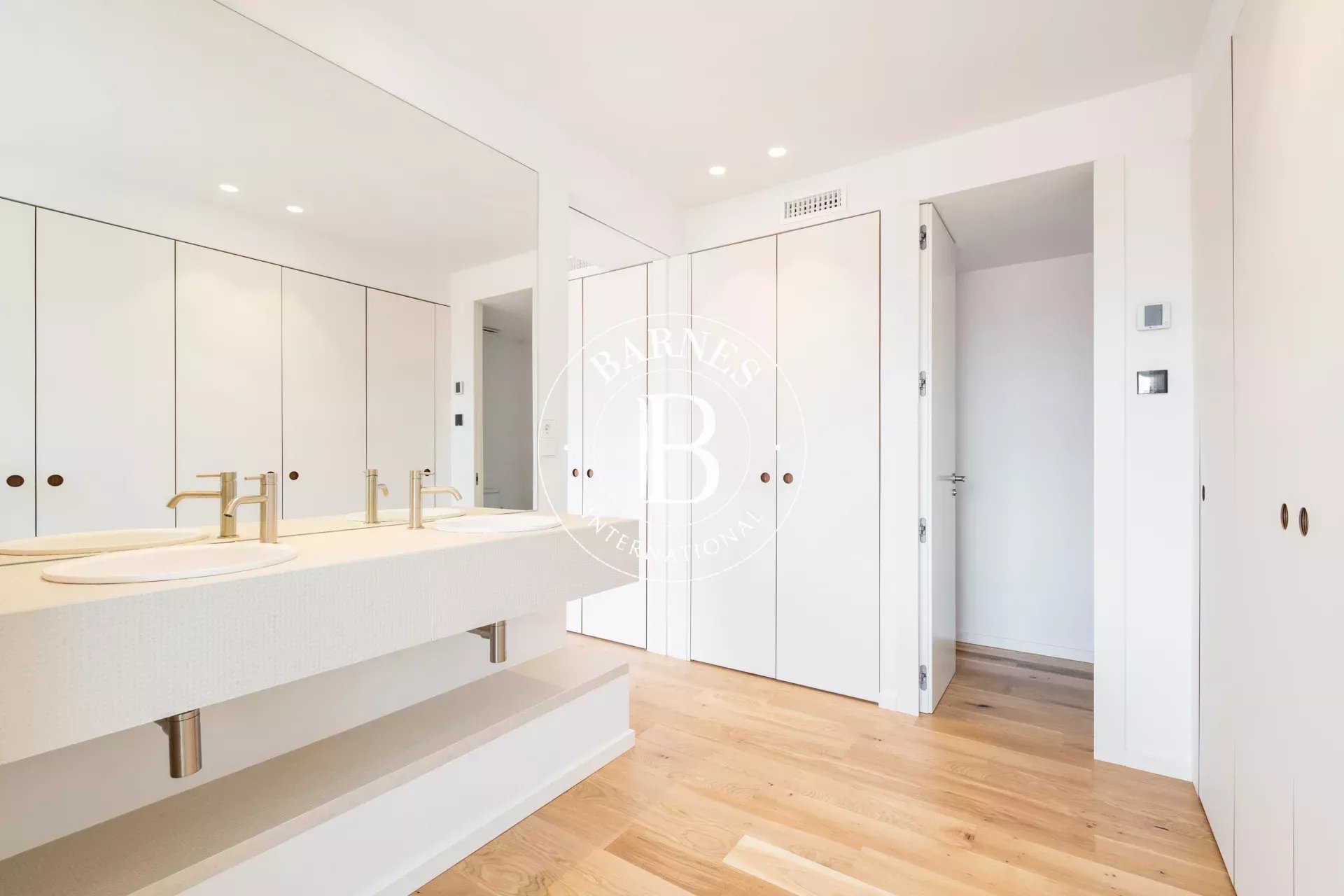 La cocina, completamente integrada en las zonas comunes, presenta un diseño contemporáneo que combina acero inoxidable y madera oscura, aportando elegancia y funcionalidad al conjunto. La zona principal de la vivienda destaca por su privacidad y luminosidad: el dormitorio principal dispone de un amplio vestidor y baño en suite, ambos con ventanas exteriores orientadas al sur y sin vecinos enfrente, garantizando luz natural y tranquilidad durante todo el año.