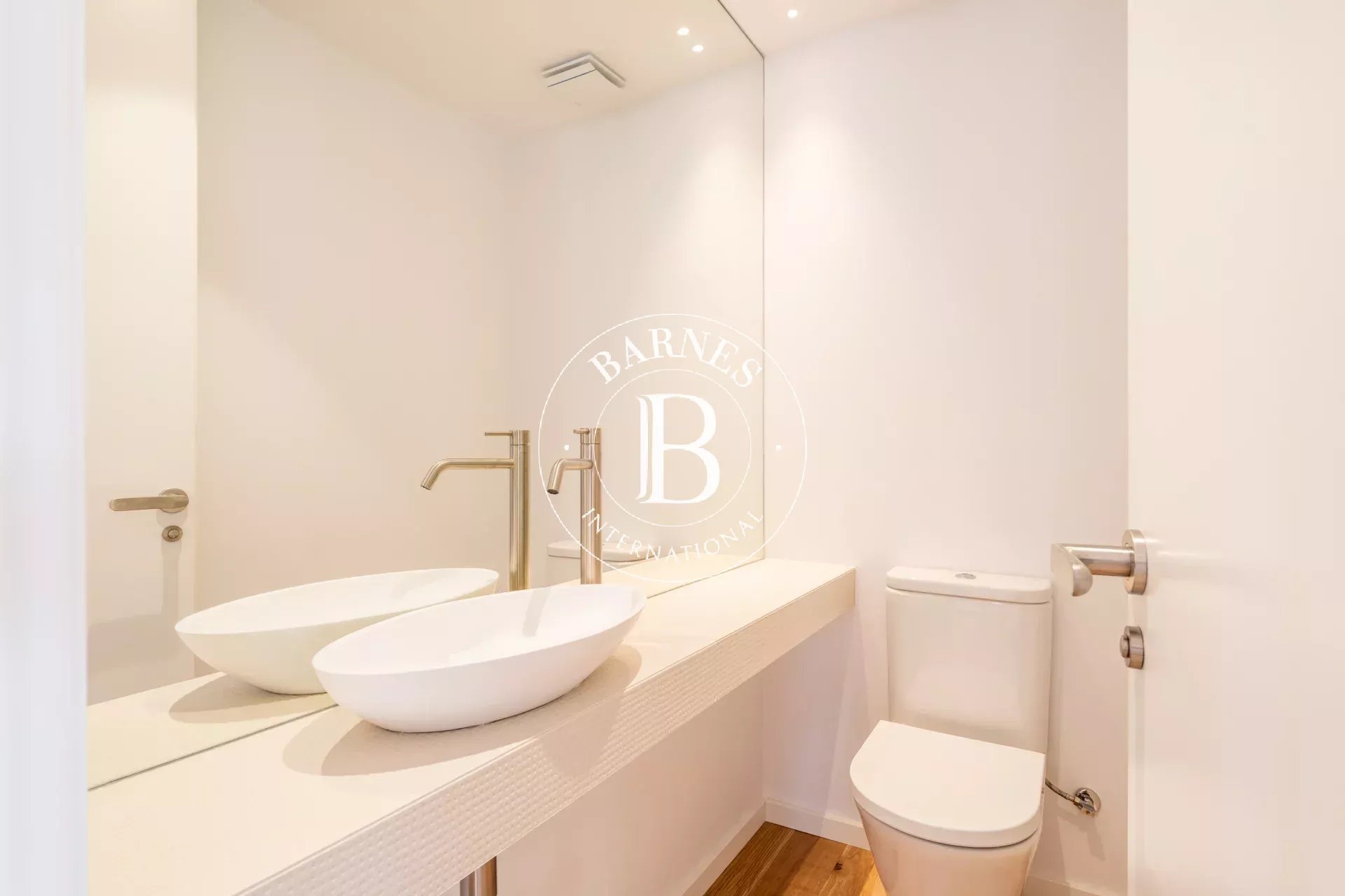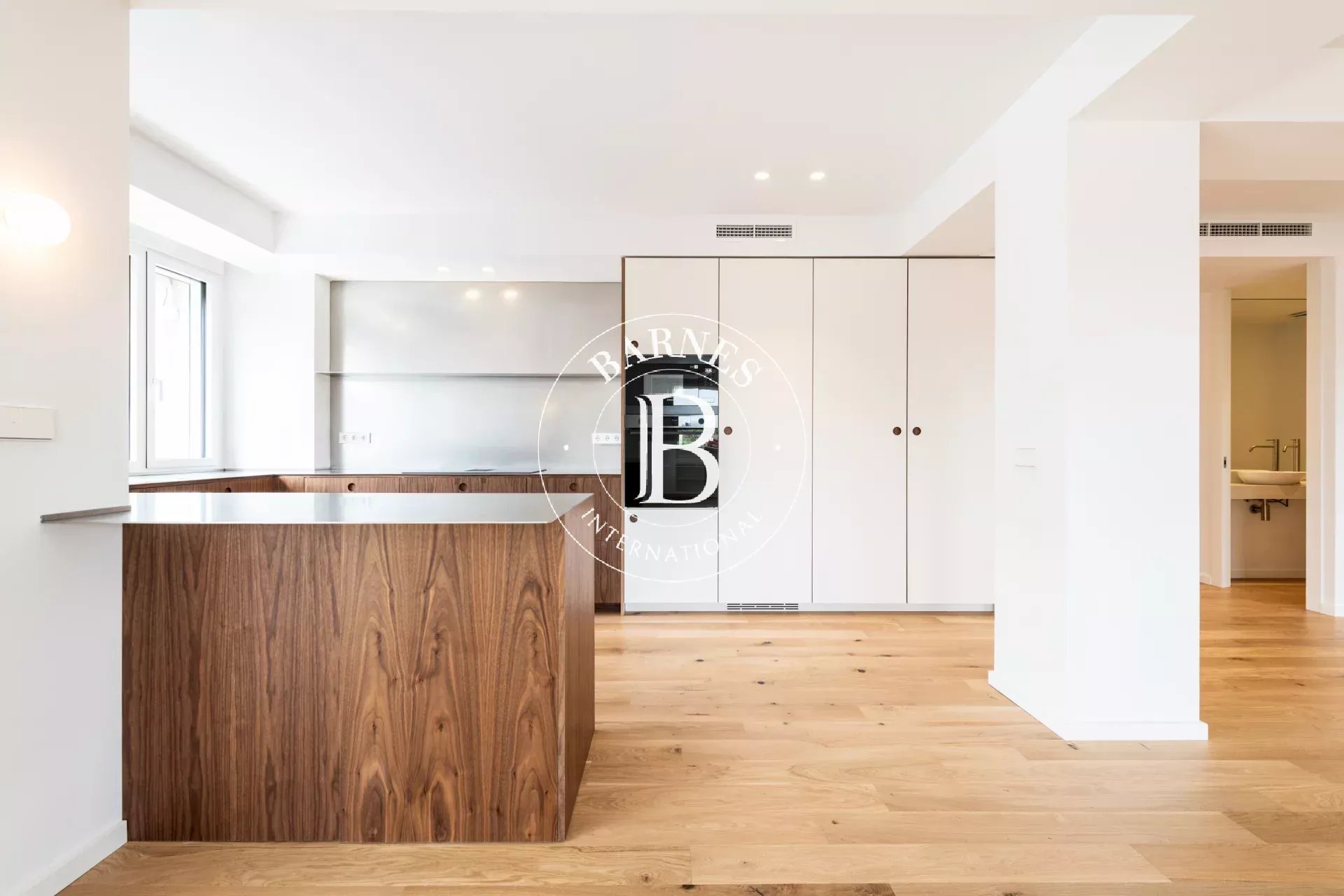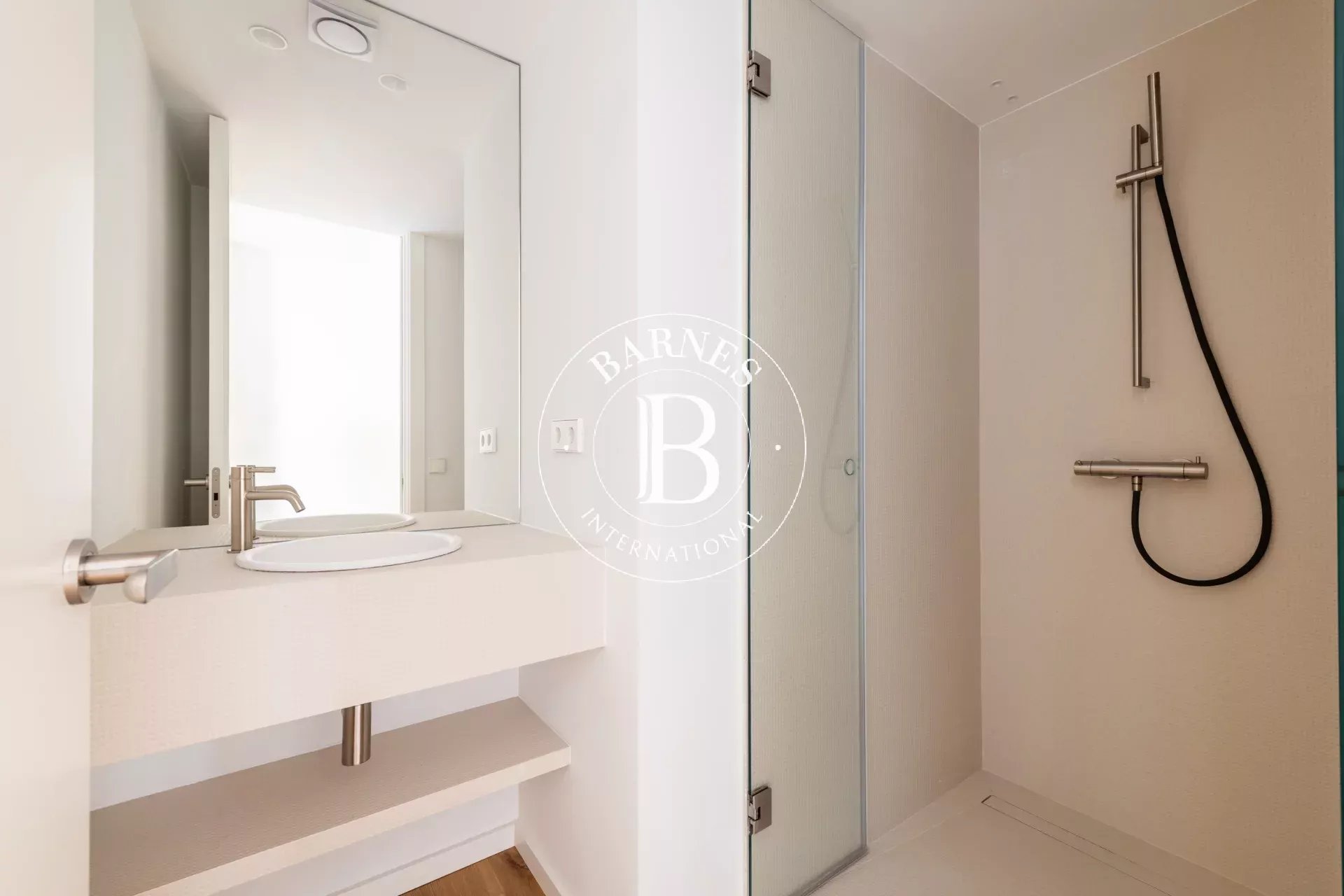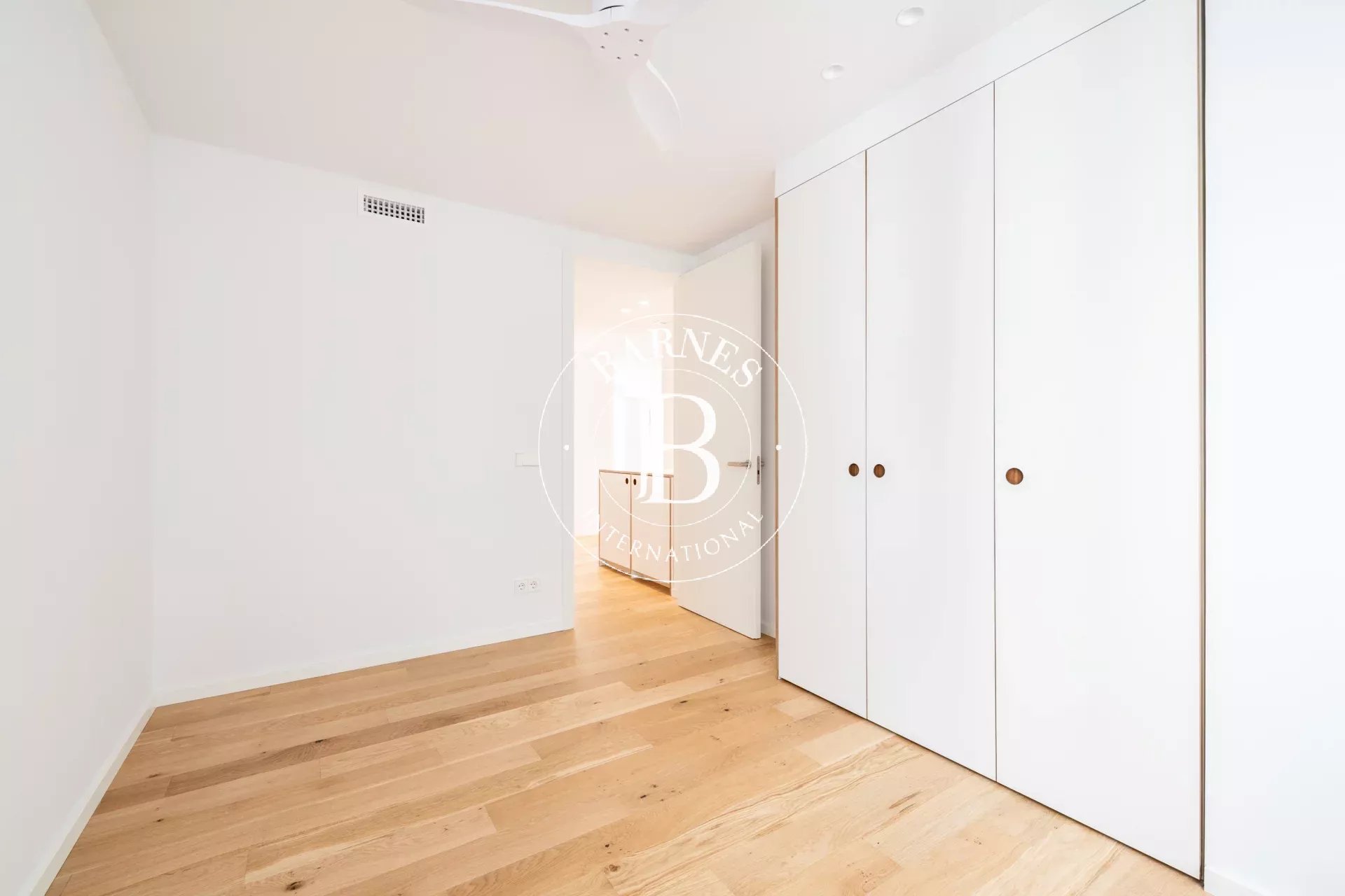 La cocina, completamente integrada en las zonas comunes, presenta un diseño contemporáneo que combina acero inoxidable y madera oscura, aportando elegancia y funcionalidad al conjunto. La zona principal de la vivienda destaca por su privacidad y luminosidad: el dormitorio principal dispone de un amplio vestidor y baño en suite, ambos con ventanas exteriores orientadas al sur y sin vecinos enfrente, garantizando luz natural y tranquilidad durante todo el año.