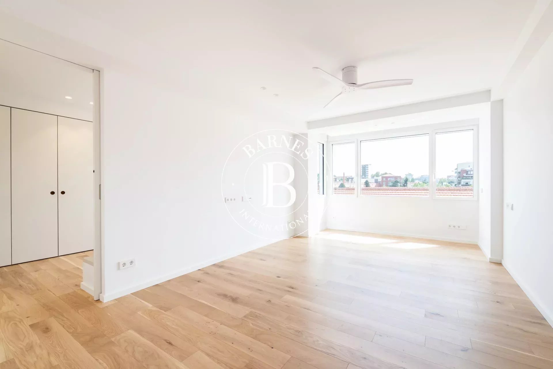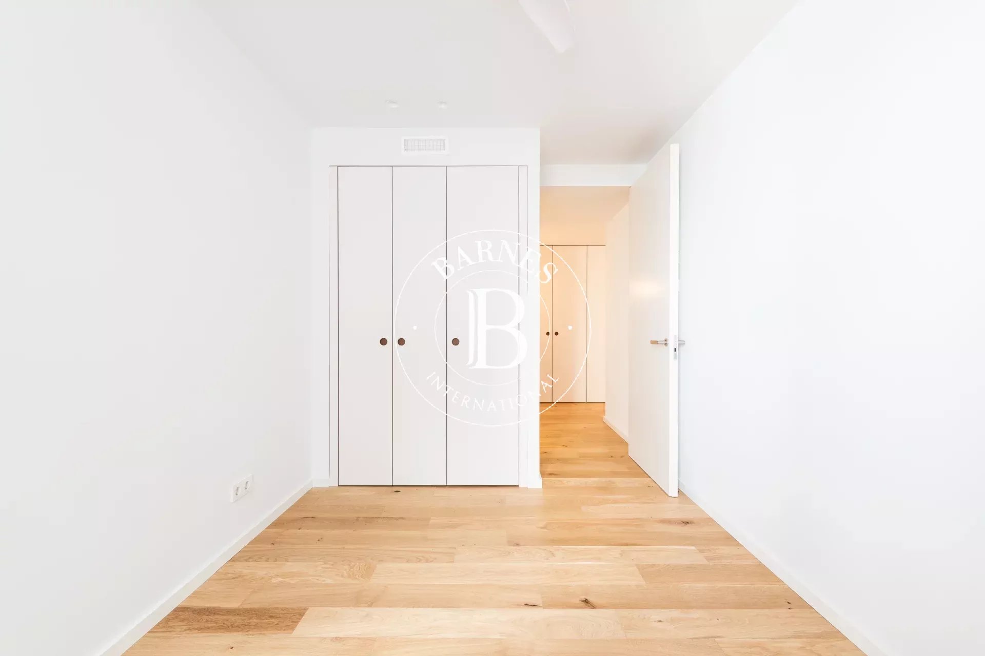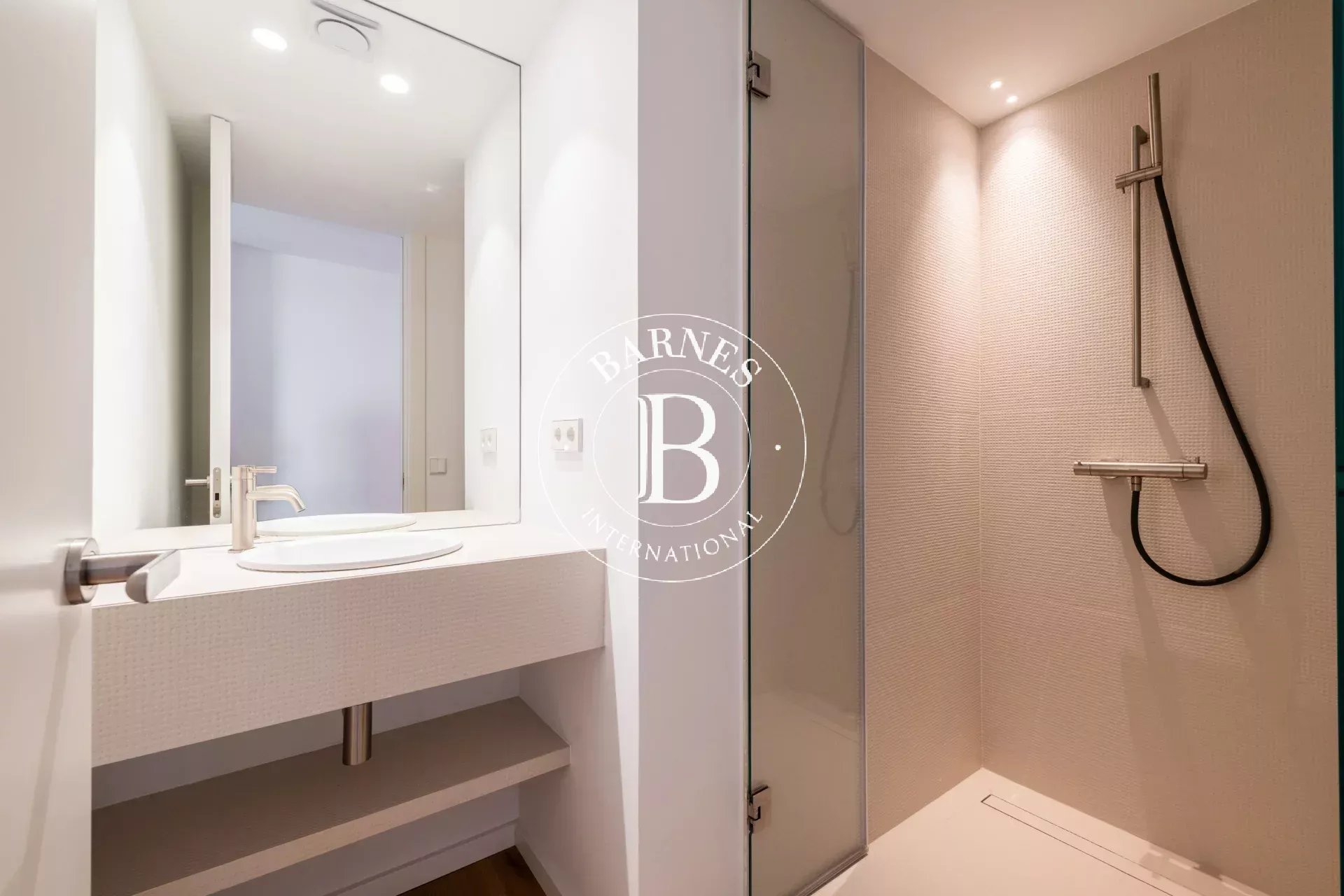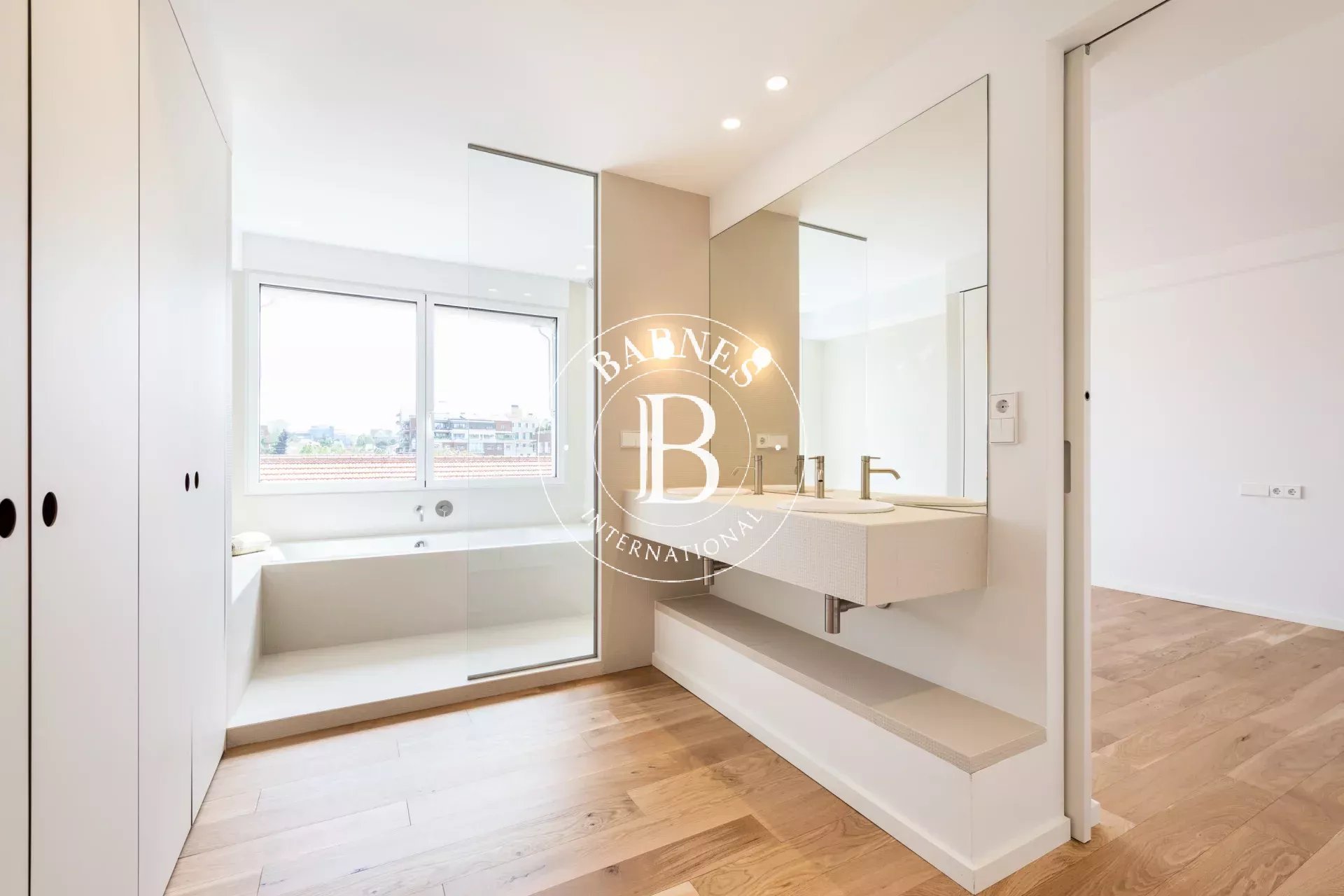 La cocina, completamente integrada en las zonas comunes, presenta un diseño contemporáneo que combina acero inoxidable y madera oscura, aportando elegancia y funcionalidad al conjunto. La zona principal de la vivienda destaca por su privacidad y luminosidad: el dormitorio principal dispone de un amplio vestidor y baño en suite, ambos con ventanas exteriores orientadas al sur y sin vecinos enfrente, garantizando luz natural y tranquilidad durante todo el año.
