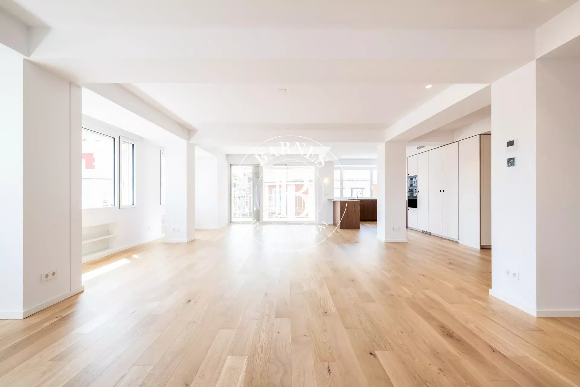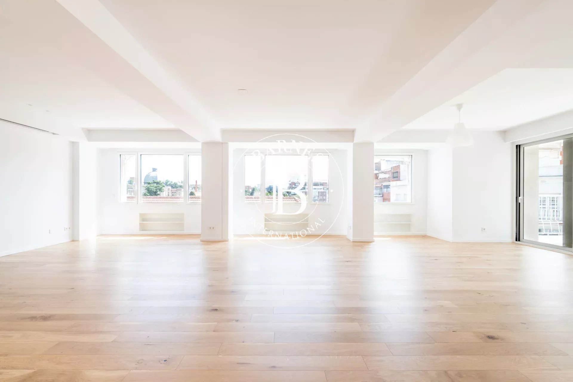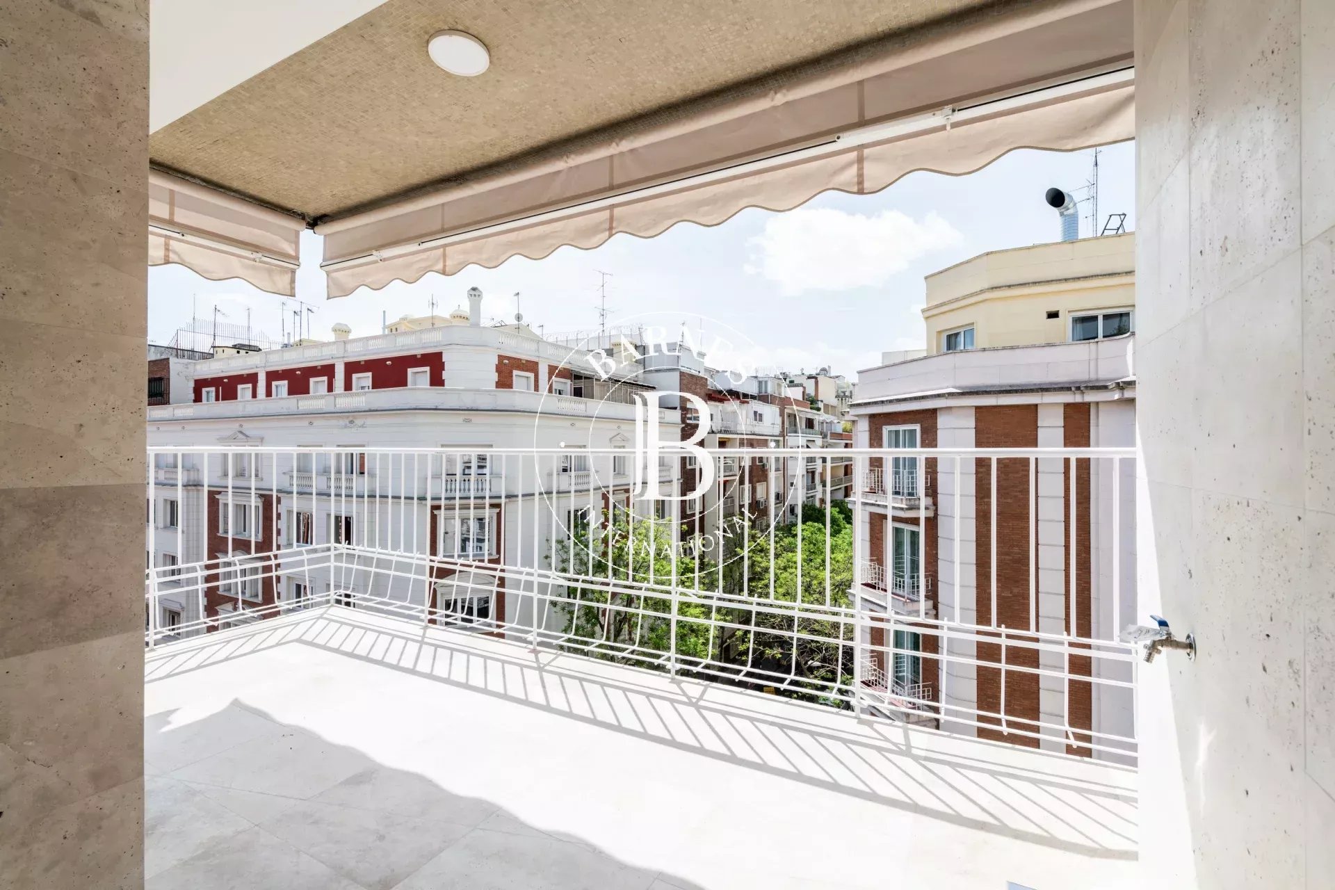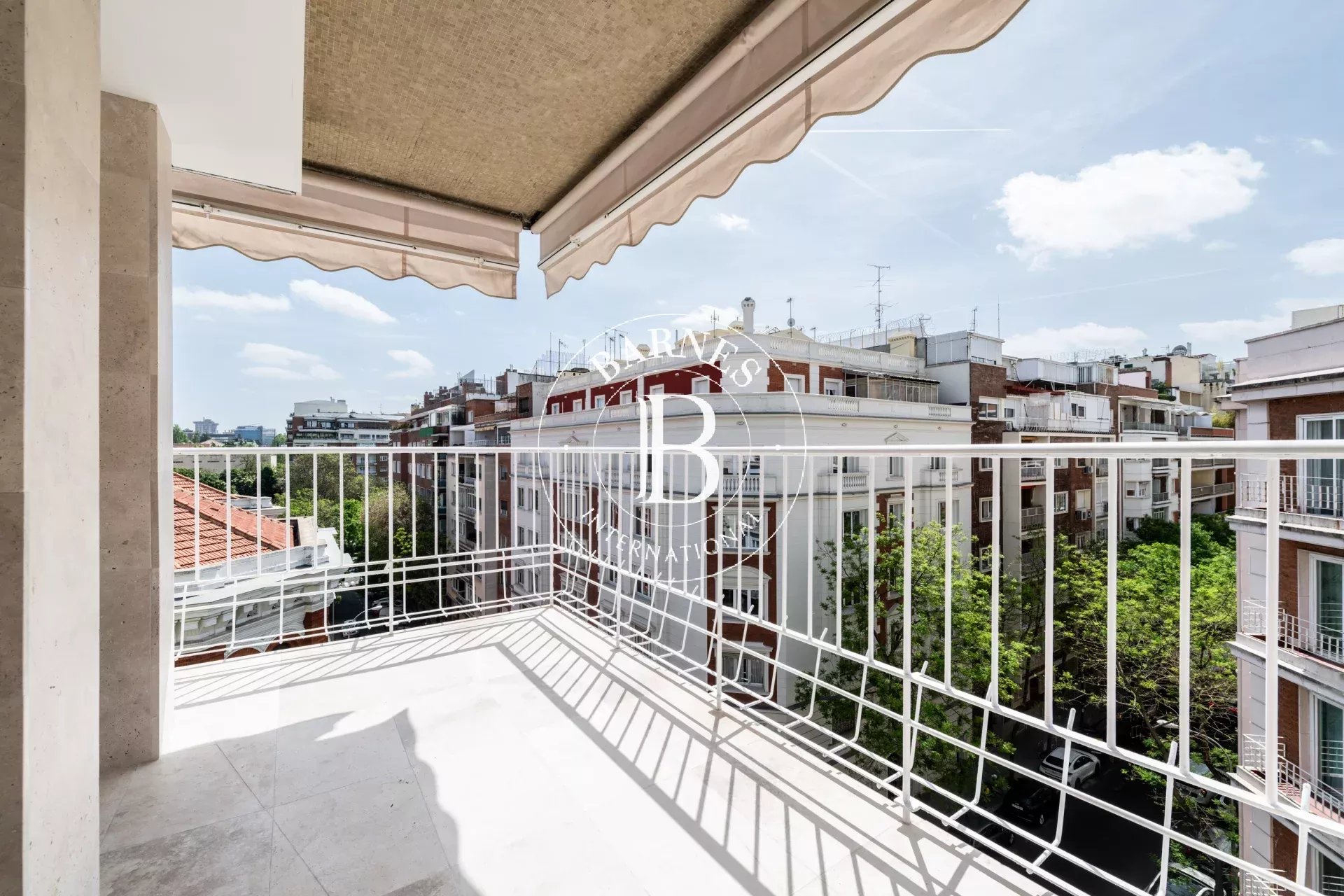 El gran salón-comedor disfruta de una magnífica orientación sur por una de sus fachadas y orientación oeste por la otra, permitiendo una extraordinaria entrada de luz natural durante todo el día. Ambas fachadas cuentan con toldos eléctricos, mientras que la amplia terraza — perfecta para una mesa de hasta seis comensales — ofrece un espacio ideal para disfrutar del skyline madrileño y de los atardeceres sobre los tejados de la capital.